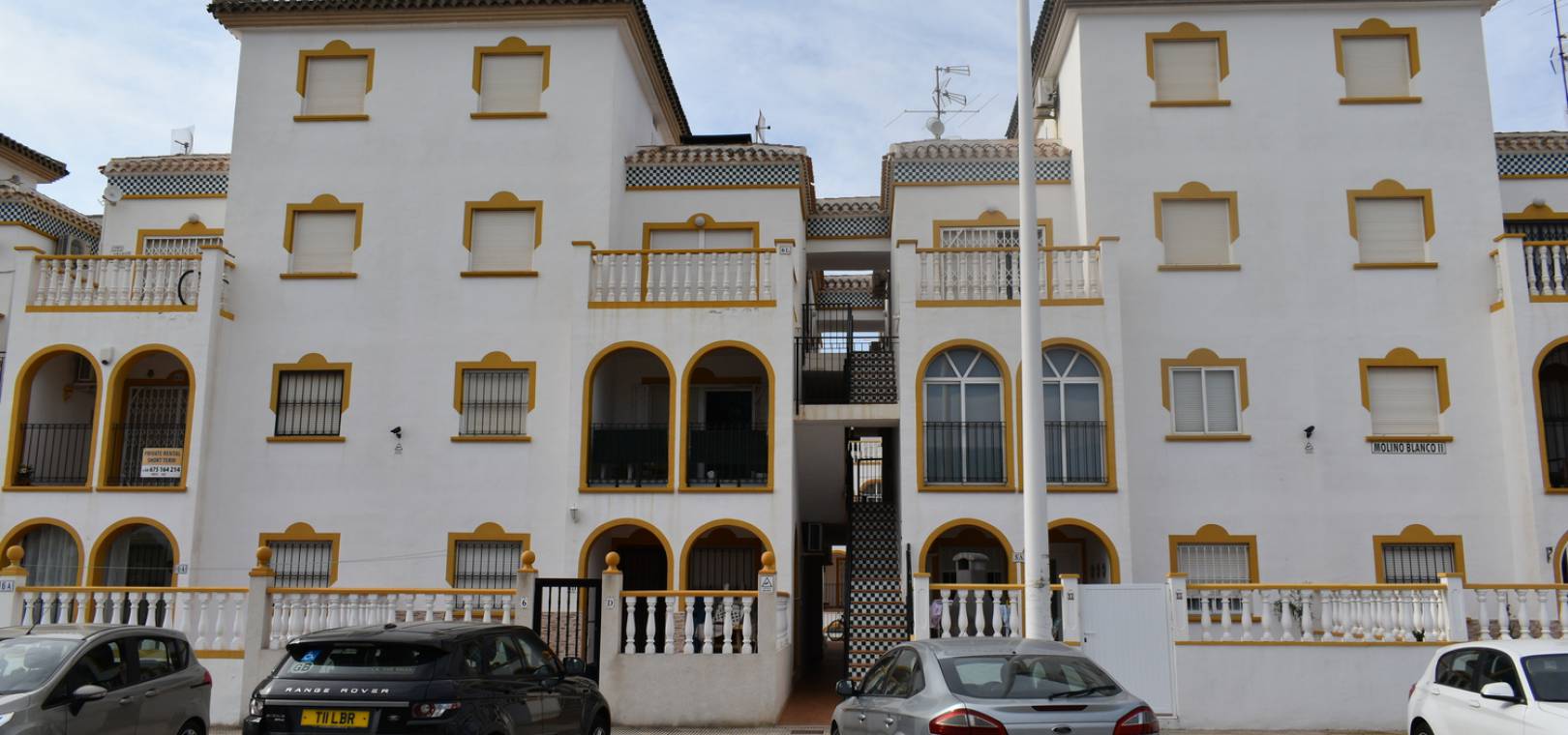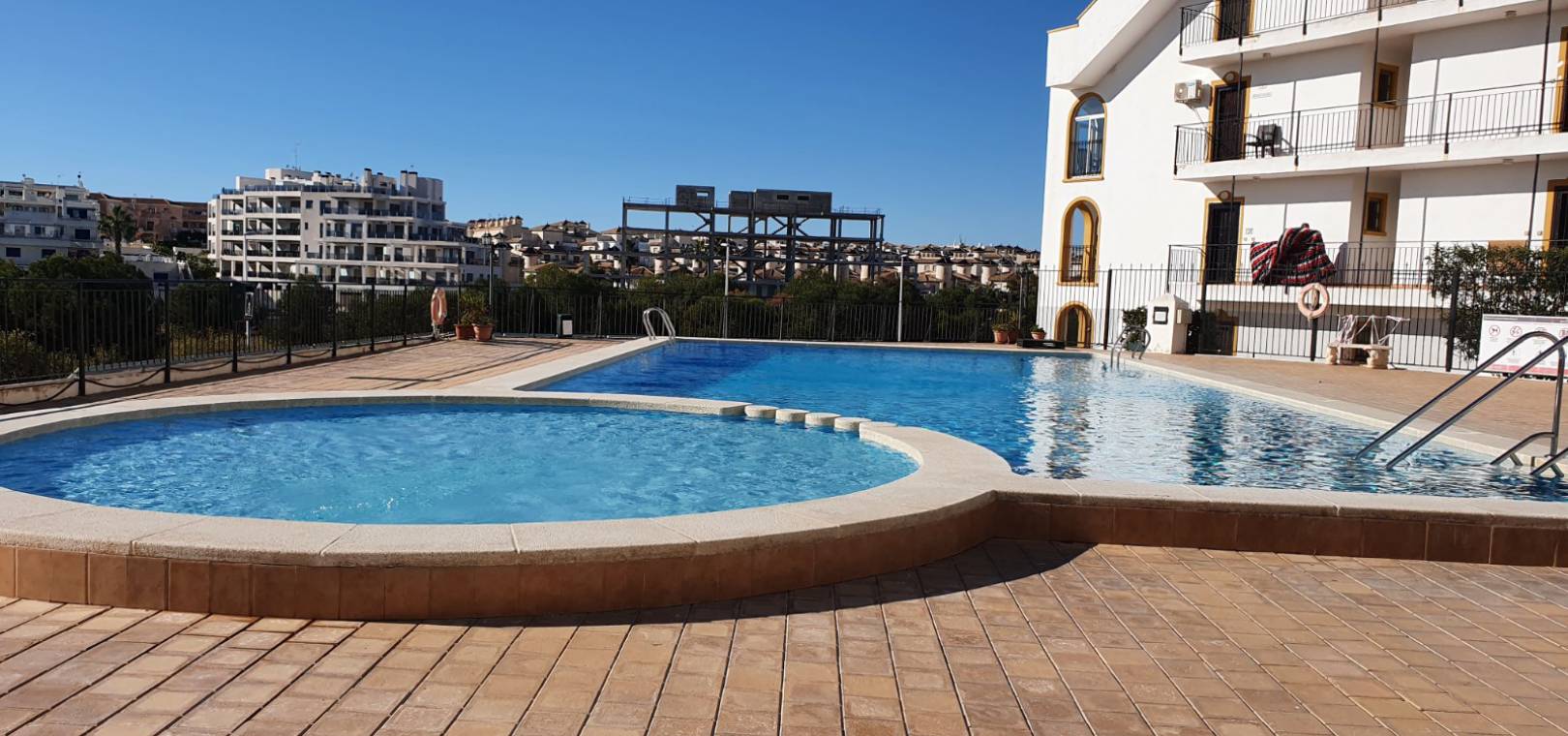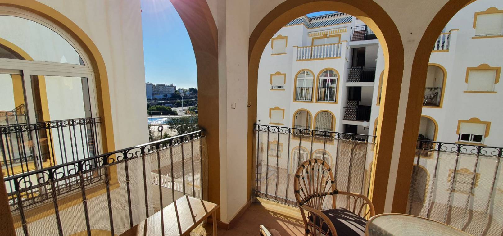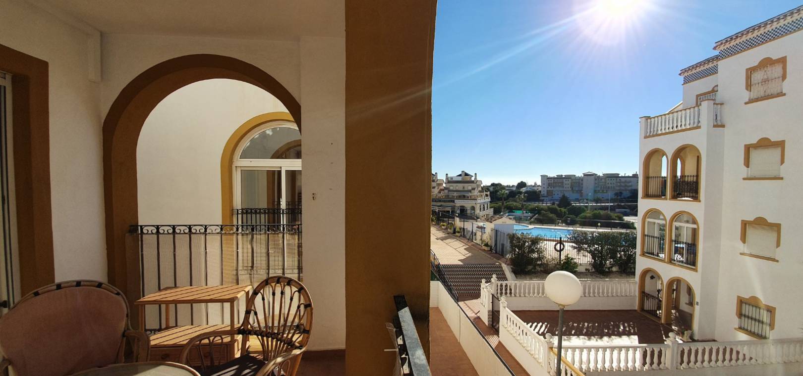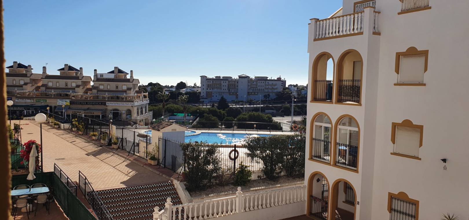 Eine nach Süden ausgerichtete 2-Bett-1-Bad-Wohnung im 1. Stock mit einer Touristenlizenz und einem seitlichen Blick auf den Gemeinschaftspool in Res. Molino Blanco, La Zenia, Costa Blanca.