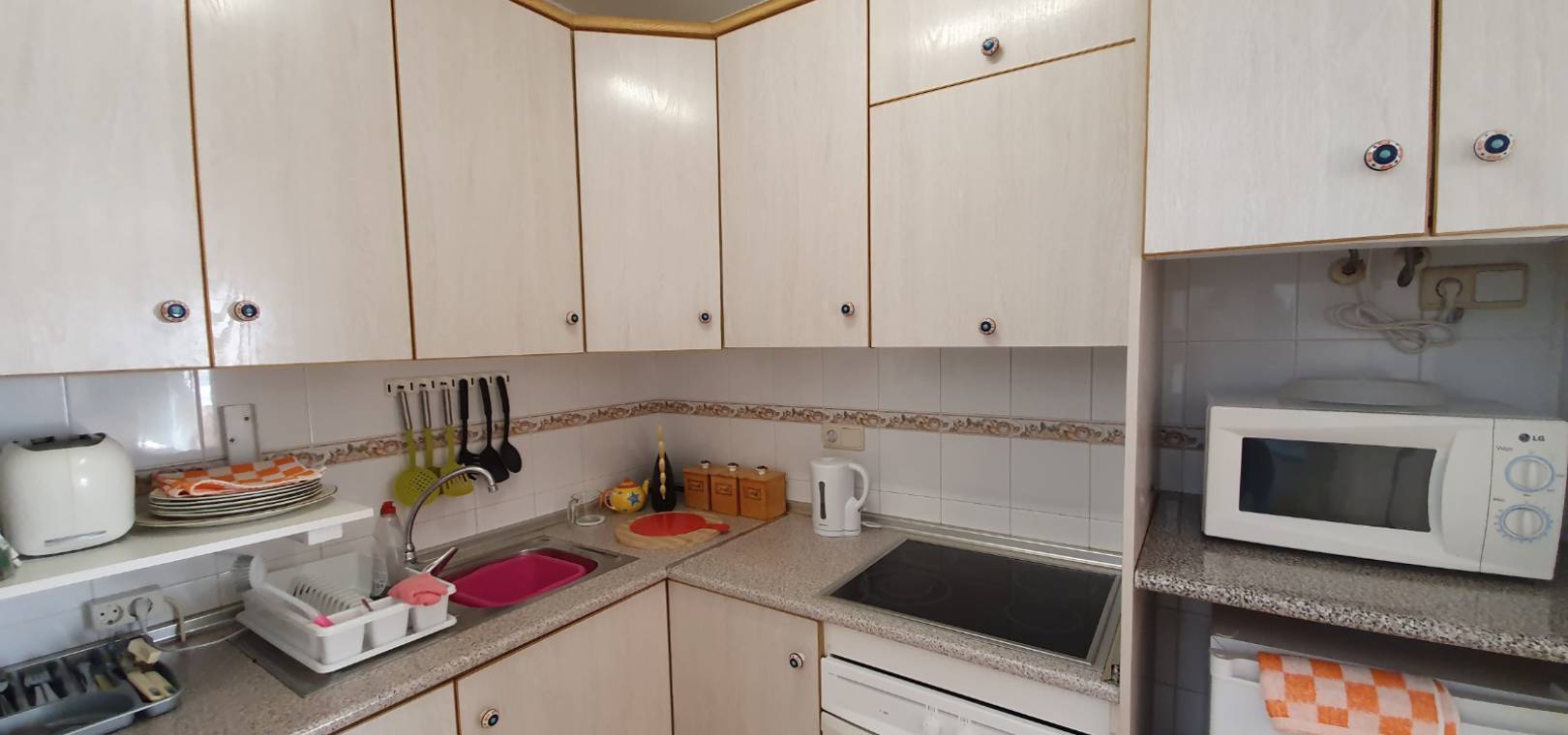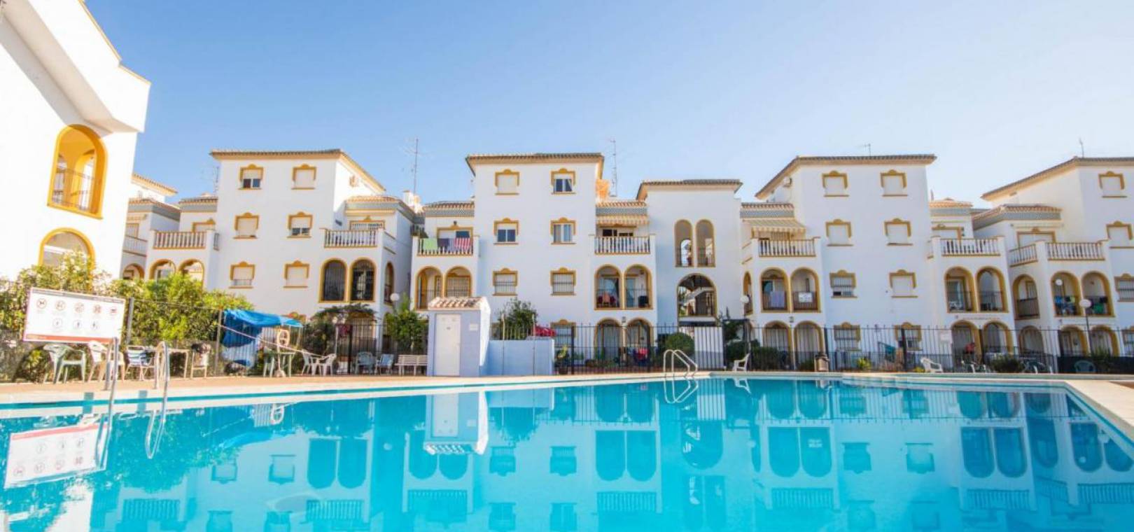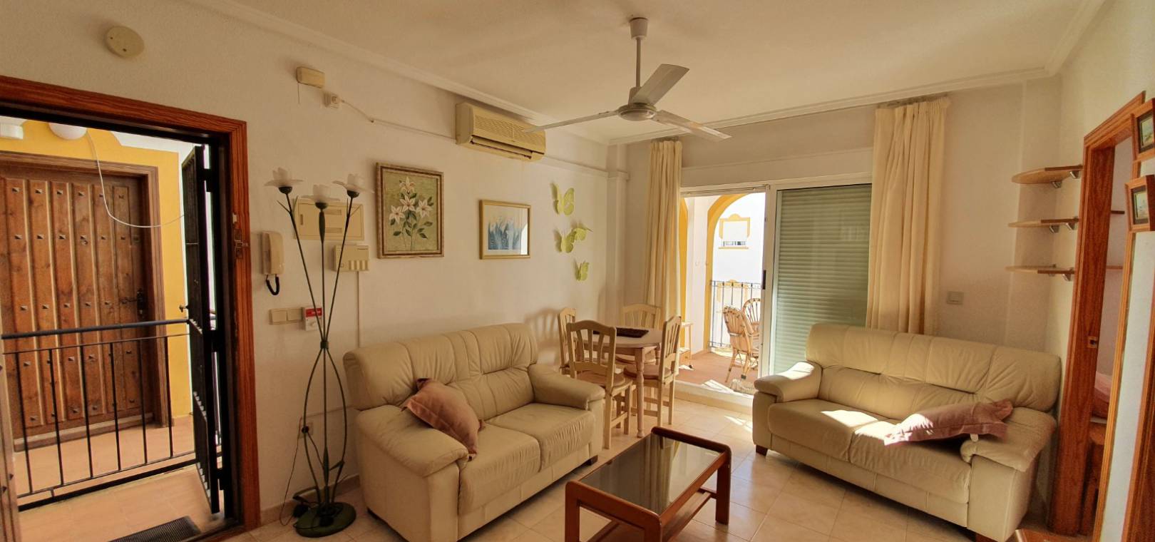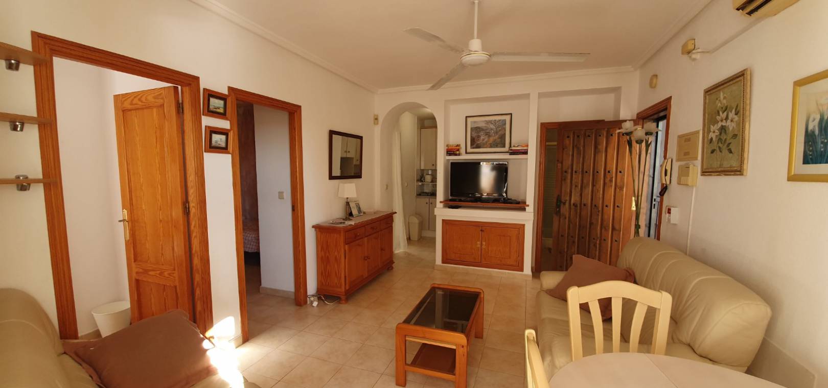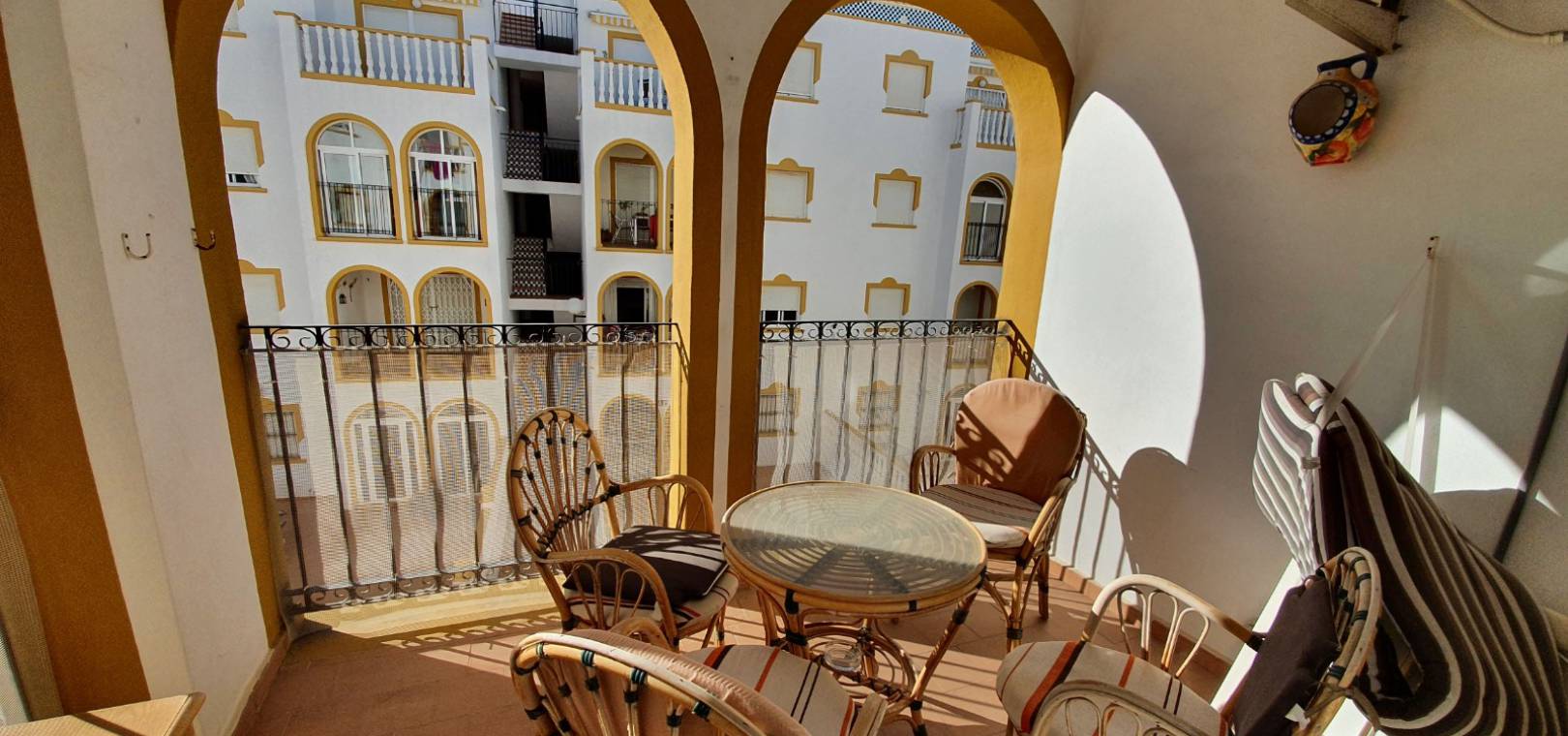 Eine nach Süden ausgerichtete 2-Bett-1-Bad-Wohnung im 1. Stock mit einer Touristenlizenz und einem seitlichen Blick auf den Gemeinschaftspool in Res. Molino Blanco, La Zenia, Costa Blanca.