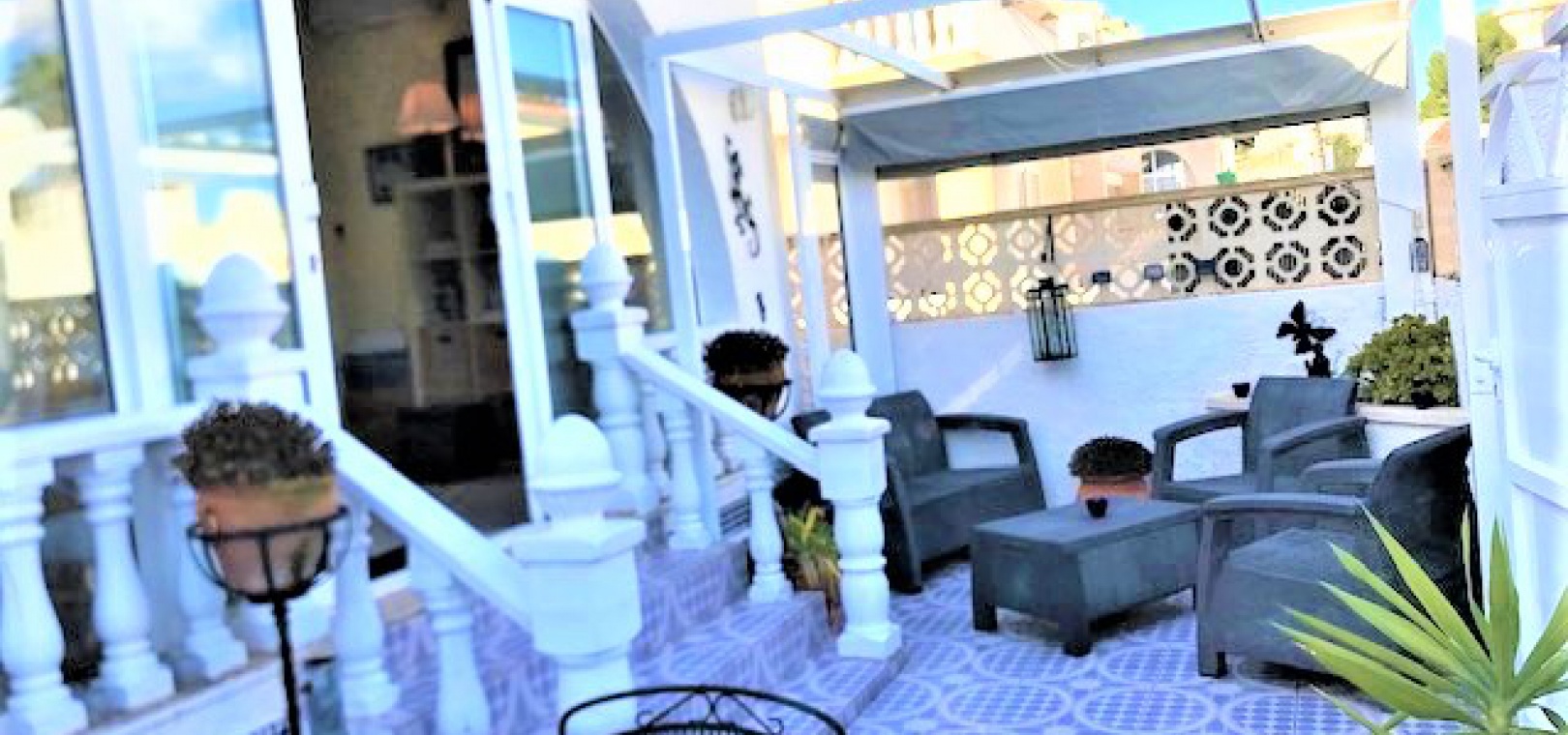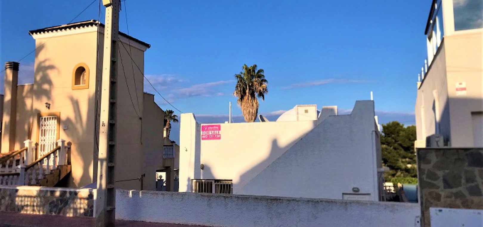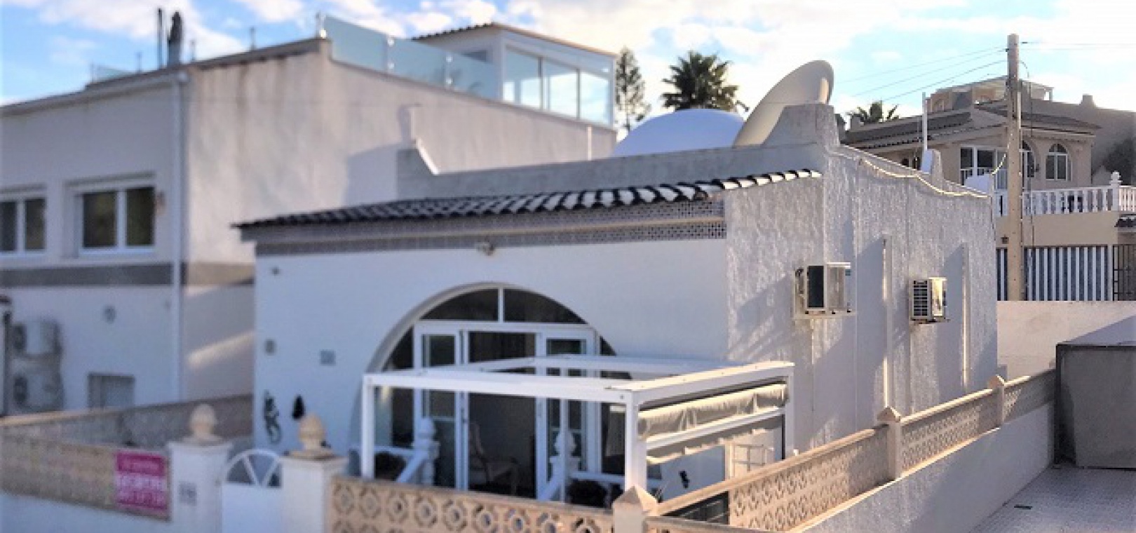 Eine kleine freistehende Villa mit 2 Schlafzimmern und 1 Bad und einem privaten Solarium auf dem Dach in Blue Lagoon, Villamartin, Costa Blanca South.
