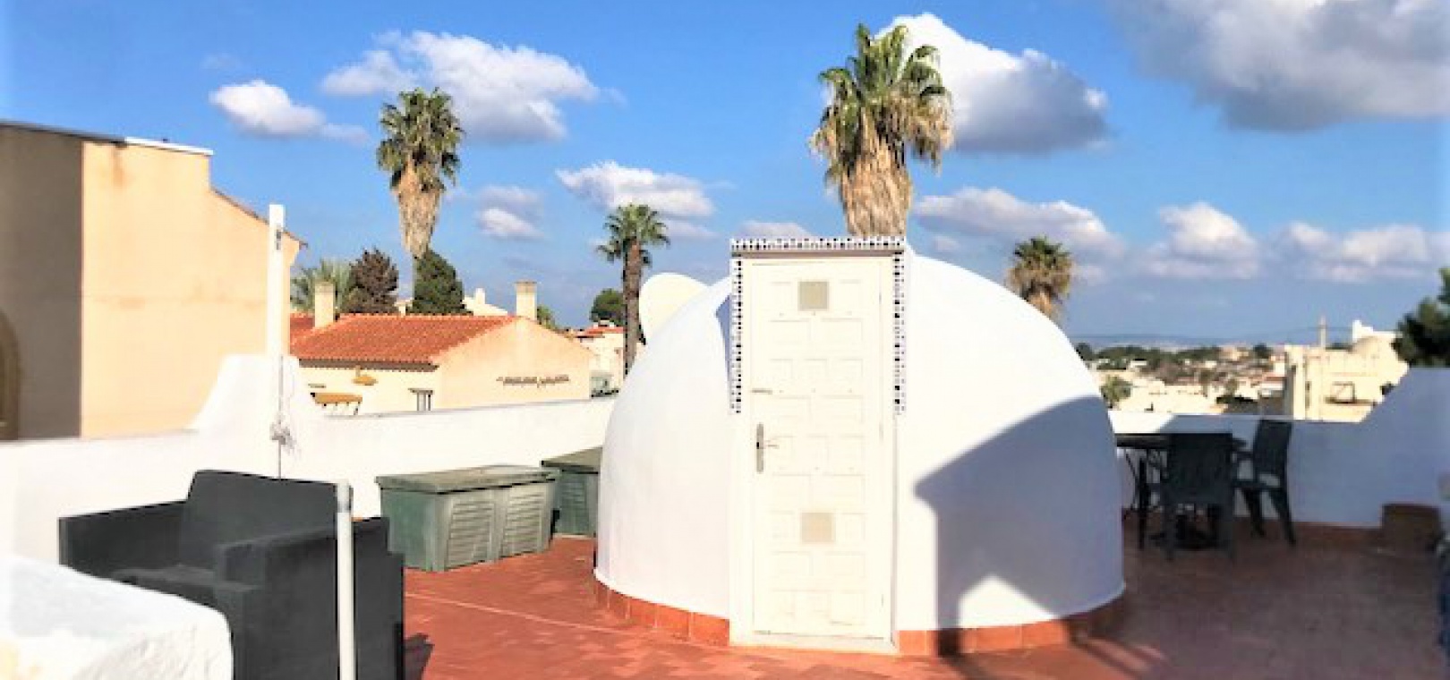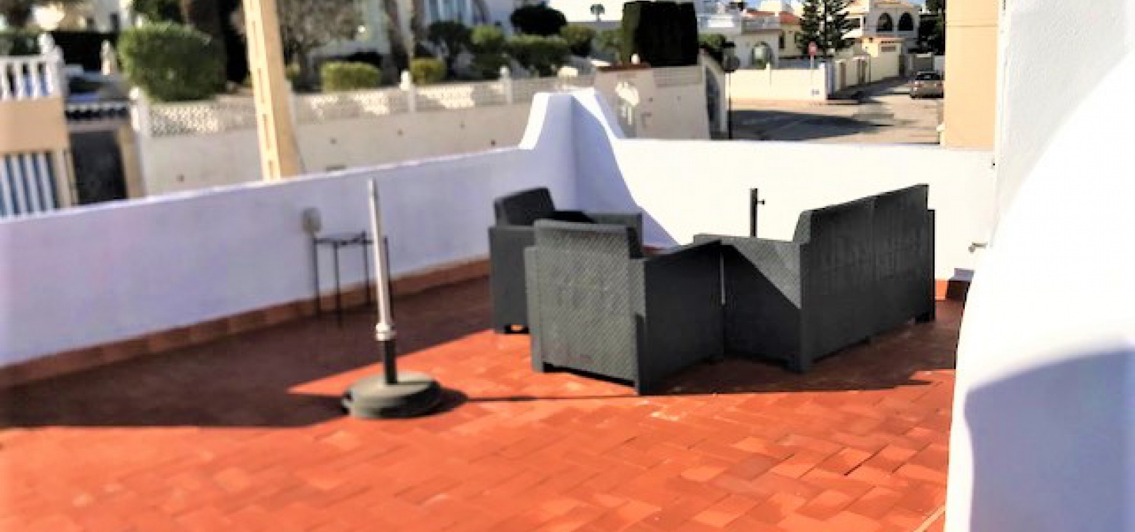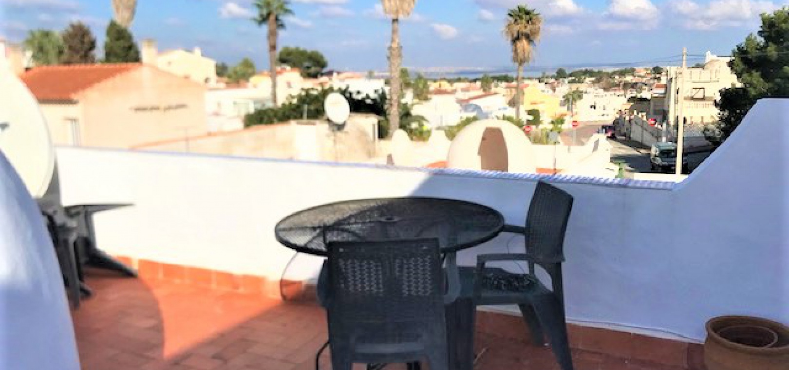 Draußen gibt es einen gefliesten Garten mit Treppe zum großen privaten Solarium auf dem Dach, das einen Abstellraum und einen herrlichen Blick über die Umgebung und hinunter zum Meer hat.