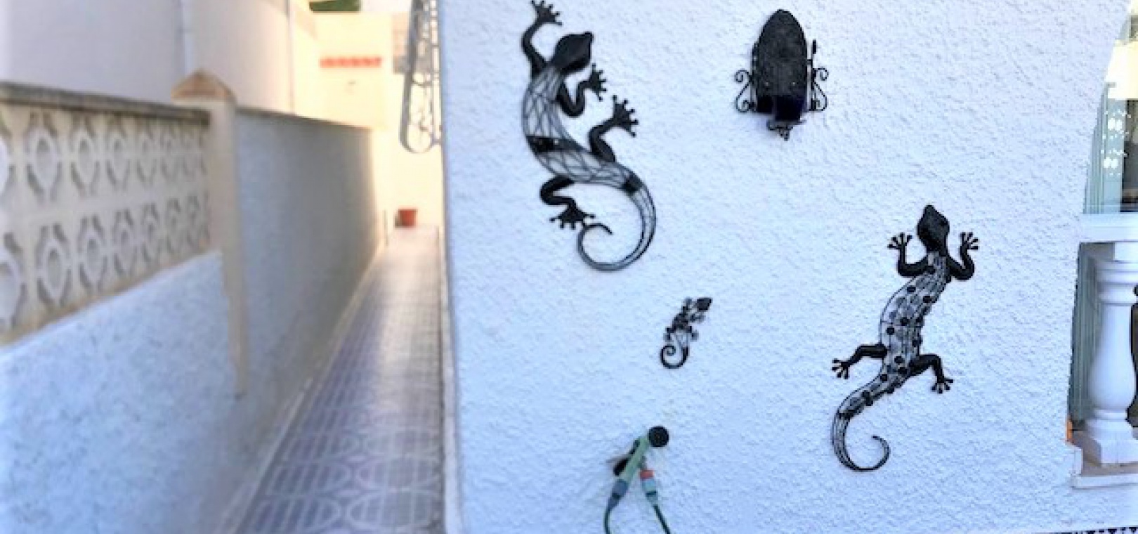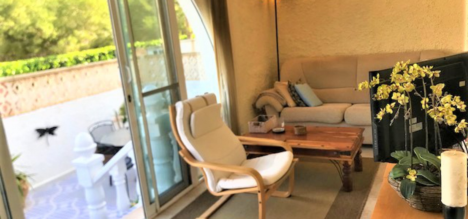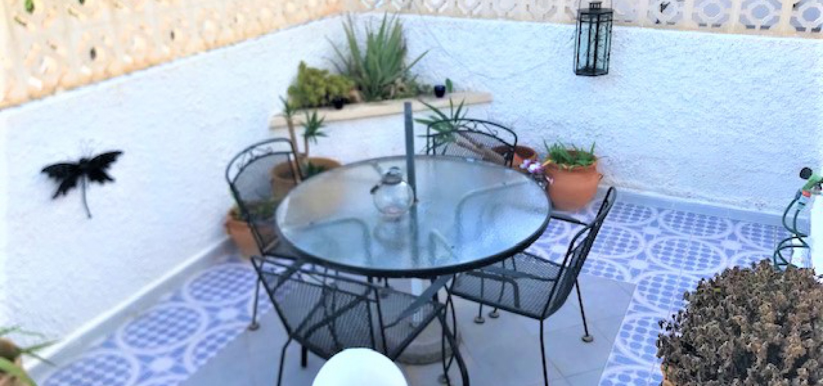 Draußen gibt es einen gefliesten Garten mit Treppe zum großen privaten Solarium auf dem Dach, das einen Abstellraum und einen herrlichen Blick über die Umgebung und hinunter zum Meer hat.