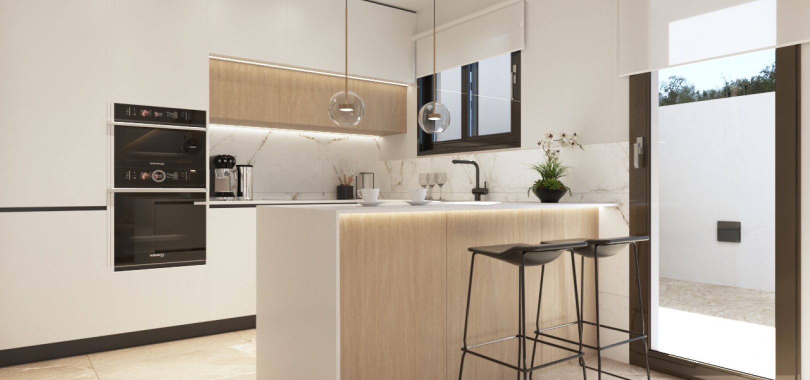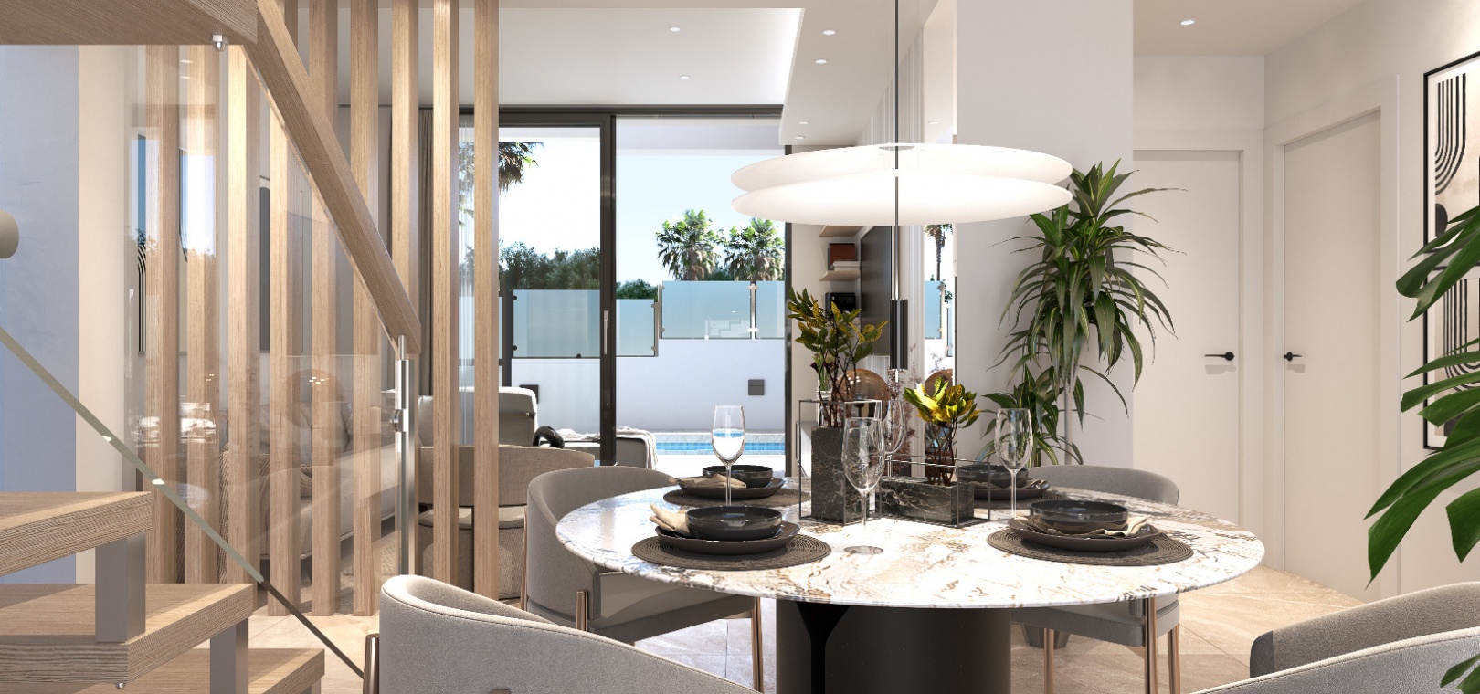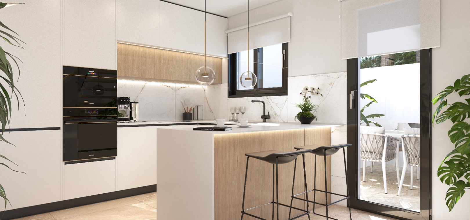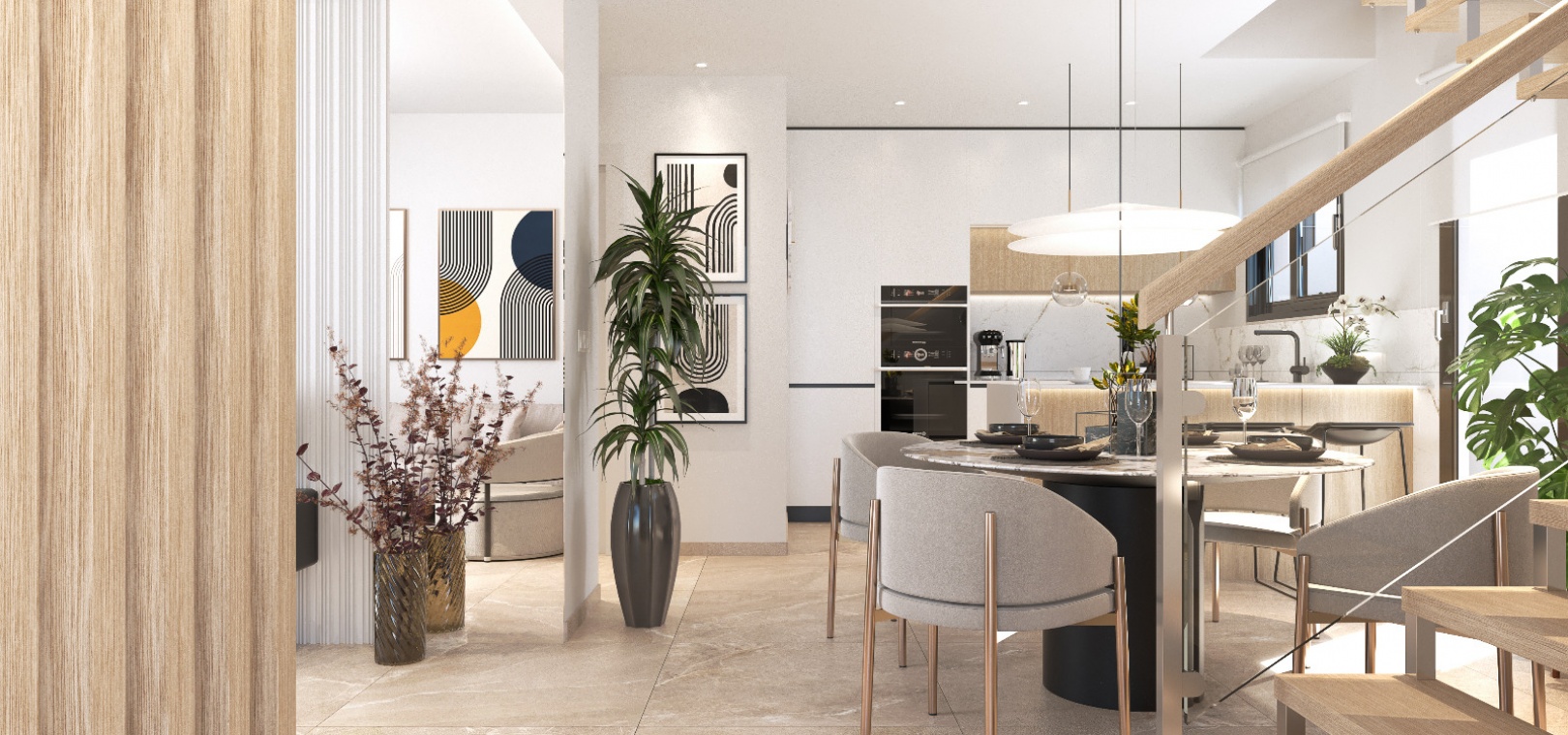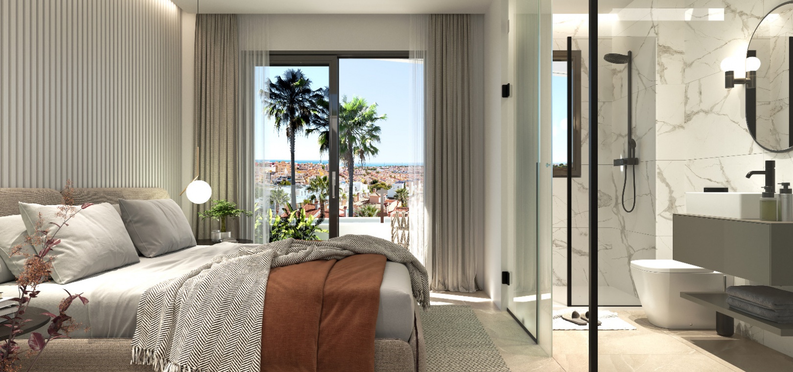 Diese Eigenschaften bieten eine voll ausgestattete moderne Küche, einen geräumigen und hellen Wohn-/Essbereich, 3 x Schlafzimmer, das Hauptschlafzimmer hat ein eigenes Badezimmer mit Fußbodenheizung und eigenem Balkon, 2 x Familienbadezimmer und ein großes privates Solarium.