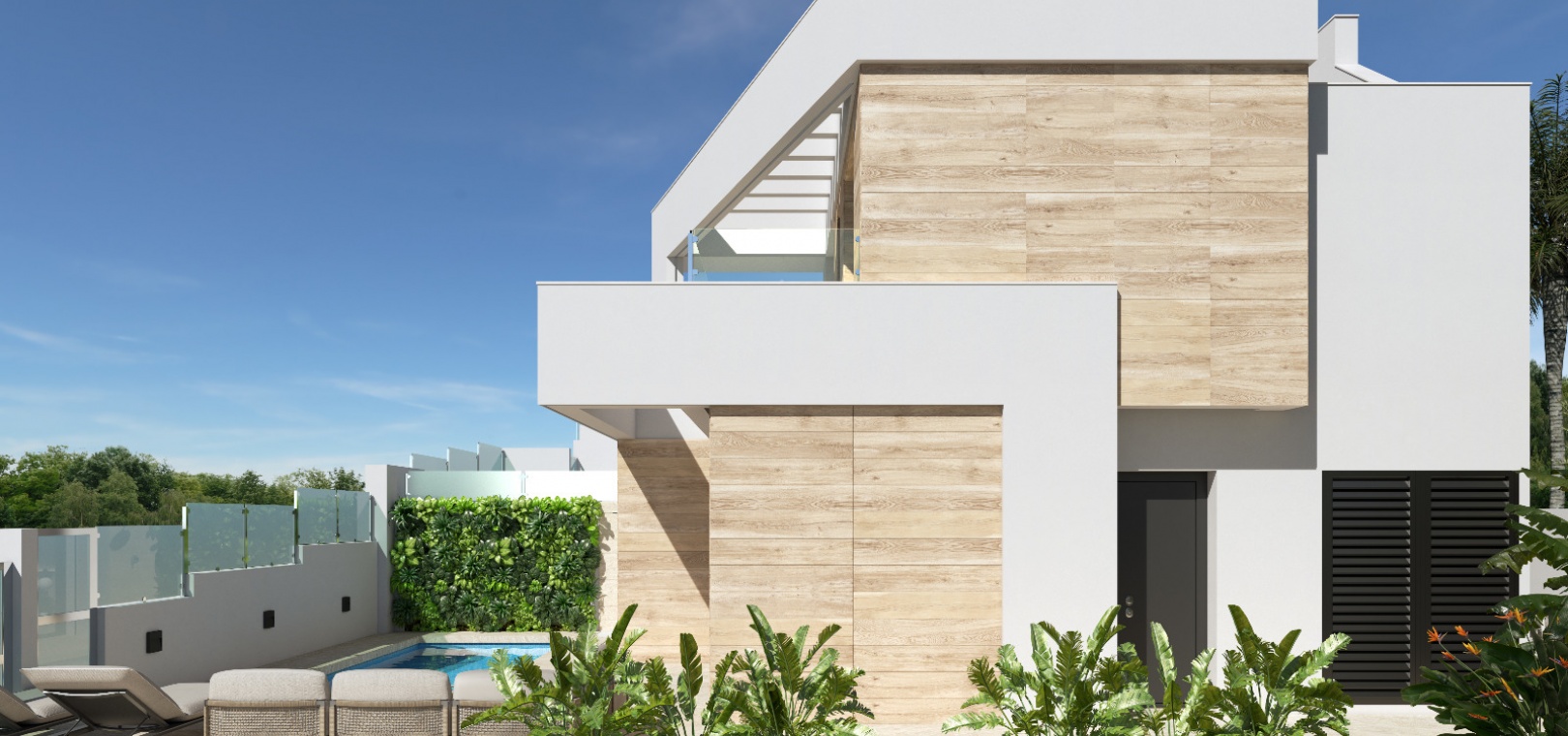Draußen gibt es einen Garten mit einer Einfahrt zum Parken abseits der Straße und einen Platz für das optionale private Schwimmbecken.