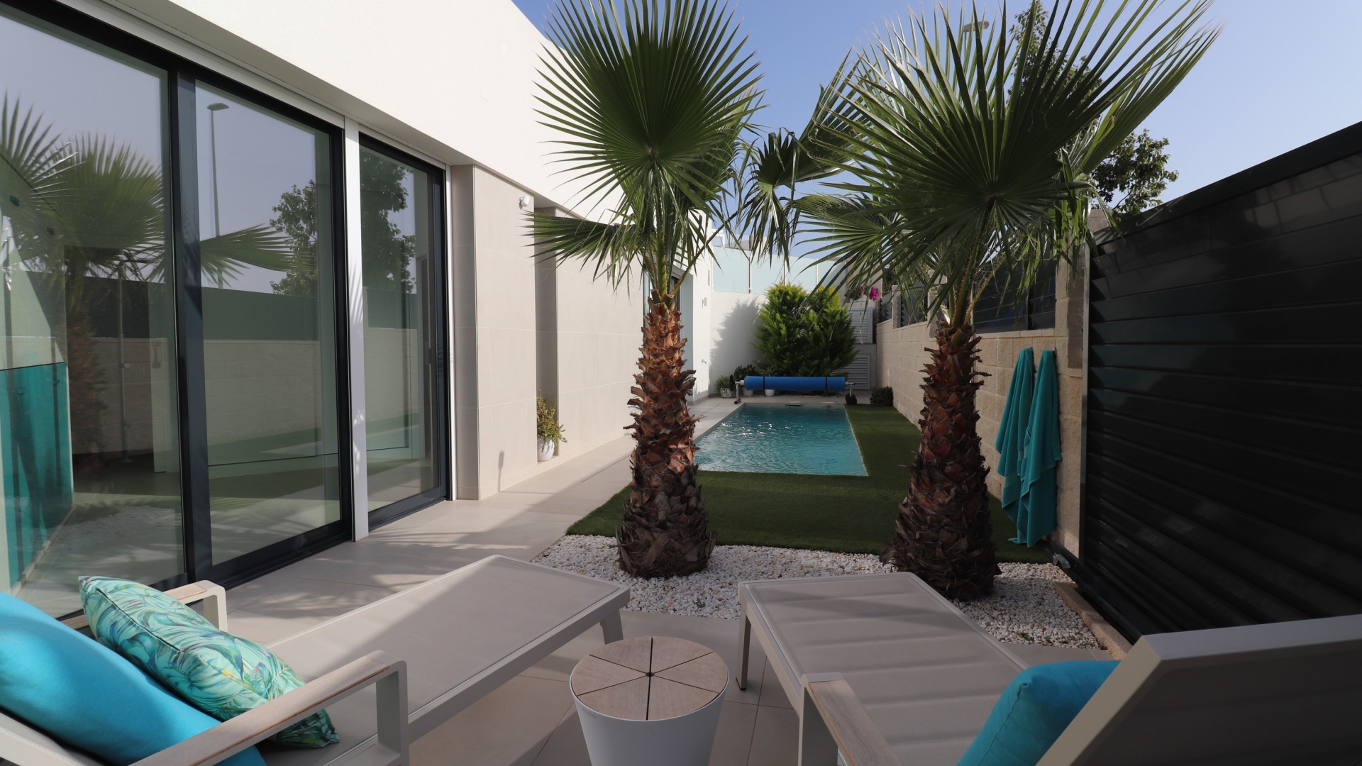 Diese eigenwillige, moderne, nach Südwesten ausgerichtete, freistehende Villa mit drei Schlafzimmern in Benijofar liegt nur wenige Gehminuten von der Haupteinkaufsstraße und dem Stadtzentrum mit all seinen Annehmlichkeiten und Einrichtungen entfernt ... In Benijofar selbst befinden sich Einkaufszentren mit einer Reihe von Bars, Restaurants, Geschäften, Bäckereien, Banken, Apotheken und vielem mehr ... Die wunderschönen mit der Blauen Flagge ausgezeichneten Strände von Guardamar del Segura sind ebenfalls nur 12 Autominuten entfernt! Dieses 2020 erbaute Anwesen ist makellos und atemberaubend, mit einem ungewöhnlichen, aber attraktiven Design, das aus einer offenen, voll ausgestatteten Küche besteht; einem Wohn-/Esszimmer mit Schiebetüren zur sonnendurchfluteten Terrasse vor dem Haus, dem Garten und dem Swimmingpool; zwei Doppelschlafzimmern mit Zugang zu einem Innenhof und einem Hauswirtschafts-/Lagerraum; einem dritten Doppelschlafzimmer mit eigenem Bad und direktem Zugang zu den schönen Vorgärten; und einem Familienduschraum. Draußen gibt es einen angelegten Garten mit Fliesen, Kunstrasen, Palmen und einem privaten, beheizten 2,2 x 7 m großen Swimmingpool sowie die Möglichkeit eines Parkplatzes abseits der Straße über das elektrische Tor. Zu den Extras dieser Immobilie gehören Klappbetten in jedem Schlafzimmer für zusätzlichen Platz außerhalb der Schlafsituation, Klimaanlage im gesamten Gebäude, Jalousien mit Fernbedienung, ein 120-Liter-Warmwasserboiler, Bewässerungssystem im Garten, Alarmsystem und nicht zu vergessen 8 Solarmodule!