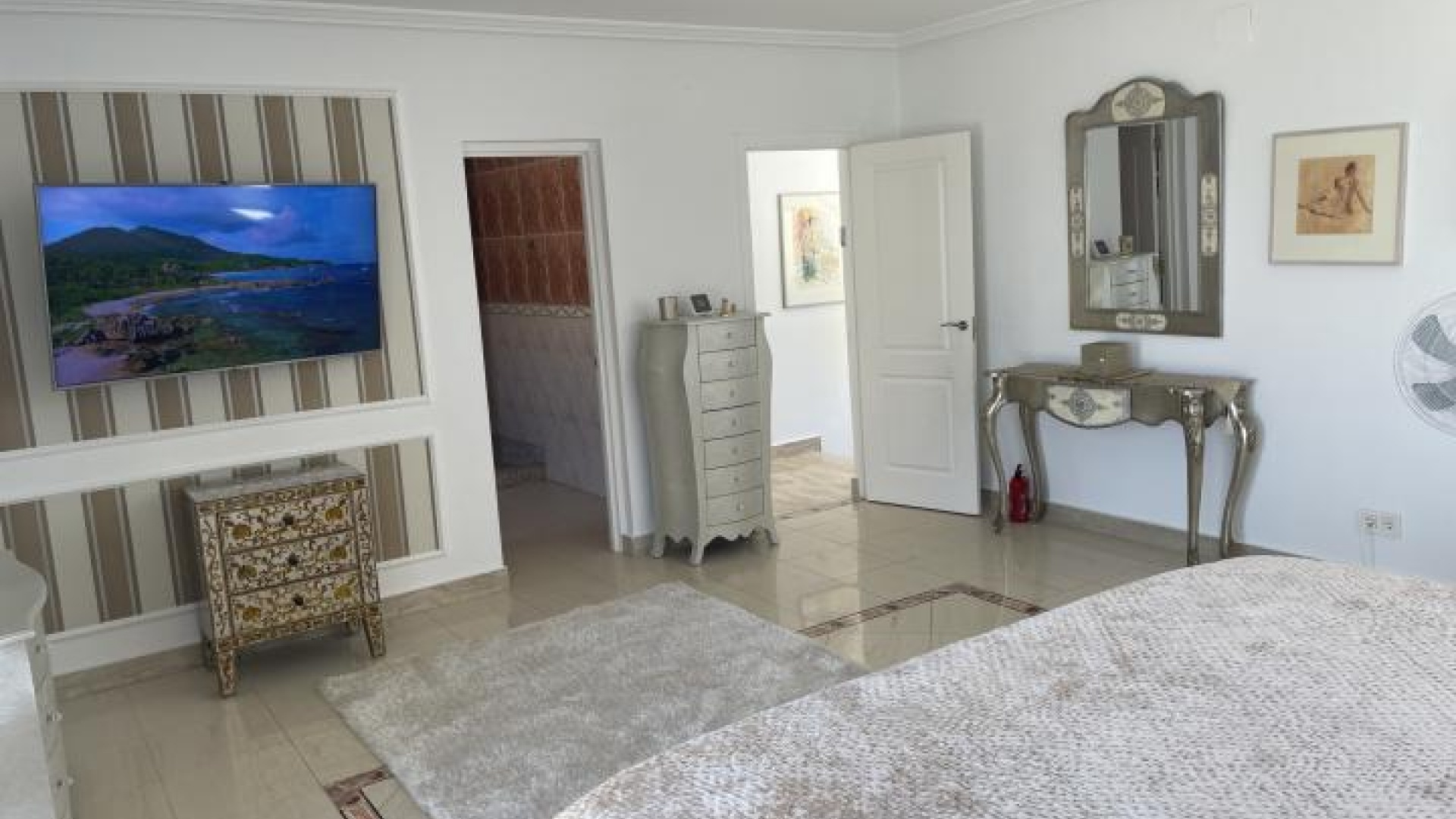 Eine Innentreppe führt Sie zu 2 weiteren Schlafzimmer-Suiten, die jeweils über en-suite Duschen und Badewannen verfügen. Das Hauptschlafzimmer bietet eine große Terrasse mit Blick auf die Rückseite des Grundstücks mit Fernblick auf die Küste.