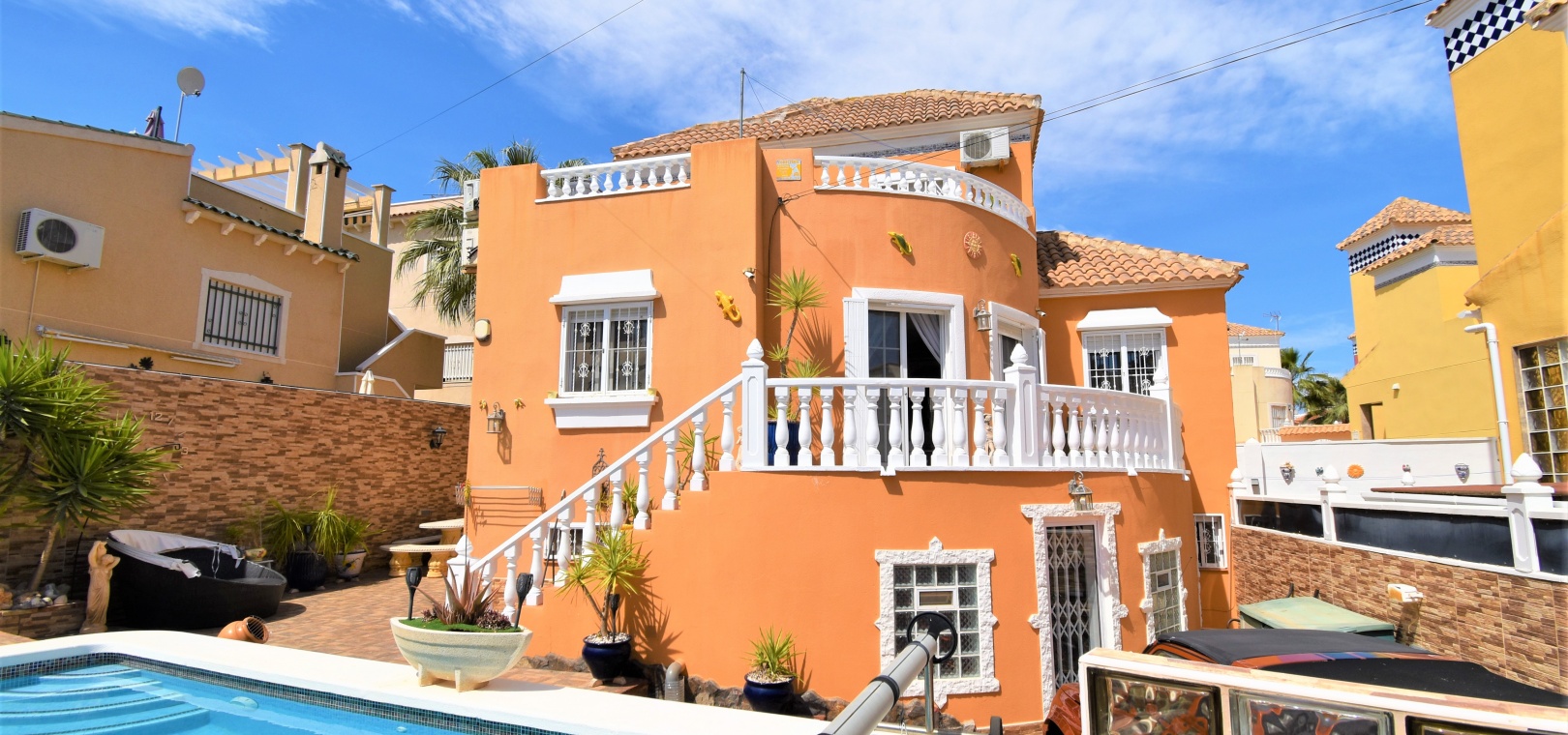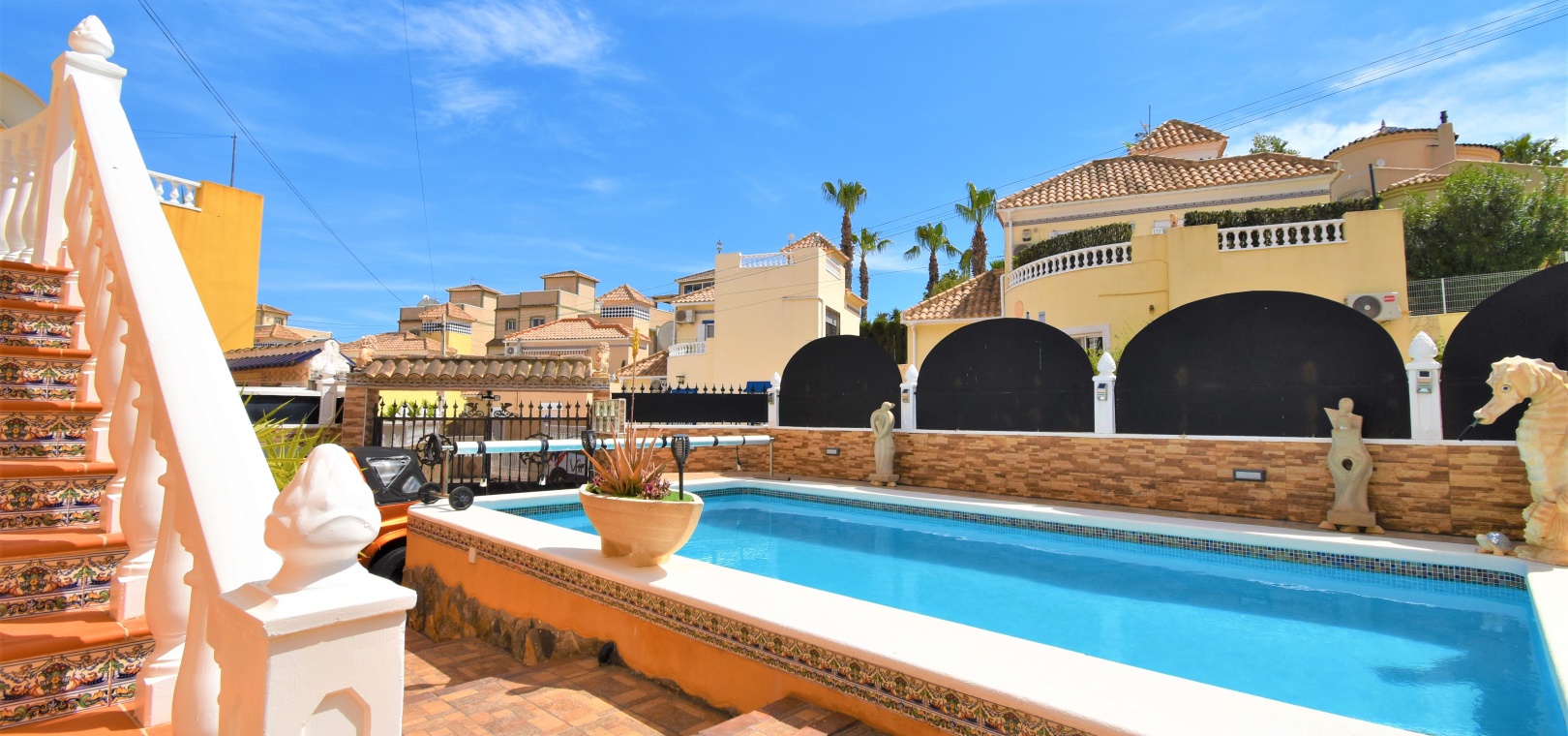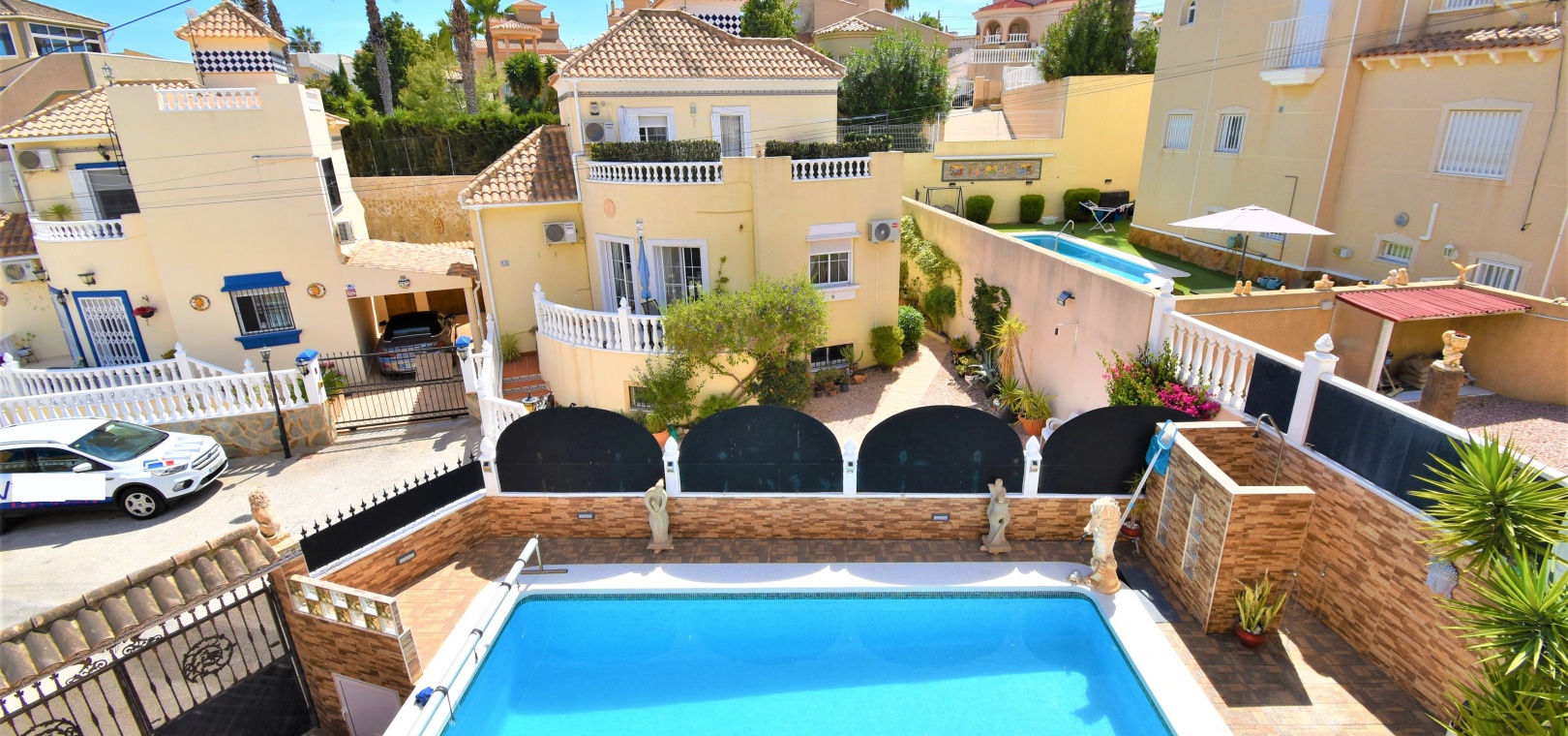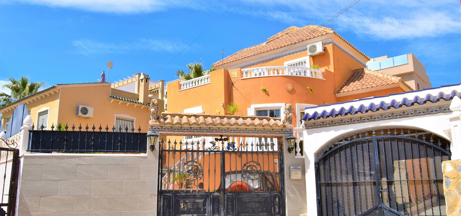 Diese nach Süden ausgerichtete, freistehende Villa mit vier Schlafzimmern in El Galan liegt am Rande dieses beliebten Wohngebiets in Villamartin. Eine Vielzahl von Bars/Restaurants erreichen Sie in nur zehn Minuten zu Fuß; der nächste Supermarkt einer großen Kette ist fünf Autominuten entfernt, ebenso wie drei Golfplätze, Villamartin Plaza und das Einkaufszentrum La Fuente. Das Einkaufszentrum La Zenia Boulevard ist zehn Autominuten entfernt und die Strände entlang der Küste fünfzehn Minuten. Bei der Instandhaltung und Wartung dieses atemberaubenden Familienhauses wurden keine Kosten gescheut. Es besteht aus einem offenen Wohnbereich im Erdgeschoss, einem Loungebereich mit zwei Schiebetüren, die auf eine geschwungene Terrasse führen, einem wunderschönen, verzierten Bogen zum Essbereich, einer offenen, modernen weißen Einbauküche, einer Garderobe, einem Duschraum und einem Doppelzimmer mit Einbauschränken. Im ersten Stock gibt es ein weiteres Doppelzimmer mit Einbauschränken und Terrasse sowie ein Familienbadezimmer. Der Unterbau besteht aus zwei erstaunlich großen Schlafzimmern, eines davon mit eigenem Duschraum. Eine Außentreppe führt hinauf zum Solarium; der Gartenbereich ist gefliest und somit pflegeleicht; es gibt einen privaten Pool und einen Parkplatz abseits der Straße. So ein atemberaubendes Zuhause, in das man einfach „hineinspazieren“ kann.