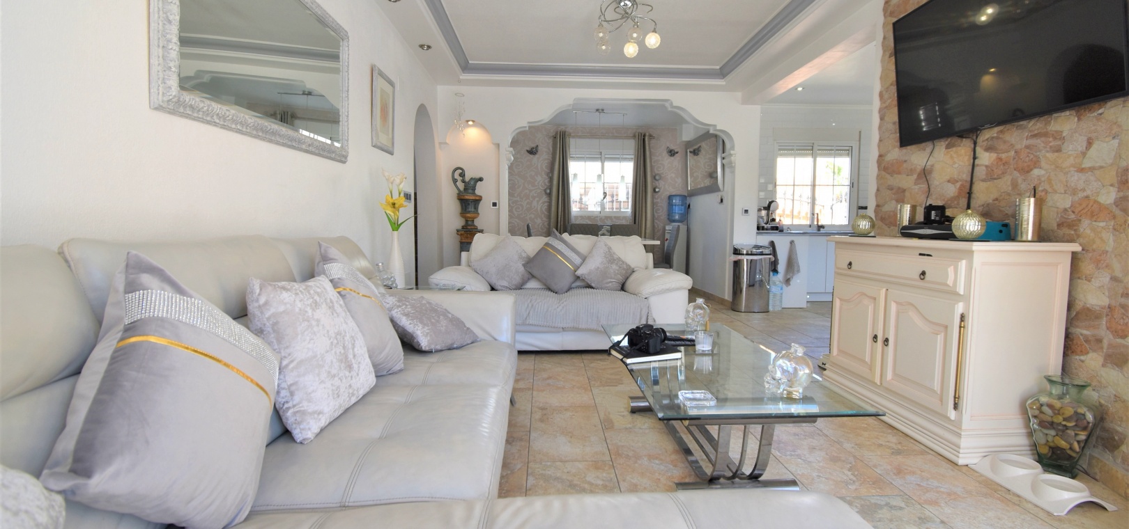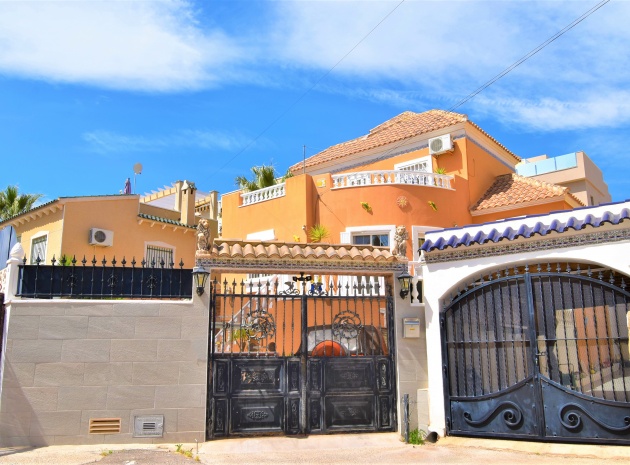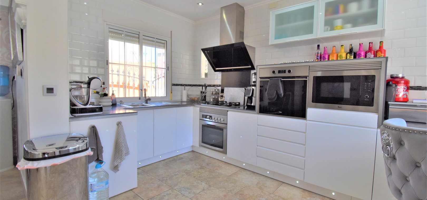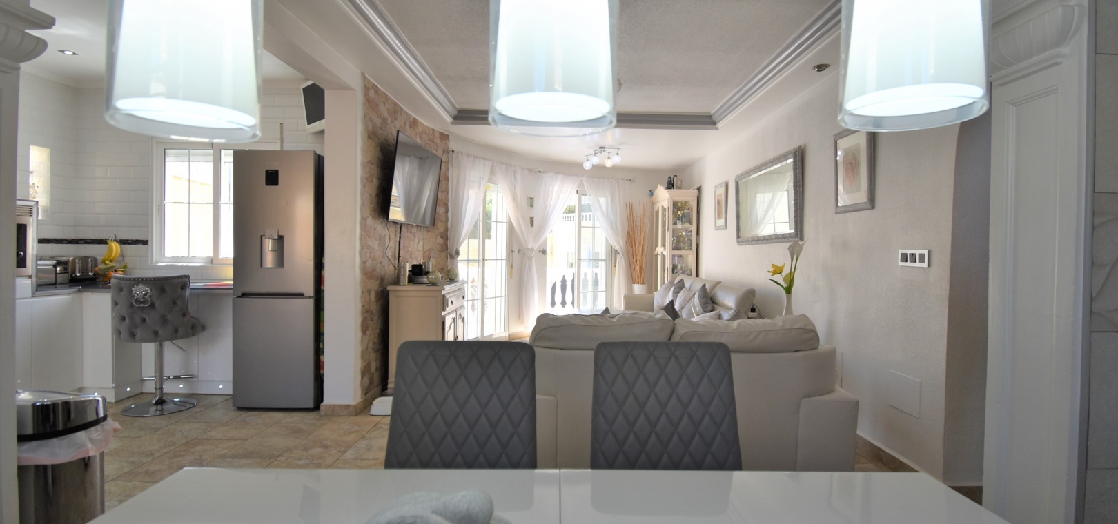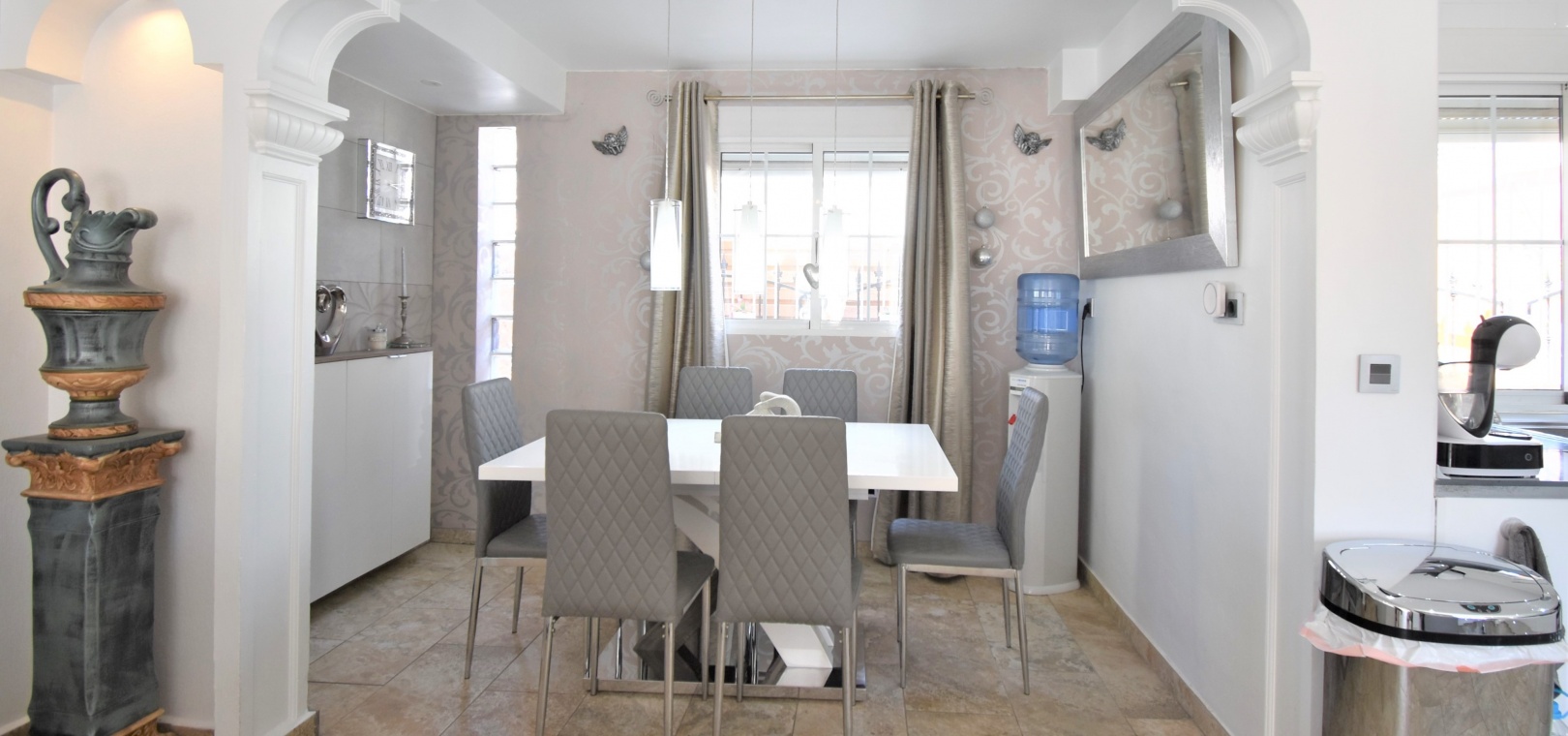 Diese nach Süden ausgerichtete, freistehende Villa mit vier Schlafzimmern in El Galan liegt am Rande dieses beliebten Wohngebiets in Villamartin. Eine Vielzahl von Bars/Restaurants erreichen Sie in nur zehn Minuten zu Fuß; der nächste Supermarkt einer großen Kette ist fünf Autominuten entfernt, ebenso wie drei Golfplätze, Villamartin Plaza und das Einkaufszentrum La Fuente. Das Einkaufszentrum La Zenia Boulevard ist zehn Autominuten entfernt und die Strände entlang der Küste fünfzehn Minuten. Bei der Instandhaltung und Wartung dieses atemberaubenden Familienhauses wurden keine Kosten gescheut. Es besteht aus einem offenen Wohnbereich im Erdgeschoss, einem Loungebereich mit zwei Schiebetüren, die auf eine geschwungene Terrasse führen, einem wunderschönen, verzierten Bogen zum Essbereich, einer offenen, modernen weißen Einbauküche, einer Garderobe, einem Duschraum und einem Doppelzimmer mit Einbauschränken. Im ersten Stock gibt es ein weiteres Doppelzimmer mit Einbauschränken und Terrasse sowie ein Familienbadezimmer. Der Unterbau besteht aus zwei erstaunlich großen Schlafzimmern, eines davon mit eigenem Duschraum. Eine Außentreppe führt hinauf zum Solarium; der Gartenbereich ist gefliest und somit pflegeleicht; es gibt einen privaten Pool und einen Parkplatz abseits der Straße. So ein atemberaubendes Zuhause, in das man einfach „hineinspazieren“ kann.