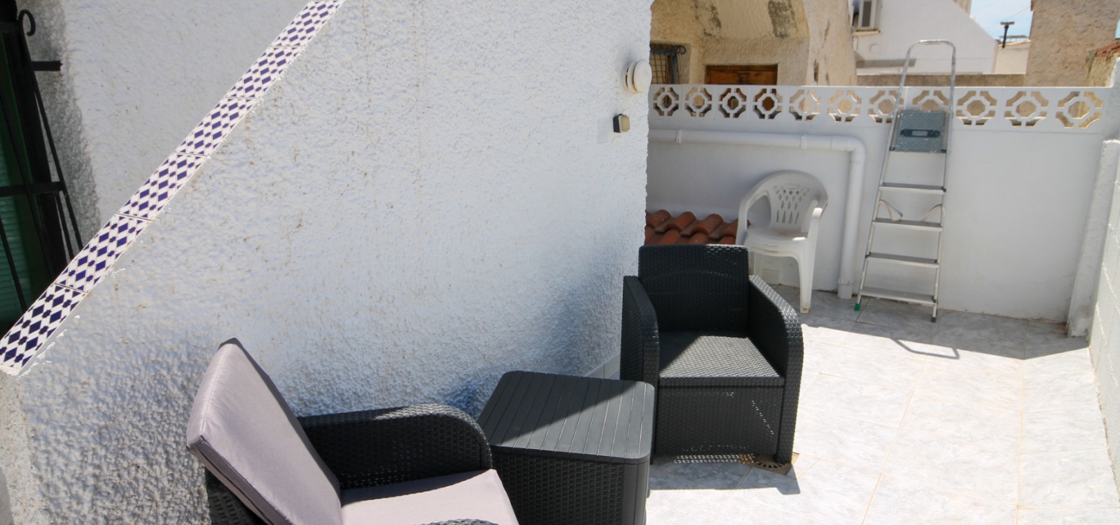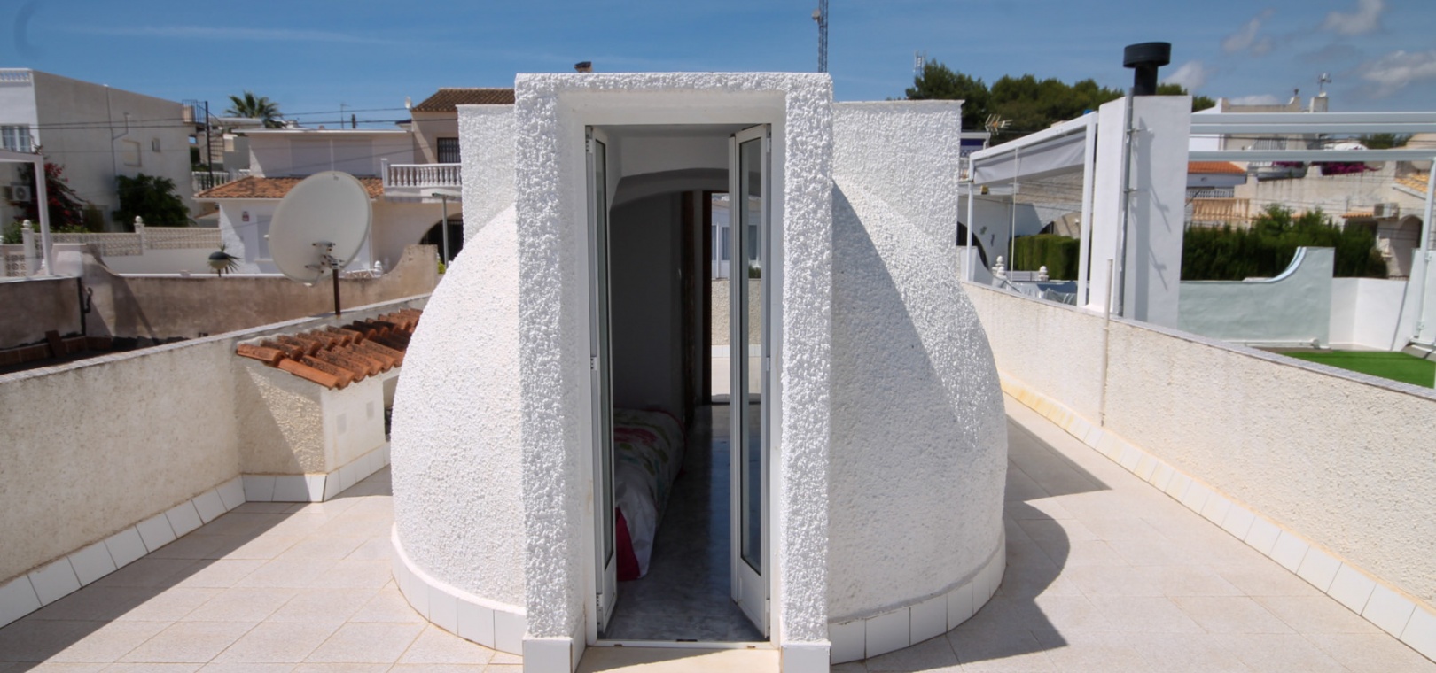 Draußen gibt es einen kleinen Vorgarten, eine verglaste vordere Terrasse und einen hinteren Garten mit Treppen zum großen privaten Solarium auf dem Dach, das über einen Abstellraum und eine fantastische Aussicht verfügt.