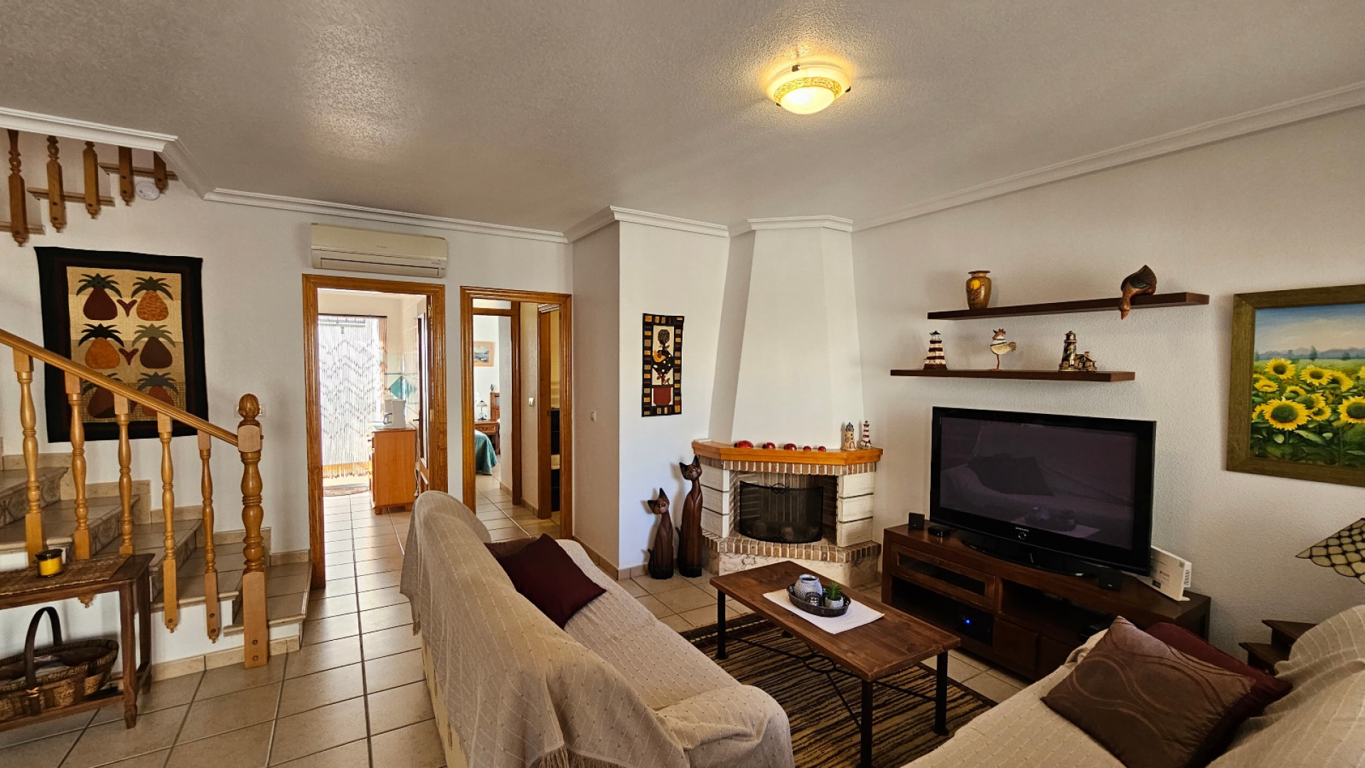 Im Erdgeschoss gibt es ein Wohn-/Esszimmer mit Kamin und Klimaanlage (warm/kalt), eine separate Küche, einen Hauswirtschaftsbereich und 1 Duschbad.