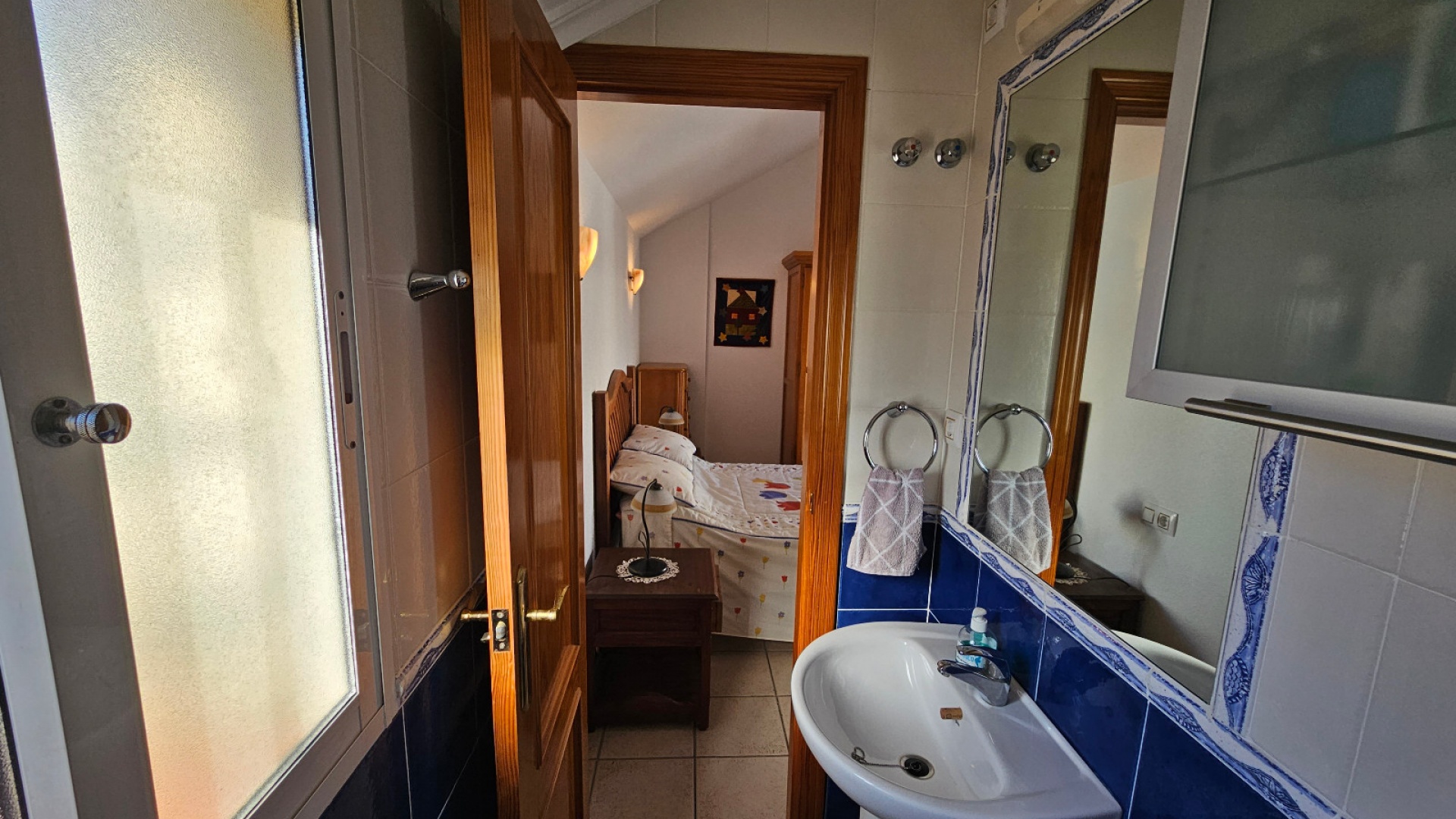 Im 1. Stock gibt es das Hauptschlafzimmer mit eigenem Balkon, 1 Zweibettzimmer mit Einbauschränken und 1 Familienbadezimmer.