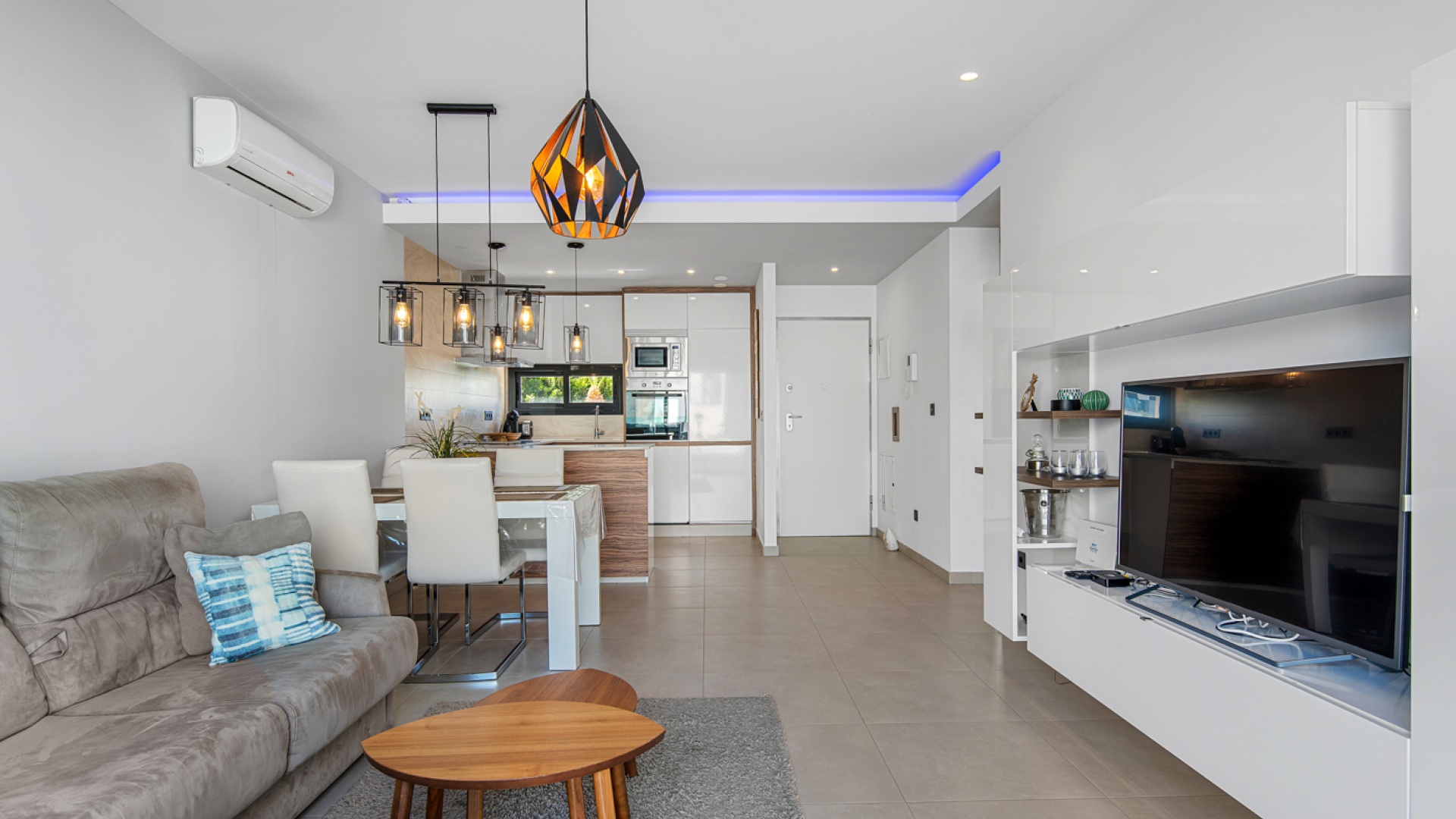 Wohn-/Esszimmer, eine offene, voll ausgestattete Küche im modernen Stil, 2 Doppelzimmer mit Einbauschränken, das Hauptschlafzimmer verfügt über ein eigenes Duschbad und 1 Gäste-Duschbad, Balkon im 1. Stock, großes privates Solarium auf dem Dach, Gemeinschaftspool und Gartenbereich, Kinderpark, Petanque, Sauna und SPA.