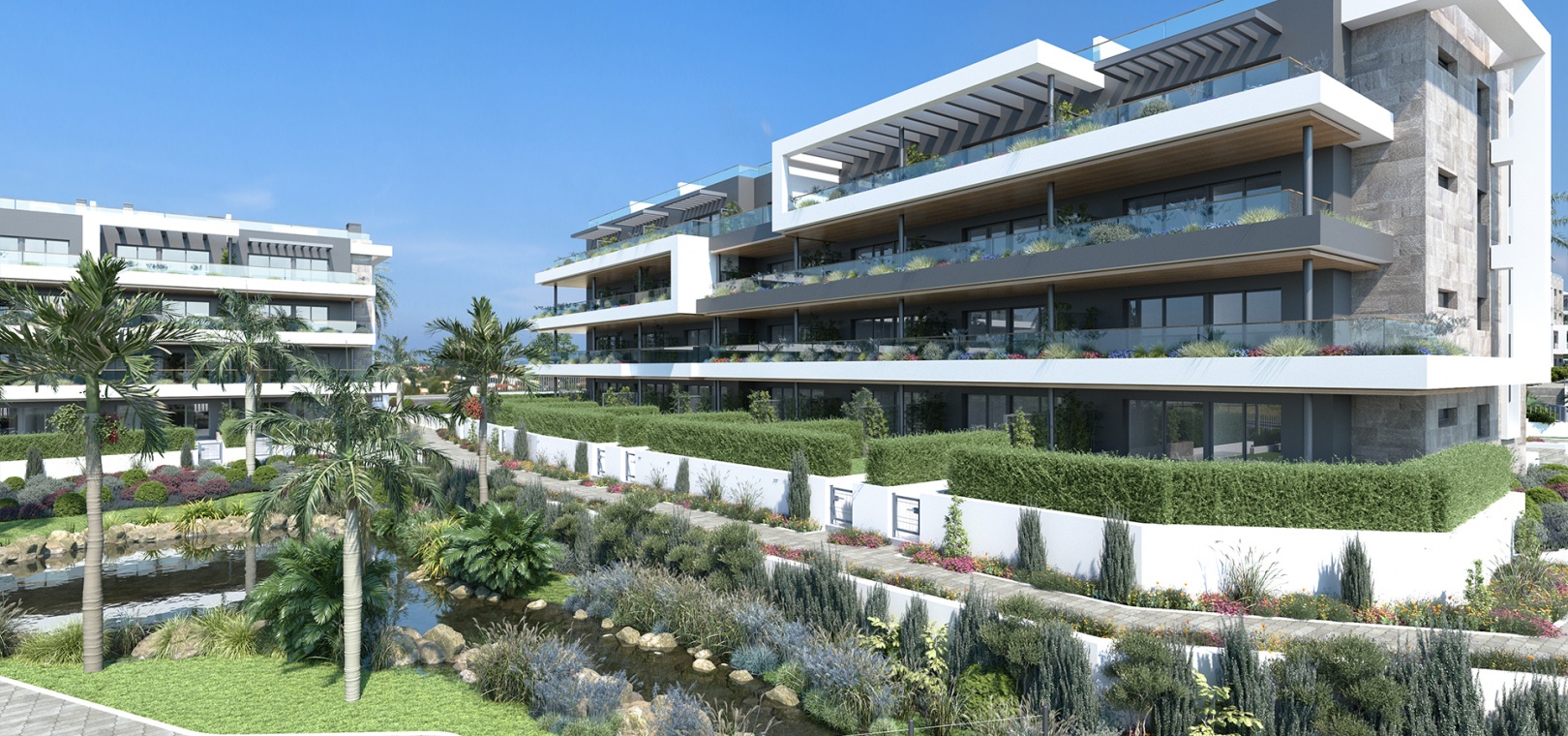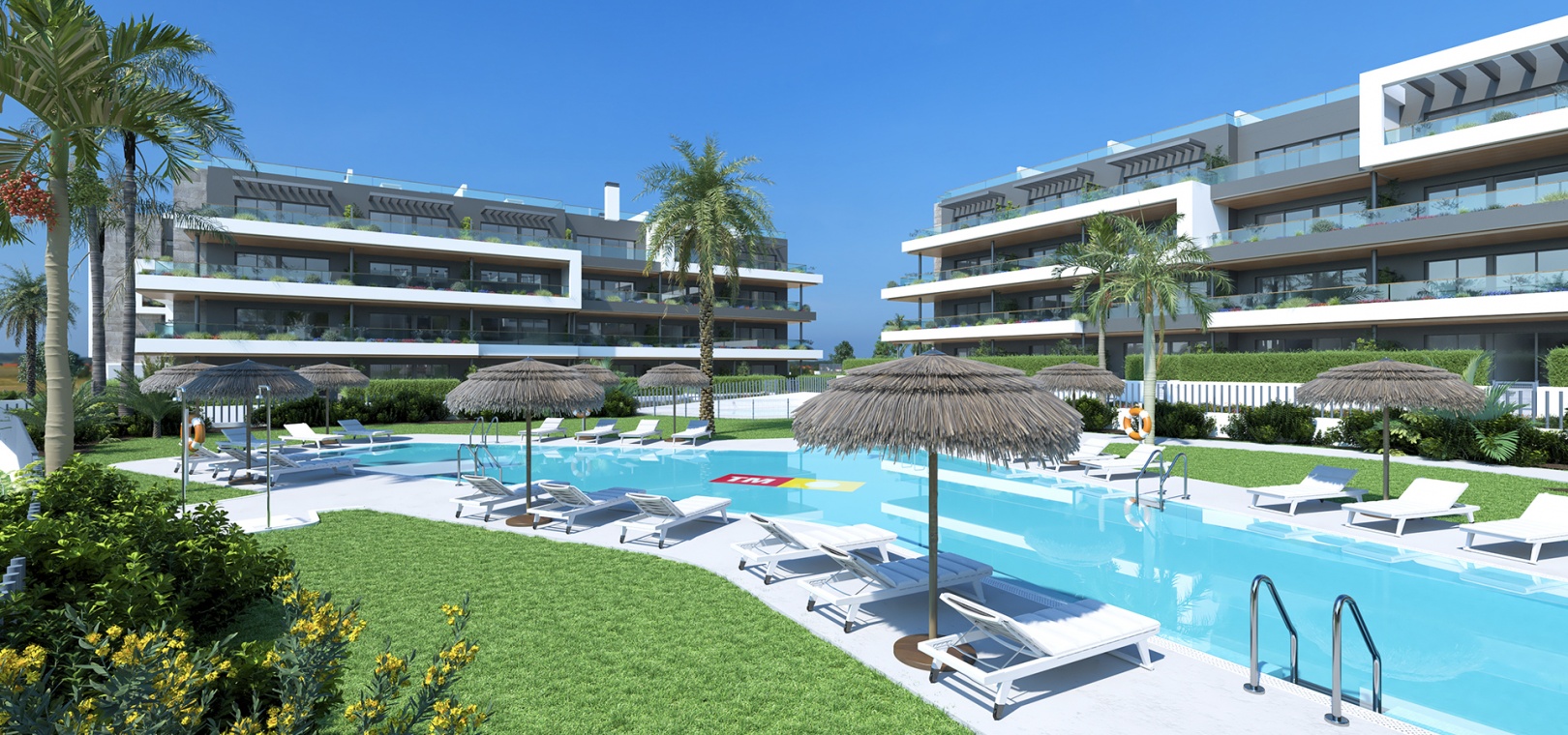 Mehr als 15.200 Quadratmeter Gemeinschaftsflächen sind ideal für einen gesunden Lebensstil. Die Gemeinschaftsbereiche umfassen 2 Pools für Erwachsene, 2 Kinderpools, 2 beheizte Whirlpools, einen Kinderspielplatz, Boule-Plätze und grüne Gartenbereiche mit duftenden Pflanzen, Palmen, Seen, Brunnen und Wegen.