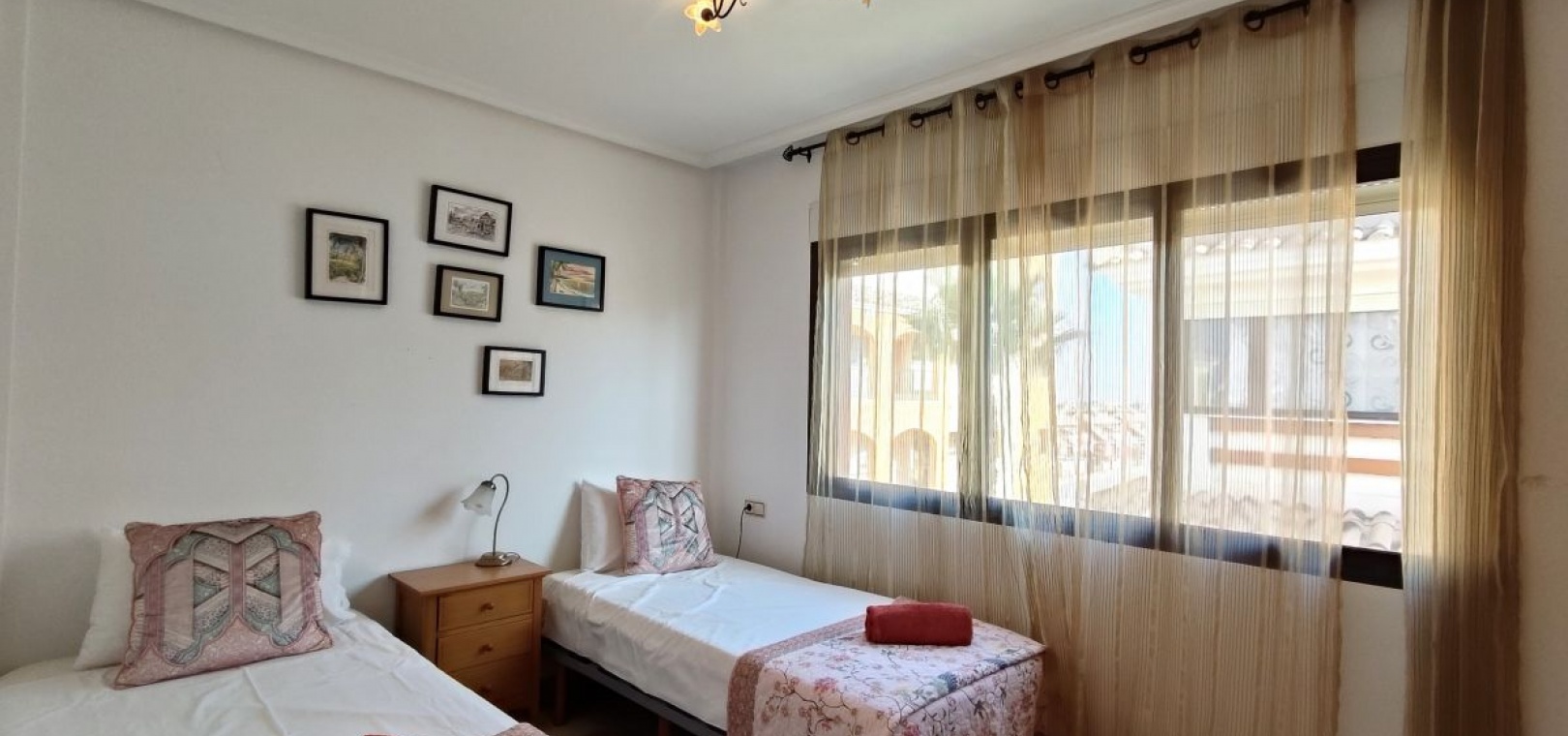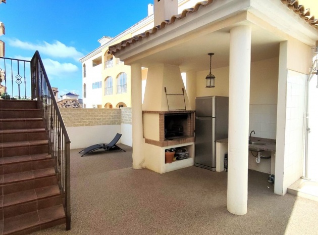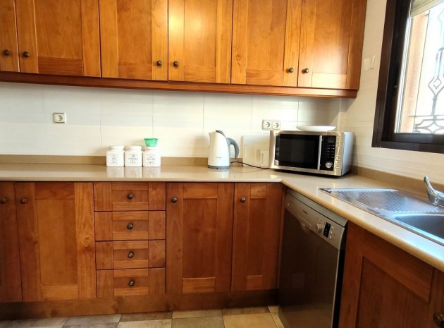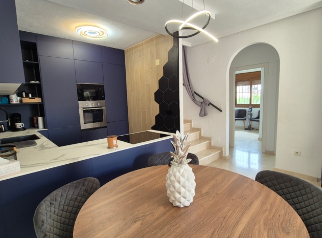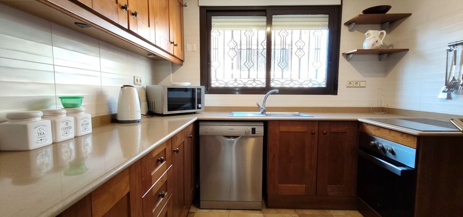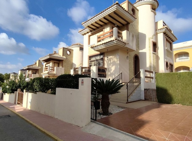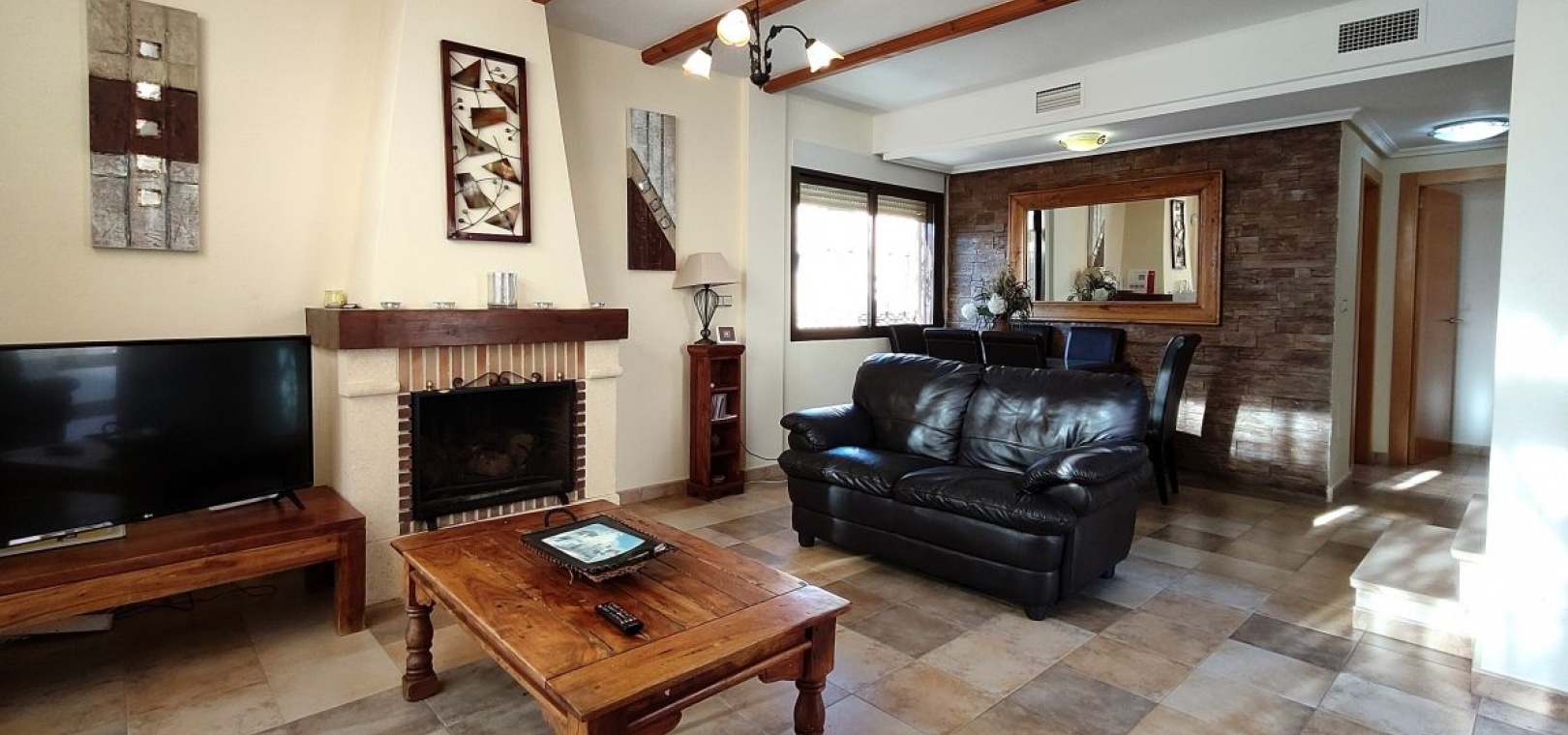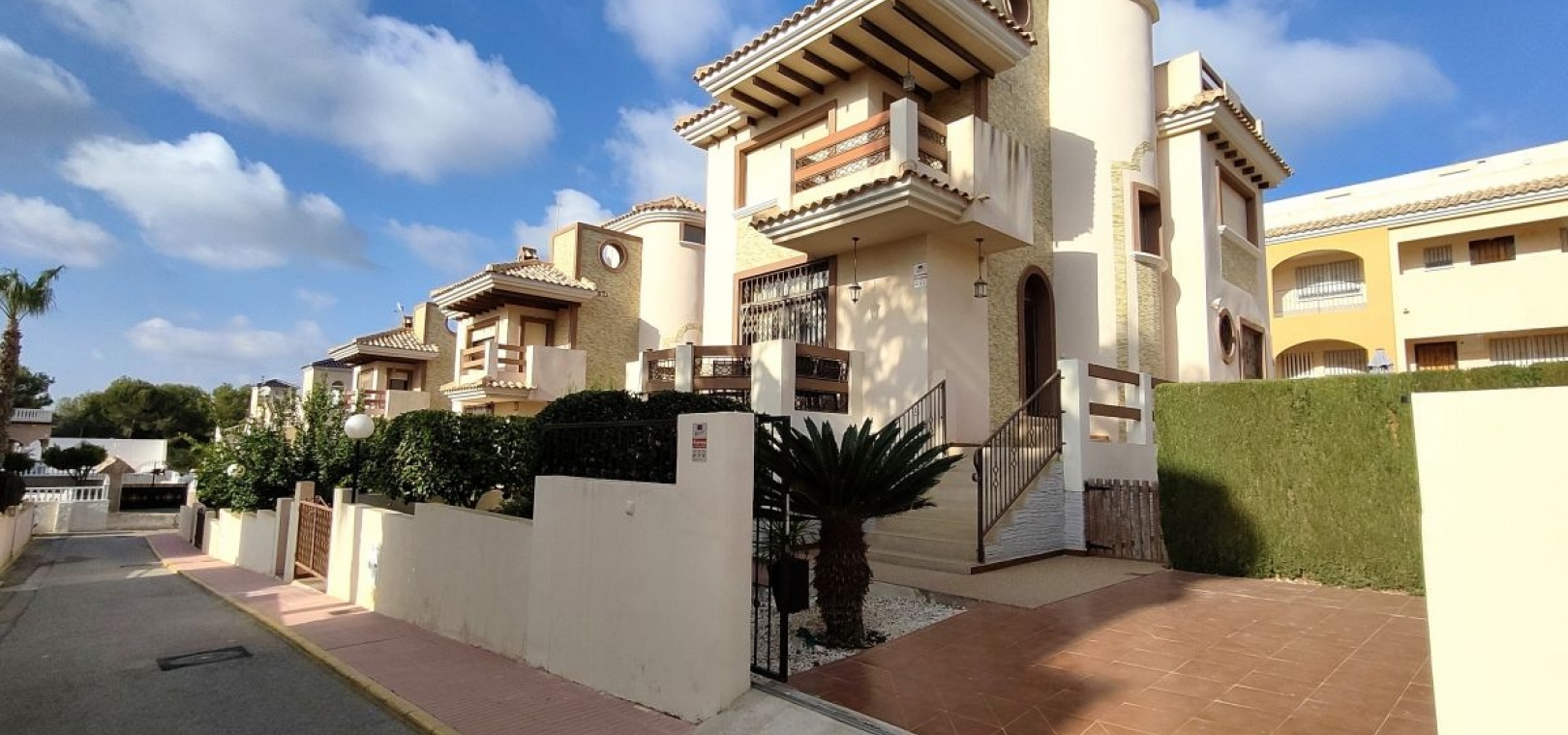 Diese bezaubernde Villa liegt im Herzen von Villamartin an der Süd-Costa Blanca und bietet einen idyllischen Rückzugsort mit einer perfekten Mischung aus Luxus und Komfort. Mit 5 Schlafzimmern und 3 Badezimmern ist diese Residenz ein Zufluchtsort für alle, die geräumige und elegante Wohnräume suchen. Das Äußere der Villa zeugt von Ruhe und verfügt über einen wunderschönen privaten Garten mit einem exotischen Zitronenbaum und einen sorgfältig gestalteten Poolbereich. Die Vorderseite empfängt Sie mit einem Carport und einem von üppigem Grün umgebenen Eingang, während sich auf der Rückseite eine private Oase mit einem Essbereich, einer Außenküche und einem Grill befindet, die nahtlos mit der Hauptküche verbunden ist und bequemen Zugang bietet. Der sorgfältig aus hochwertigen Materialien gefertigte Garten und die Außenbereiche der Villa strahlen ein Gefühl zeitloser Eleganz aus, das an einen Neubau erinnert. Im Erdgeschoss erwartet Sie ein helles und ästhetisch ansprechendes Wohnzimmer mit gemütlichem Kamin und Zugang zu einer bezaubernden Terrasse. Eine separate Küche, ein Badezimmer und ein Schlafzimmer vervollständigen diese Ebene. Innentreppen führen zum Untergeschoss, einem vielseitigen Raum mit einem Wohnzimmer, zwei Schlafzimmern, einem Badezimmer und einem Abstellraum, der den Gästen Komfort und Privatsphäre bietet. Steigen Sie in die obere Etage und entdecken Sie zwei Schlafzimmer. Das Hauptschlafzimmer verfügt über eine gemütliche Südterrasse, die den ganzen Tag über in Sonnenlicht getaucht ist. Ein großes Badezimmer und eine weitere schattige Terrasse sorgen für eine perfekte Balance aus Entspannung und Komfort. Die Villa krönt ihren Charme mit einer großzügigen Dachterrasse, die einen herrlichen Panoramablick auf die Umgebung bietet. Dieses sorgfältig gepflegte Anwesen ist vollständig möbliert und mit einer Kanalklimaanlage für heißes und kaltes Klima ausgestattet und ein idealer Zufluchtsort für große Familien oder diejenigen, die einen weitläufigen Wohnbereich wünschen. Diese Villa liegt nur 10 Gehminuten von den nächsten Geschäften und Restaurants und eine kurze 10-minütige Fahrt von den Sandstränden von Orihuela Costa entfernt und bietet die perfekte Mischung aus Komfort und Luxus. Umgeben von mehreren Golfplätzen verspricht es den typisch spanischen Lebensstil und ist somit ein idealer Urlaubsort oder dauerhafter Wohnsitz in der Wärme der Sonne.
