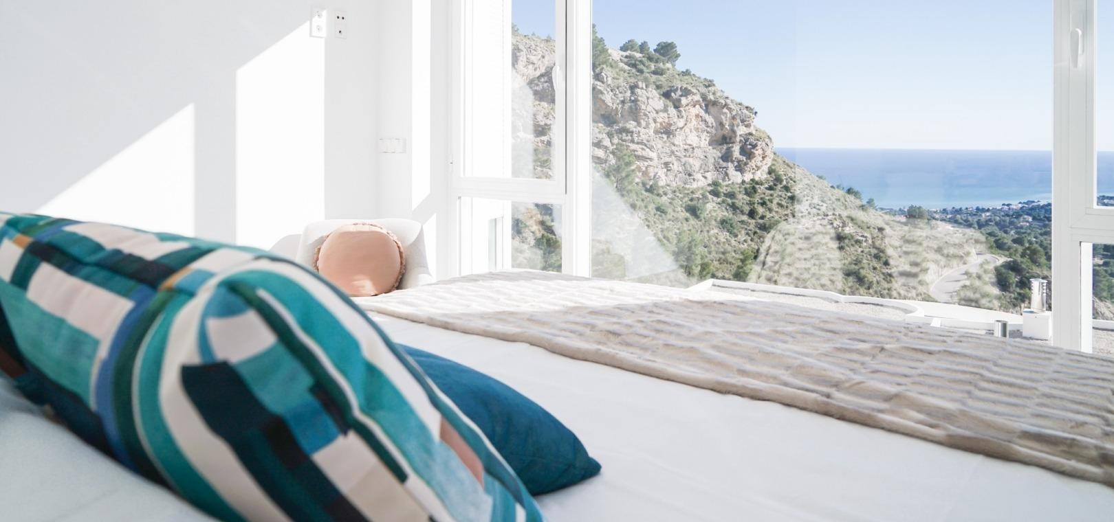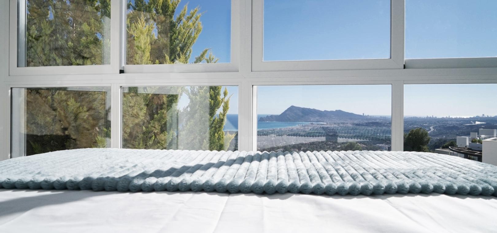 Neubau-Luxusvilla in einer lichtdurchfluteten Wohnanlage mit großen Innenräumen, einzigartiger Architektur und natürlicher Umgebung, Panoramablick auf das Mittelmeer und die Skyline von Benidorm.