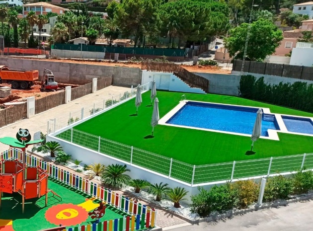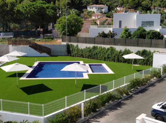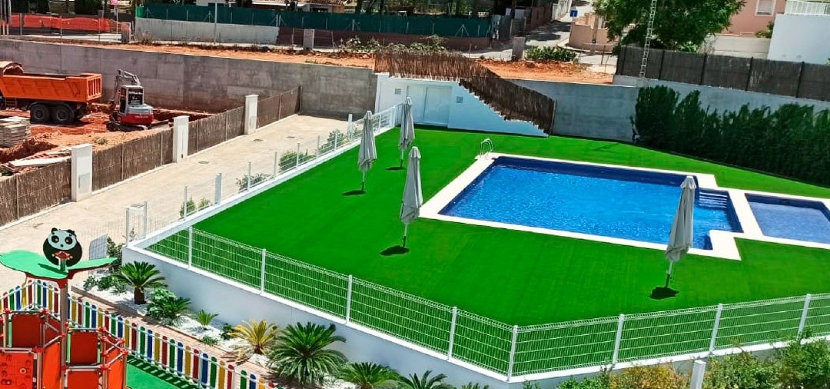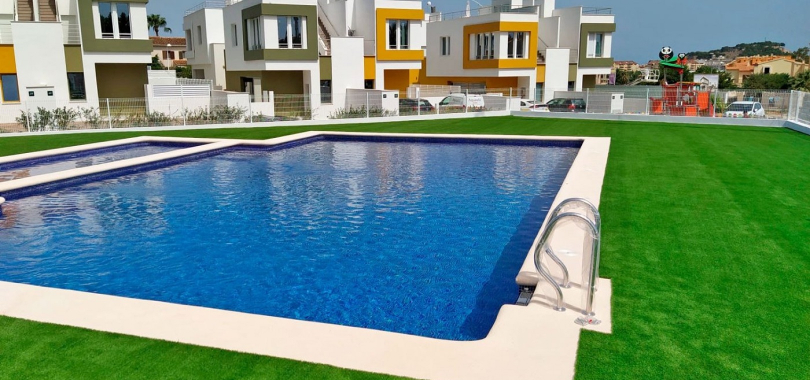 Die Wohnanlage verfügt über gemeinsame Grünflächen, Spielplätze und einen Gemeinschaftspool.