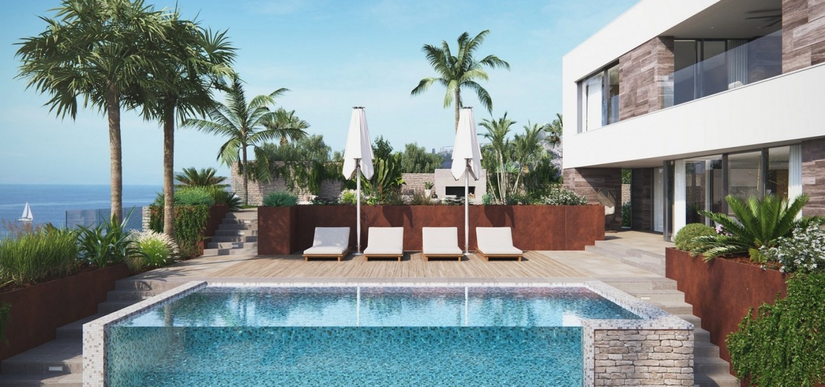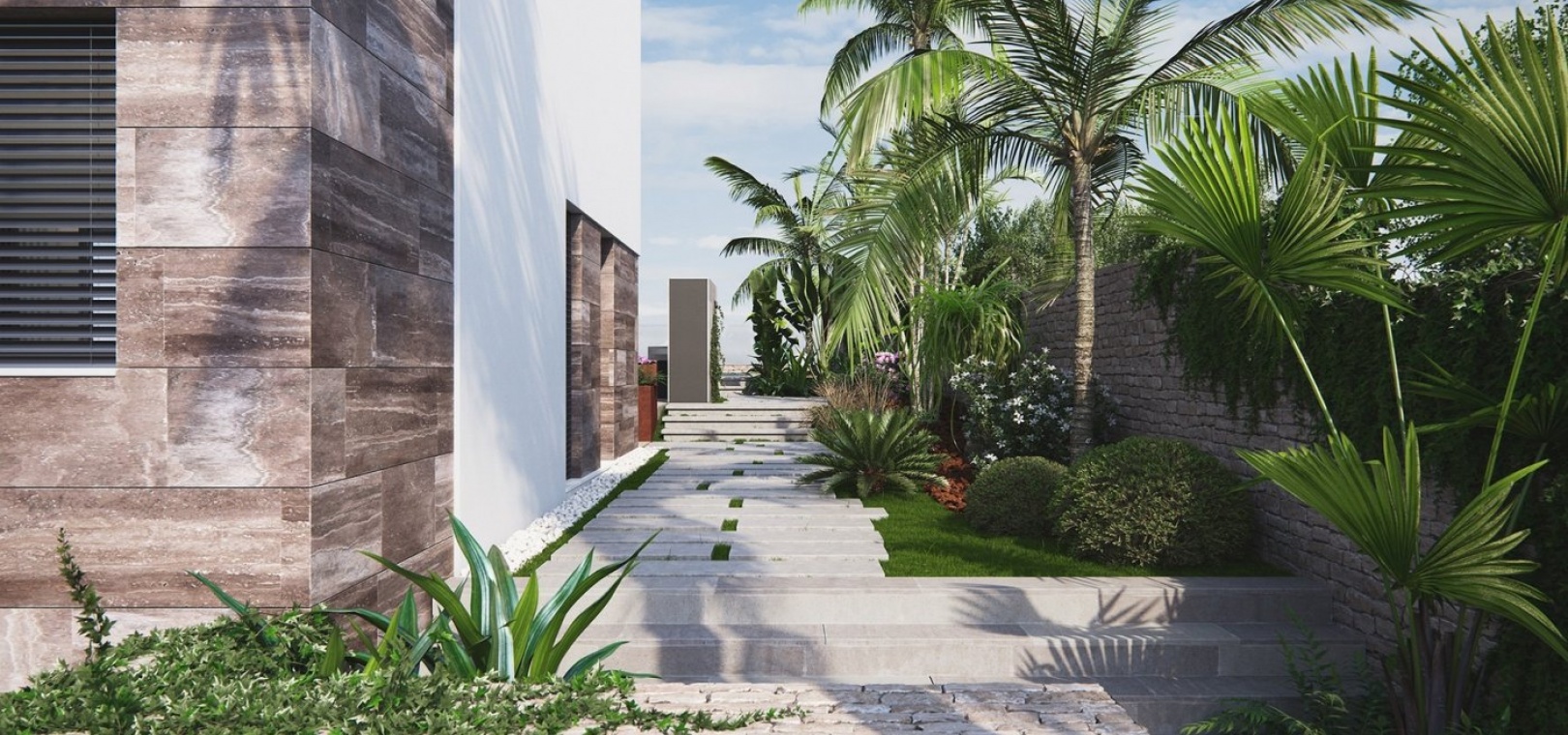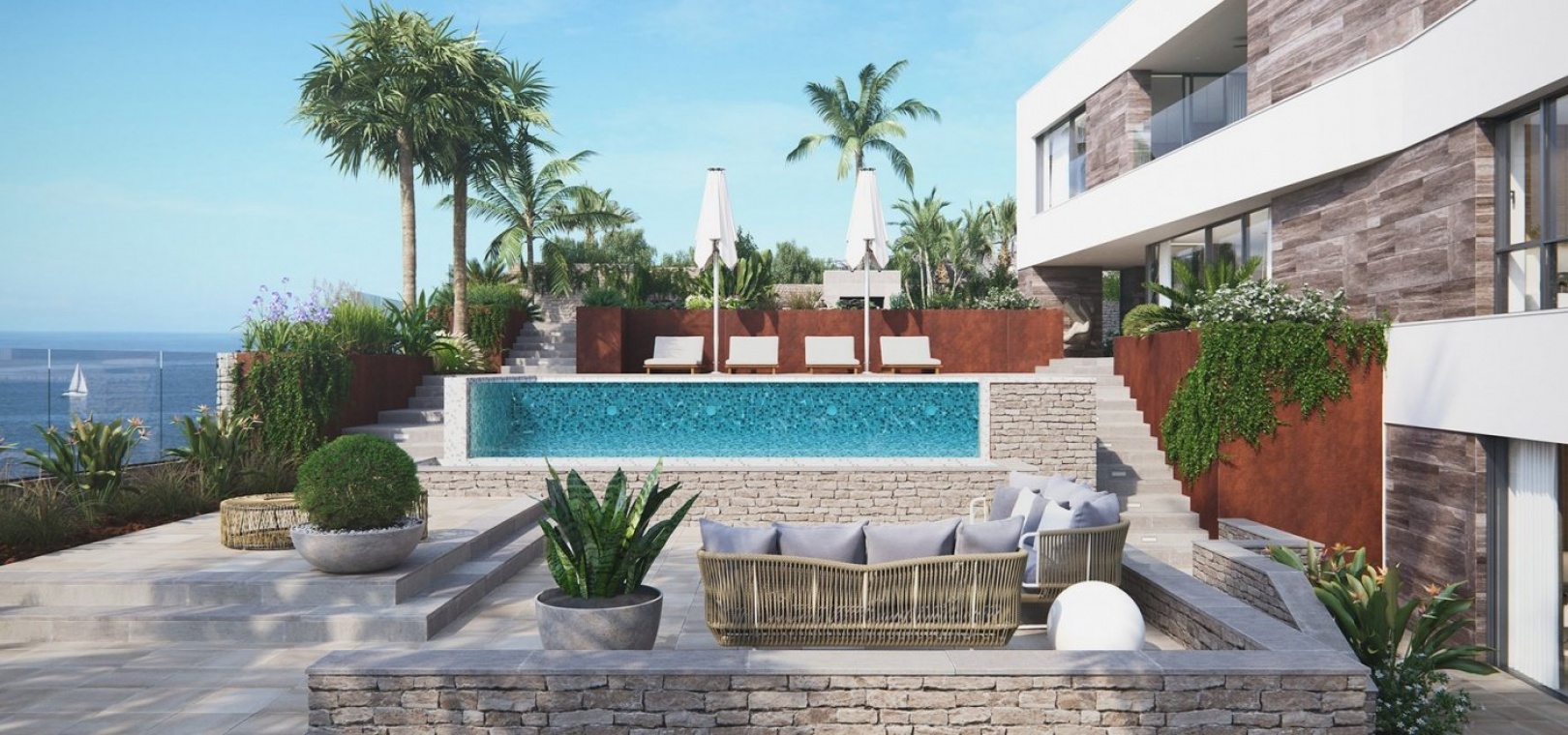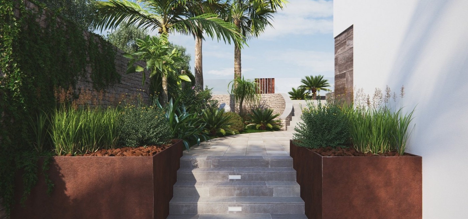 Die Gärten haben ein Wasserabflusssystem im Boden, sind vollständig fertiggestellt und können individuell gestaltet werden, einschließlich Bepflanzung, Bewässerung und Beleuchtung. Terrassen in verschiedenen Höhen schaffen eine gemütliche Atmosphäre, umgeben von Vegetation und unendlichem Meerblick.