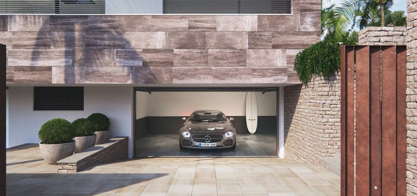 Die Zugangstore zum Garten und zur Garage sind mit einer Infrarot-Fernbedienung automatisiert. Garage für zwei Fahrzeuge und Außenparkplatz für ein weiteres Fahrzeug.