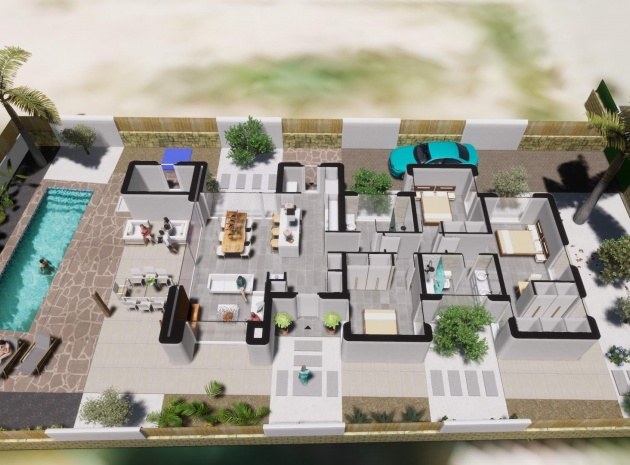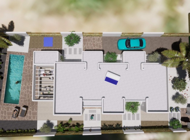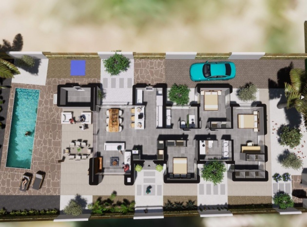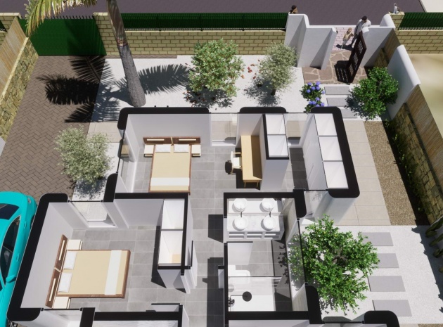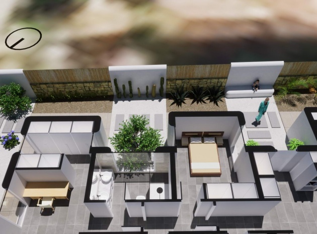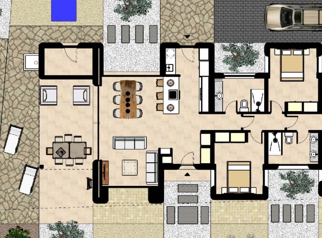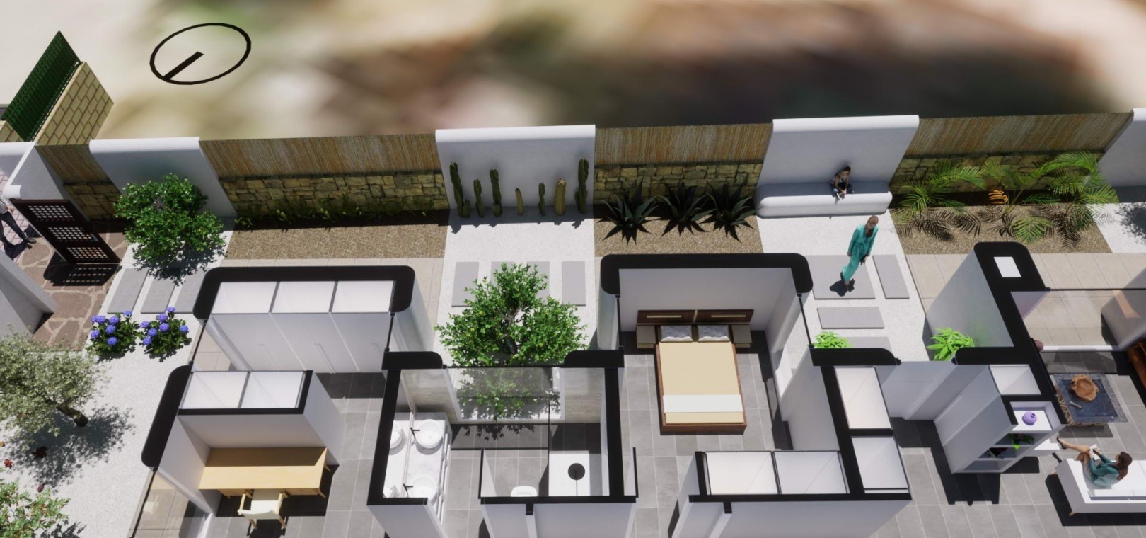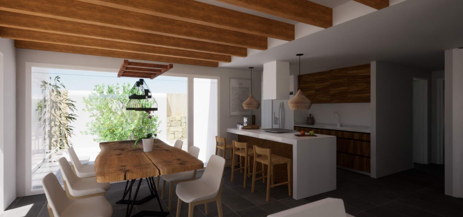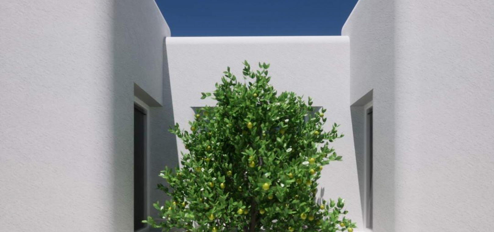 Das Haus auf Ibiza ist in das Grundstück integriert und schafft seine eigenen charakteristischen Räume, die vom Innenbereich bis zum Außenbereich reichen, wo Pflanzen strategisch in der Flugbahn jedes Innenfensters und in Kombination mit anderen Elementen wie verschiedenen Arten von Pflaster und Kies und Materialien für die Außenwände (Landschaftsprojekt) platziert sind.