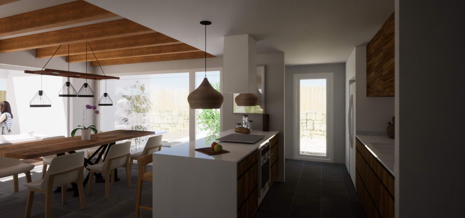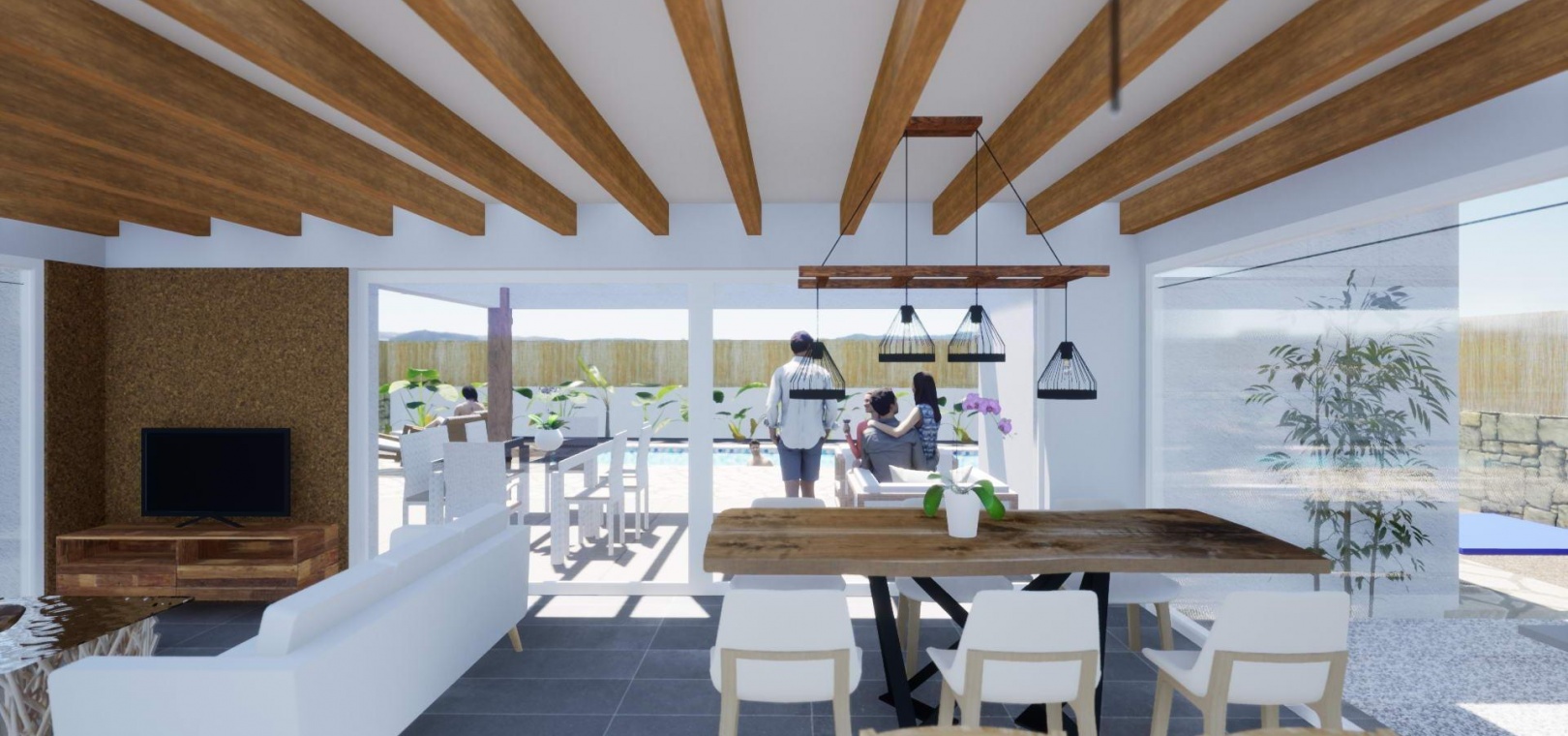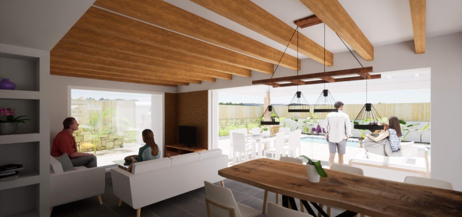 Wohnzimmer mit offener Küche, ein wunderschönes großes Schiebefenster, das im Hohlraum der Wand versteckt ist und einen nahtlosen Übergang vom Innen- zum Außenbereich vortäuscht, mit einer Pérgola als Pufferraum zwischen der Poolterrasse, einem Bereich für maximalen Außengenuss.