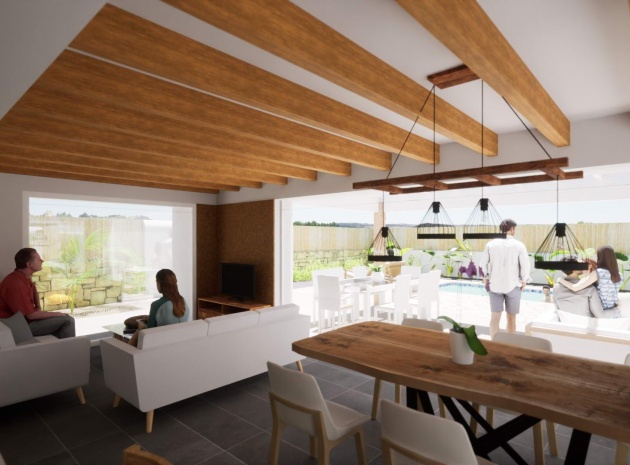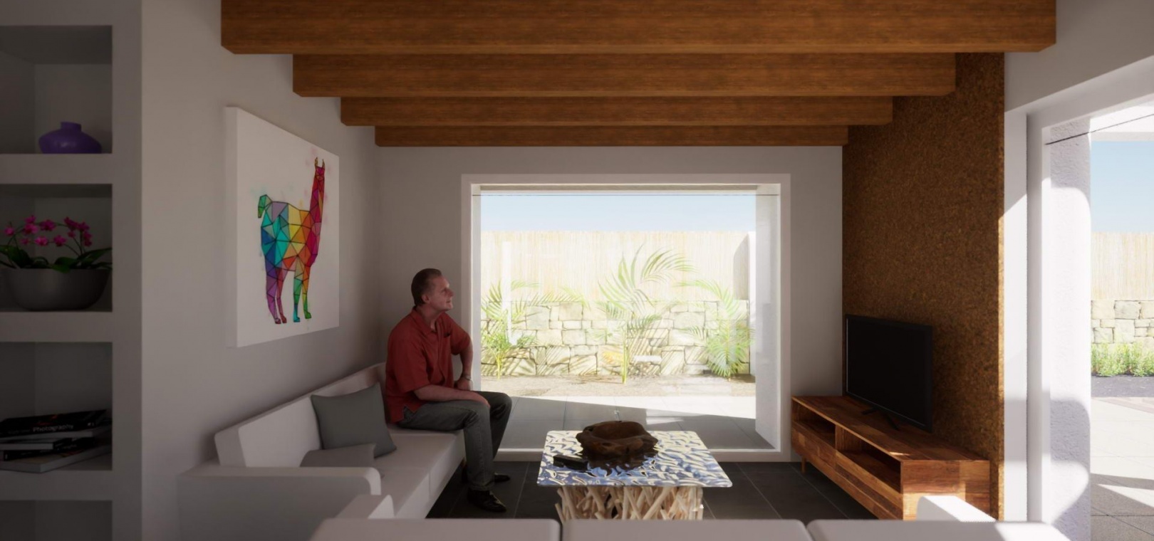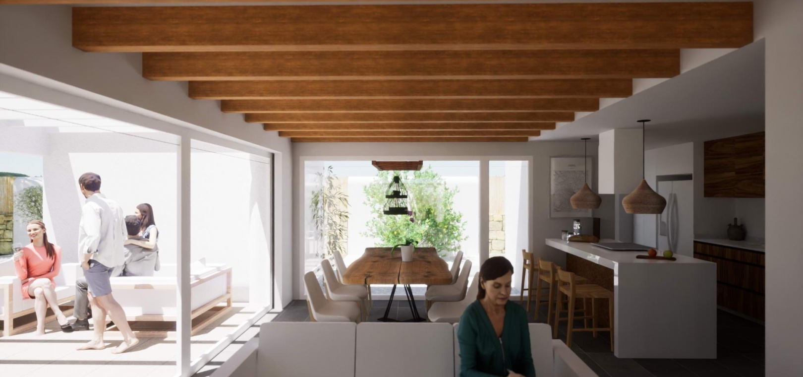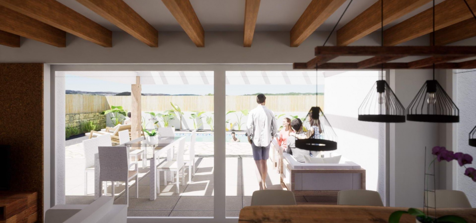 Wohnzimmer mit offener Küche, ein wunderschönes großes Schiebefenster, das im Hohlraum der Wand versteckt ist und einen nahtlosen Übergang vom Innen- zum Außenbereich vortäuscht, mit einer Pérgola als Pufferraum zwischen der Poolterrasse, einem Bereich für maximalen Außengenuss.