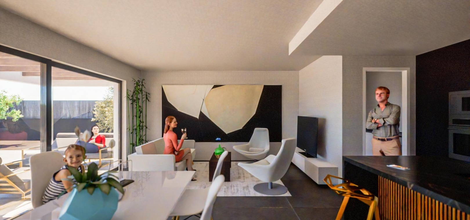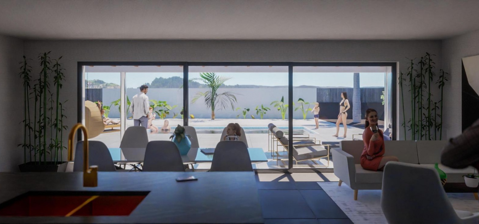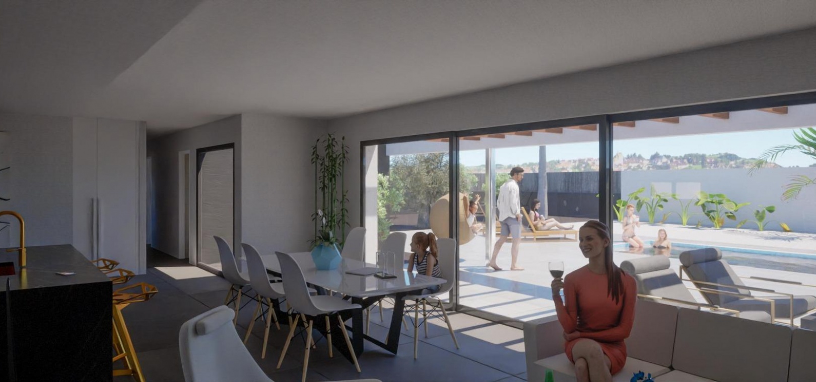 Ein sehr großes Wohnzimmer mit Esszimmer und amerikanischer Küche, lange Glasschiebetüren, die mit dem Außenbereich des Pools verbunden sind, wo eine 8,5 m lange Pérgola für maximalen Komfort im Freien sorgt.