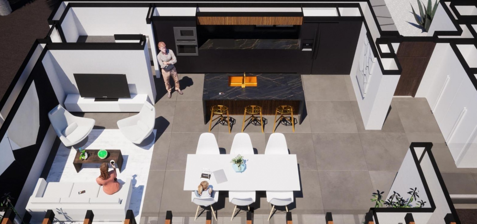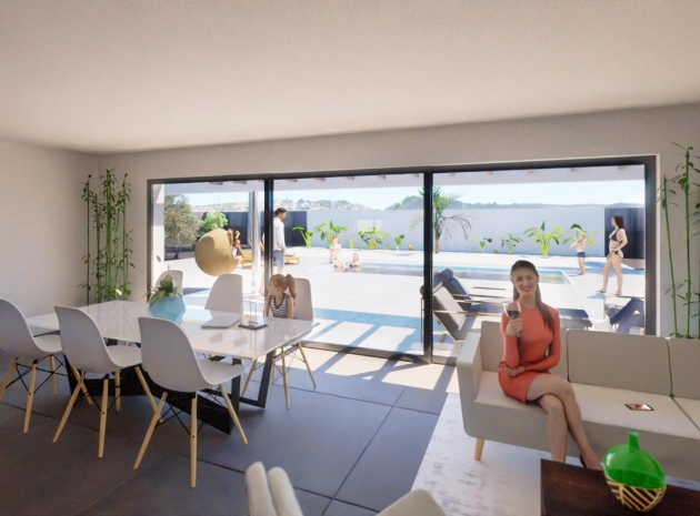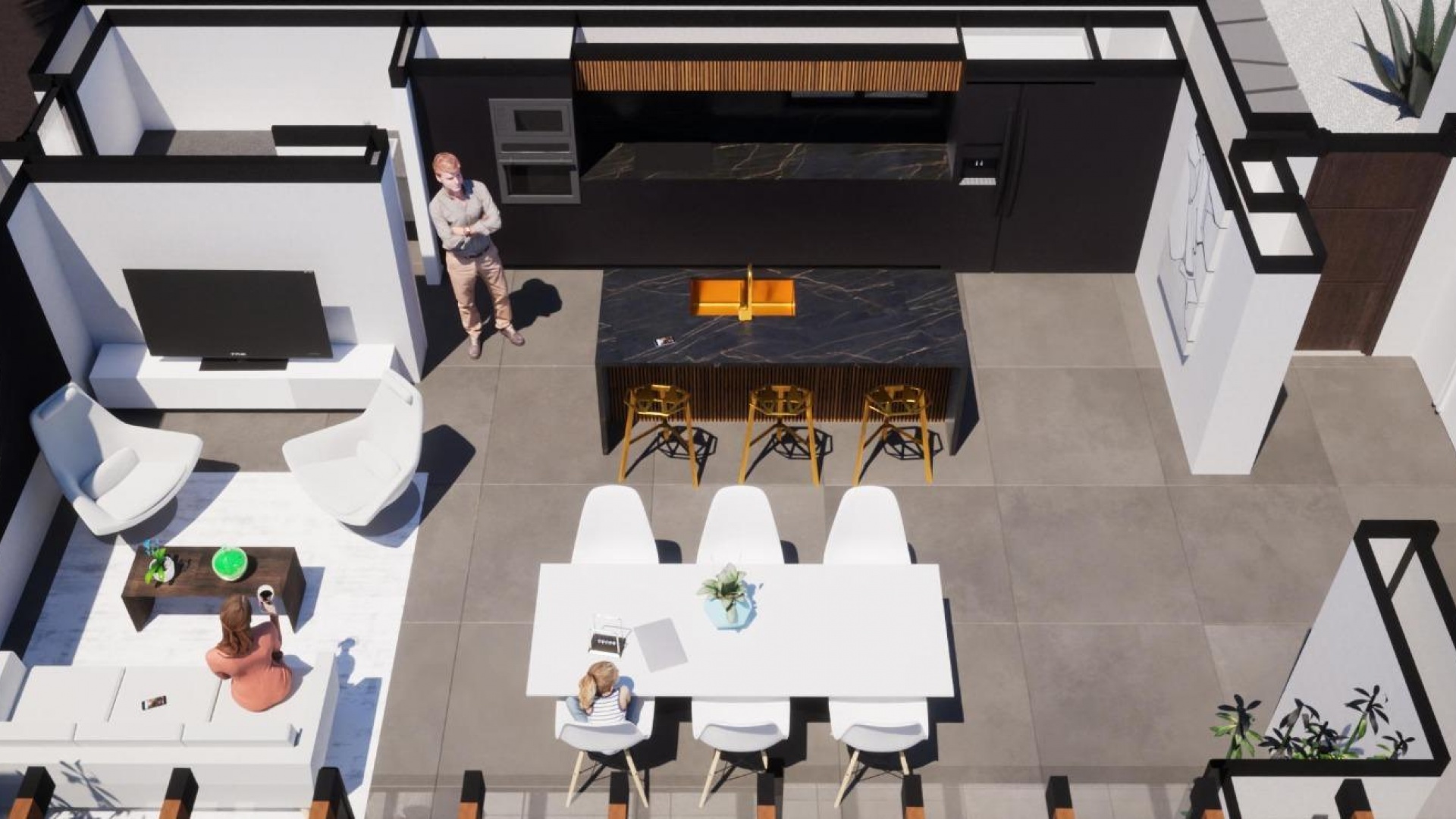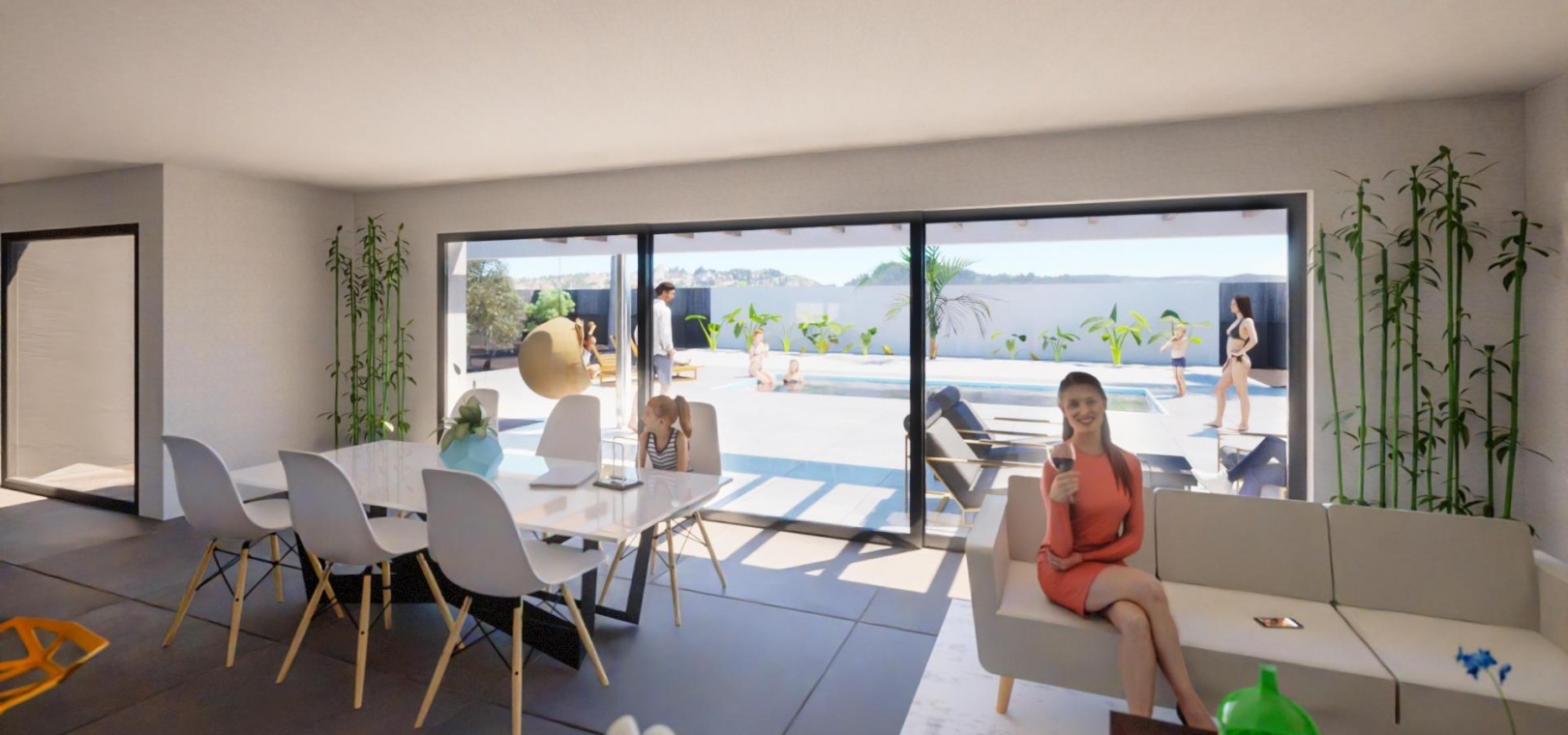 Ein sehr großes Wohnzimmer mit Esszimmer und amerikanischer Küche, lange Glasschiebetüren, die mit dem Außenbereich des Pools verbunden sind, wo eine 8,5 m lange Pérgola für maximalen Komfort im Freien sorgt.