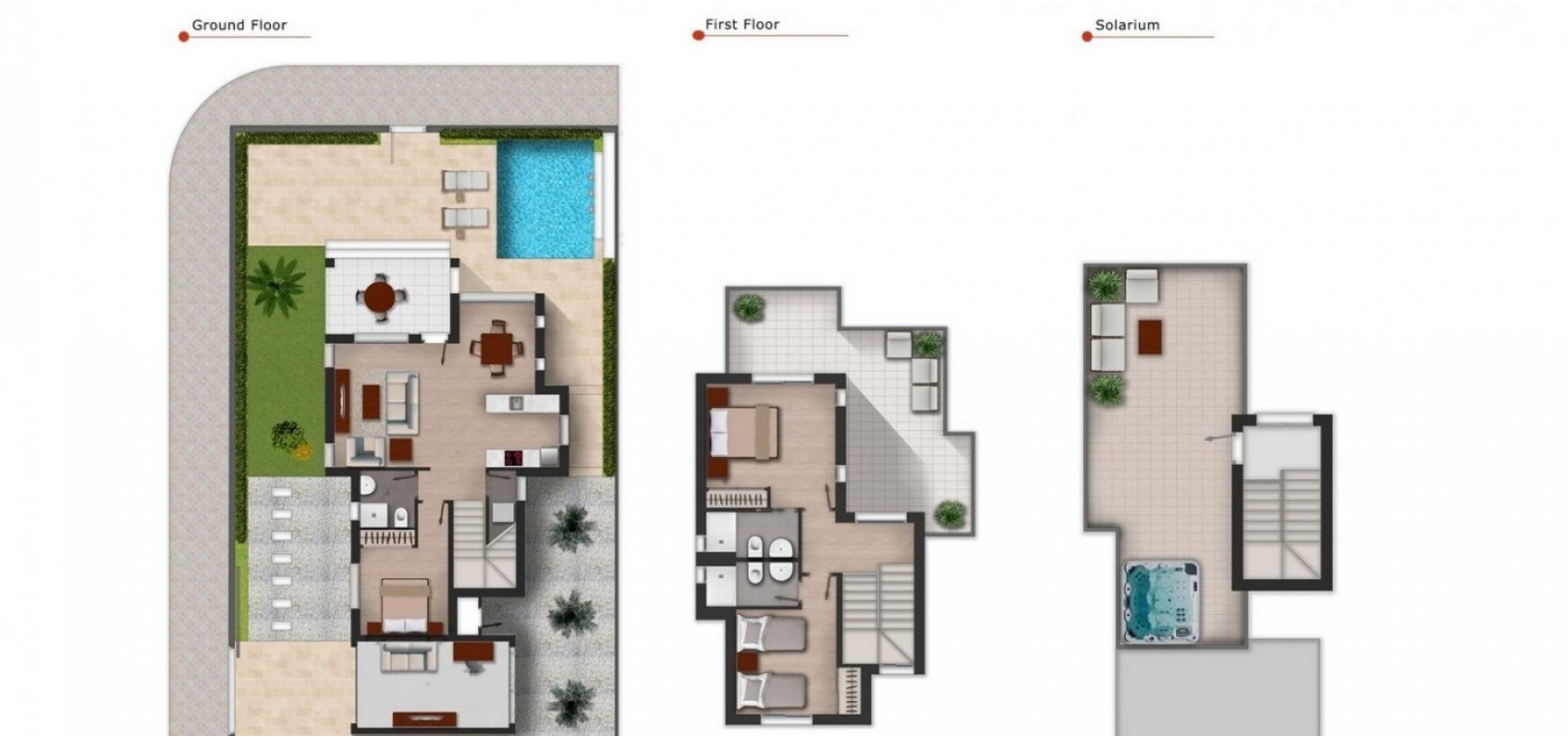 Diese Villa mit geraden Linien gebaut über 2 Etagen und verfügt über 3 Schlafzimmer, 3 Badezimmer, offene Küche mit Wohn-Esszimmer, Solarium, privater Garten, Schwimmbad und Parkplatz.