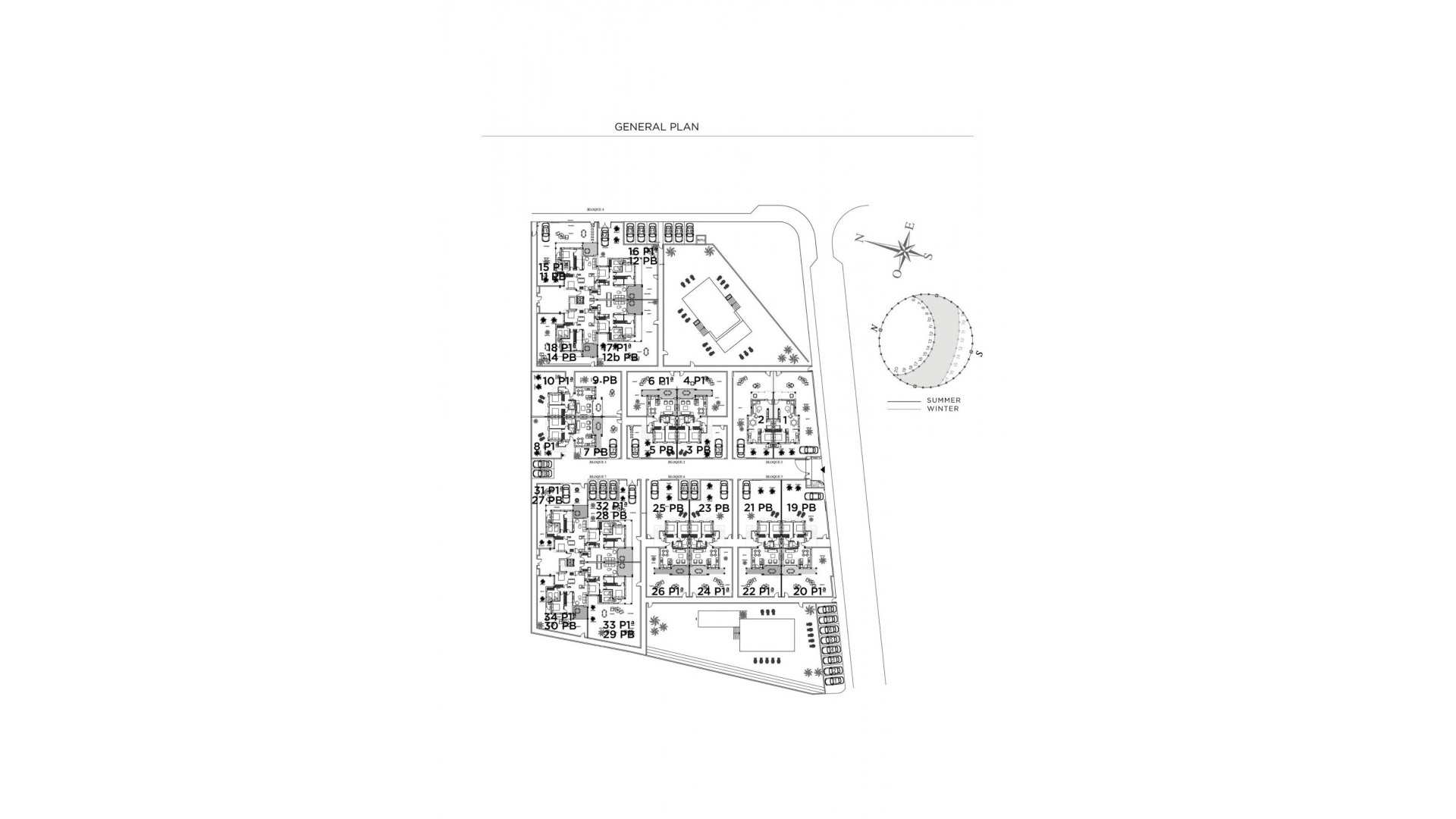 Private Wohnanlage mit Grünflächen, Schwimmbad und privatem Parkplatz.