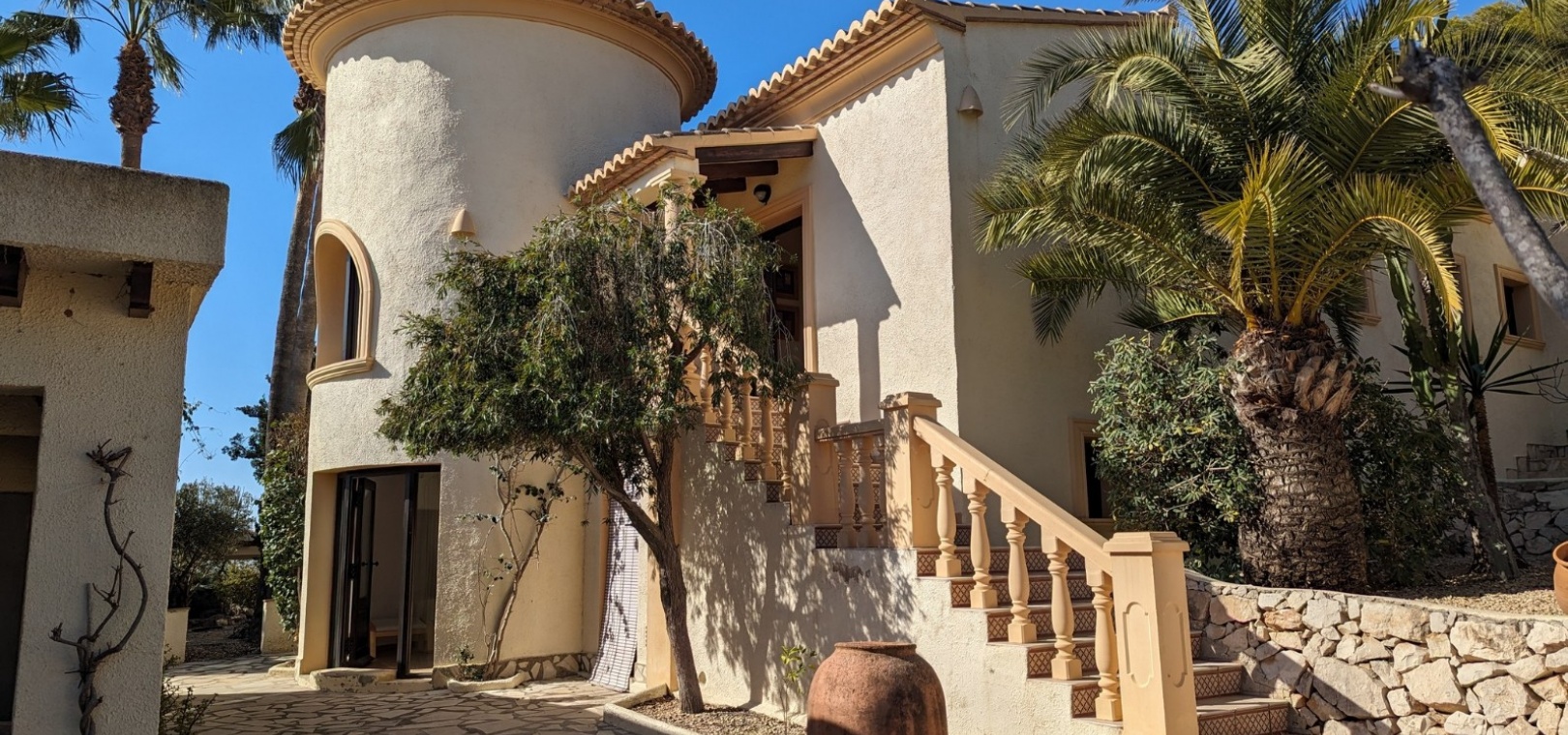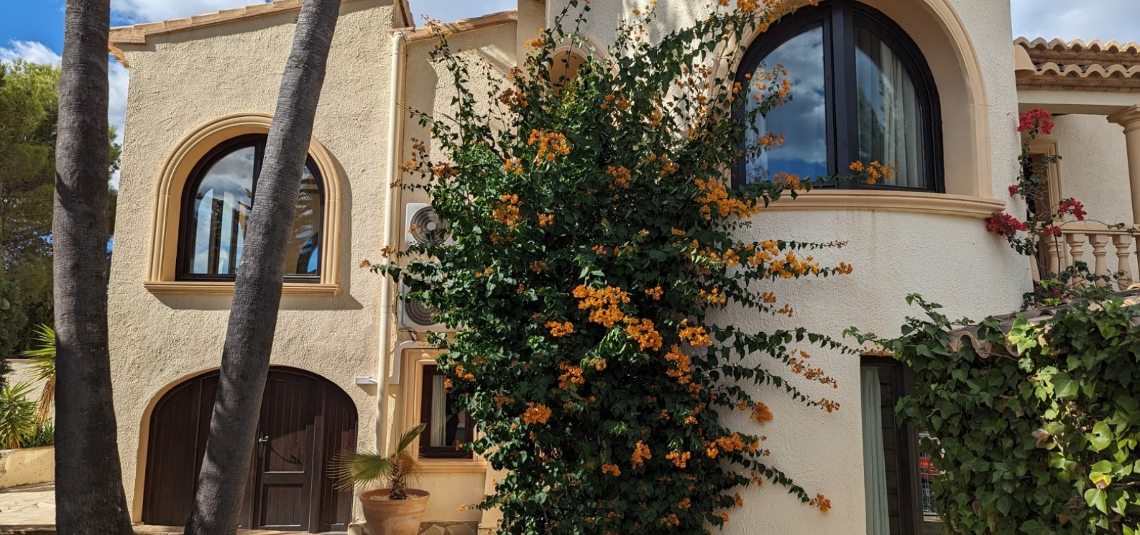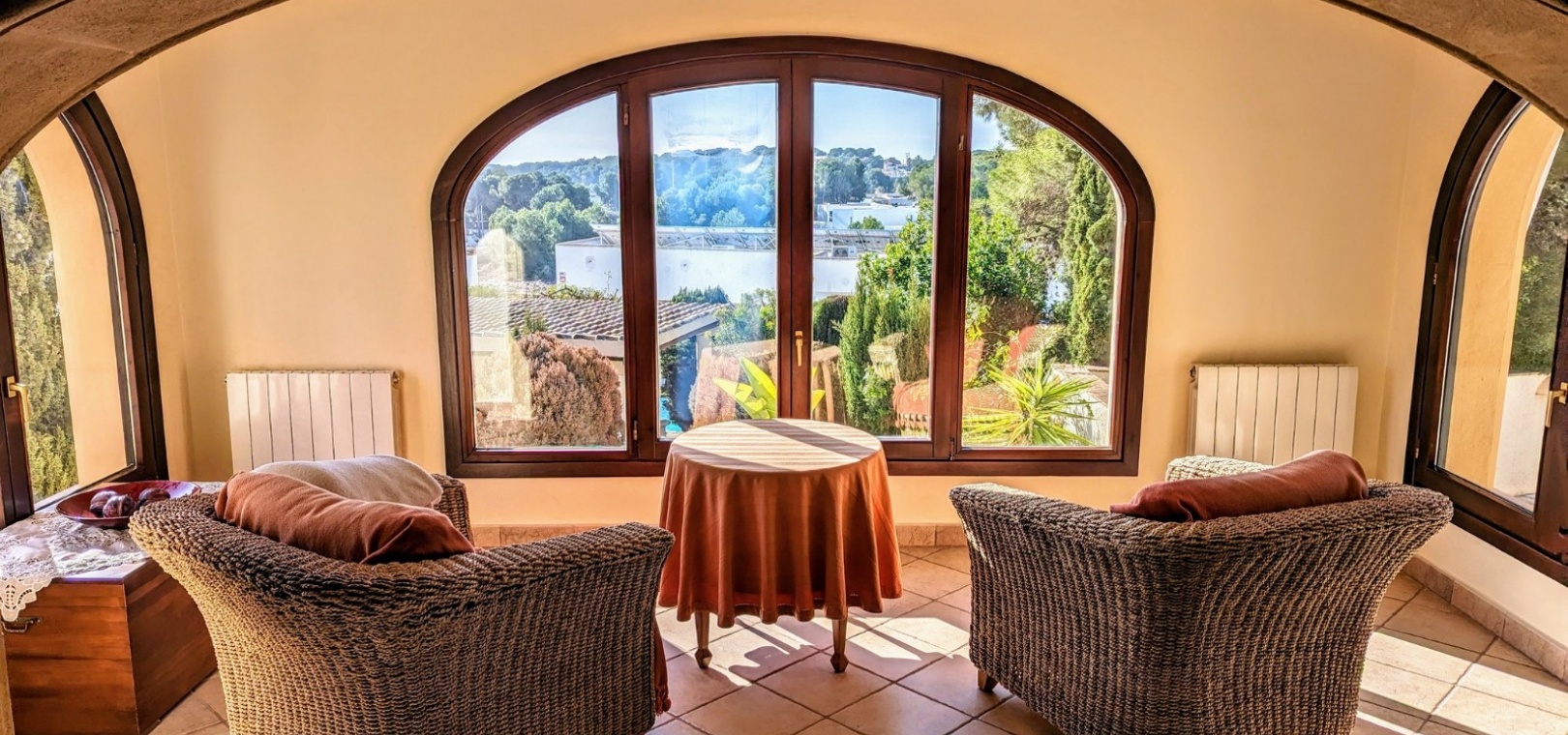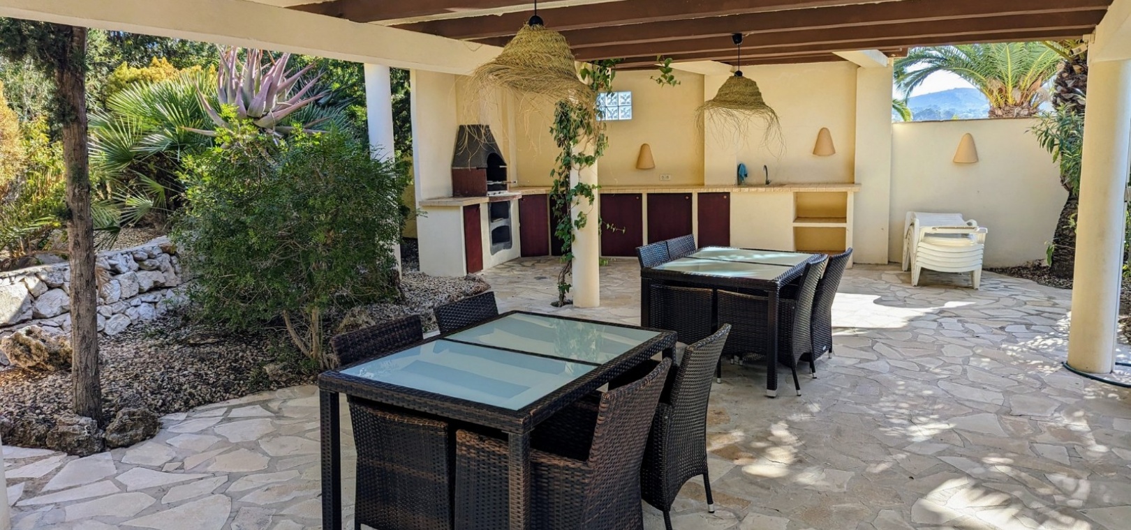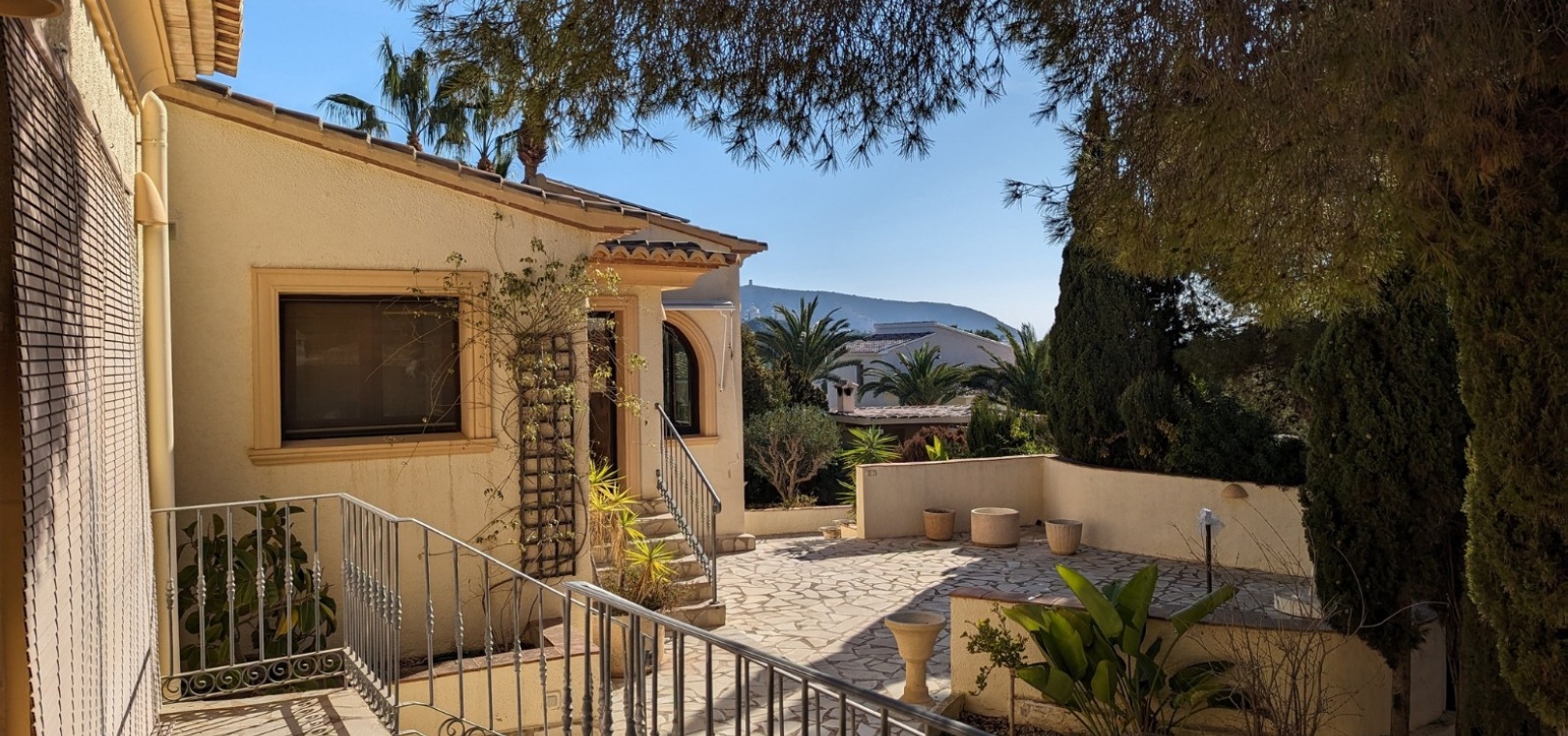 Diese geräumige, traditionelle Villa mit etwas Meerblick befindet sich in günstiger Lage, nur einen kurzen Spaziergang vom Strand, dem Stadtzentrum und dem Yachthafen in Moraira entfernt. Sie ist über zwei separate Etagen verteilt und befindet sich auf einem großen Grundstück mit sehr wenigen Stufen. Der Zugang erfolgt über eine ruhige Wohnstraße und dann über einen bewachten Parkplatz oder durch ein Fußgängertor. Vom Parkplatz aus führt eine Treppe hinauf zur Veranda und zur Eingangstür. Man betritt einen Flur, rechts befindet sich ein Tosca-Bogen, der zu einem Raum mit Ablagemöglichkeiten für Mäntel und Schuhe führt, und links ein weiterer Tosca-Bogen, der in das geräumige Wohnzimmer führt, das über einen Tosca-Kamin mit integriertem Holzofen verfügt. Am Ende des Wohnzimmers befindet sich ein Entspannungsbereich, von dem aus Sie den Garten und das Meer überblicken können. Durch eine Tür auf der linken Seite erreichen Sie das Schlafzimmer 4, ein helles und luftiges Zimmer, das auch als Büro genutzt werden könnte. Durch einen Torbogen gelangt man in einen langen Flur, gleich links geht es in eine geräumige Küche mit Esszimmer, ebenfalls mit Blick auf den Garten und das Meer. Die Küche ist mit weißen Schränken, hervorragenden Blue Pearl Granitarbeitsplatten und Edelstahlgeräten ausgestattet, darunter ein amerikanischer Kühlschrank mit Gefrierfach. Der Essbereich hat eine Treppe, die zu einer offenen Terrasse führt. Weiter unten im Flur finden Sie zwei Schlafzimmer, die durch ein Duschbad getrennt sind, und einen Abstellraum im Flur. Am Ende des Flurs befindet sich das luxuriöse Hauptschlafzimmer, ein großer Raum mit einem Tosca-Bogen, der zu einem Entspannungsbereich mit Gartenblick und einer Treppe hinunter zu einer offenen Terrasse führt. Gegenüber dem Schlafzimmer und in einem kleinen Flur befindet sich das großartige Hauptbadezimmer mit Dusche, Badewanne und einem großen Waschtisch mit Waschbecken für sie und ihn. Die untere Ebene der Villa besteht aus einem Abstellraum, einem zweiten großen Abstellraum und einem Gästeapartment mit Wohn-/Essbereich mit Kochnische, einem Duschbad und einem Schlafzimmer. Im Außenbereich ist die Villa von einem gut bepflanzten, aber pflegeleichten Garten und mehreren offenen Terrassen für verschiedene Tageszeiten umgeben. Ein paar Stufen hinunter von dieser Ebene befindet sich eine herrliche überdachte Sommerküche mit einem überdachten Essbereich, ideal für Mahlzeiten im Freien an einem heißen Tag. zwei Stufen hinunter von hier befindet sich der völlig private Poolbereich, der einen wunderschönen 10,5 x 5,5 m großen, solarbeheizten Pool und eine Pool-Dusche umfasst. Am Eingang befindet sich ein Carport mit eigenem Abstellraum. Es gibt auch einen großen Keller, in dem die Solaranlage untergebracht ist.- Eckdaten:- Erbaut 1971- Gegenwärtige Besitzer seit 2003 und Villa renoviert seit 2004- Solarwasseranlage installiert 2010- Solarstromanlage installiert 2023- Gaszentralheizung- Klimaanlage- Doppelt verglaste Fenster mit Climalit-Glas- Einige Fenster mit Holzläden und Moskitonetzen- Markisen an den Wohnzimmerfenstern- Sicherheitssystem mit Kameras- Hauswasserfiltersystem- 10.5 x 5,5m Pool solarbeheizt - Glasfaser-Internet verfügbar- Jährliche Steuern 888,07€- Entfernungen:- 1km zum Strand und Stadtzentrum- 1,5km zum Yachthafen- 3,7km zum Golfplatz- 9.2km zur Autobahnauffahrt in Benissa- Diese Immobilie hat eine sehr erfolgreiche Vermietungsgeschichte- Um Enttäuschungen zu vermeiden, organisieren Sie noch heute Ihren Besuch in dieser Villa!- Weitere Fotos und Drohnenvideo/Fotos folgen