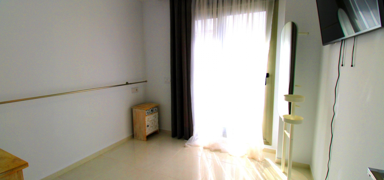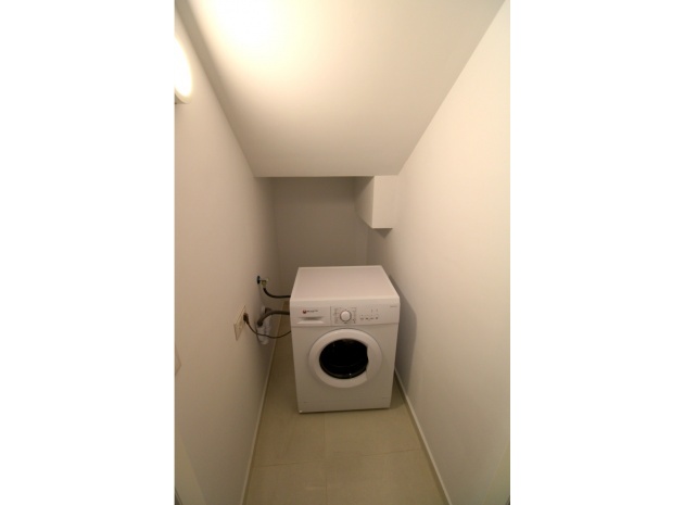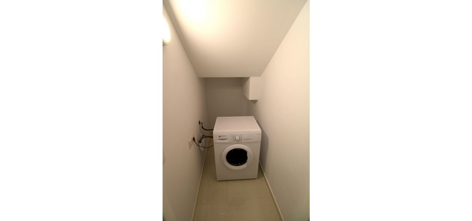 Im Erdgeschoss gibt es ein Wohn-/Esszimmer mit Türen zur verglasten Terrasse vor dem Haus, eine offene, voll ausgestattete Küche, 1 Doppelzimmer mit Einbauschränken und 1 Duschbad.