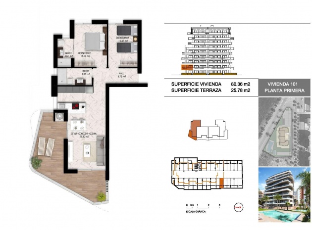 Modernes Gebäude mit 31 Wohnungen mit 2 Schlafzimmern und Penthäusern mit 2 und 3 Schlafzimmern, alle mit 2 Bädern, offener Küche mit Wohnzimmer, Einbauschränken, großzügigen Terrassen ab 20m², Tiefgarage und geschlossenem Abstellraum.