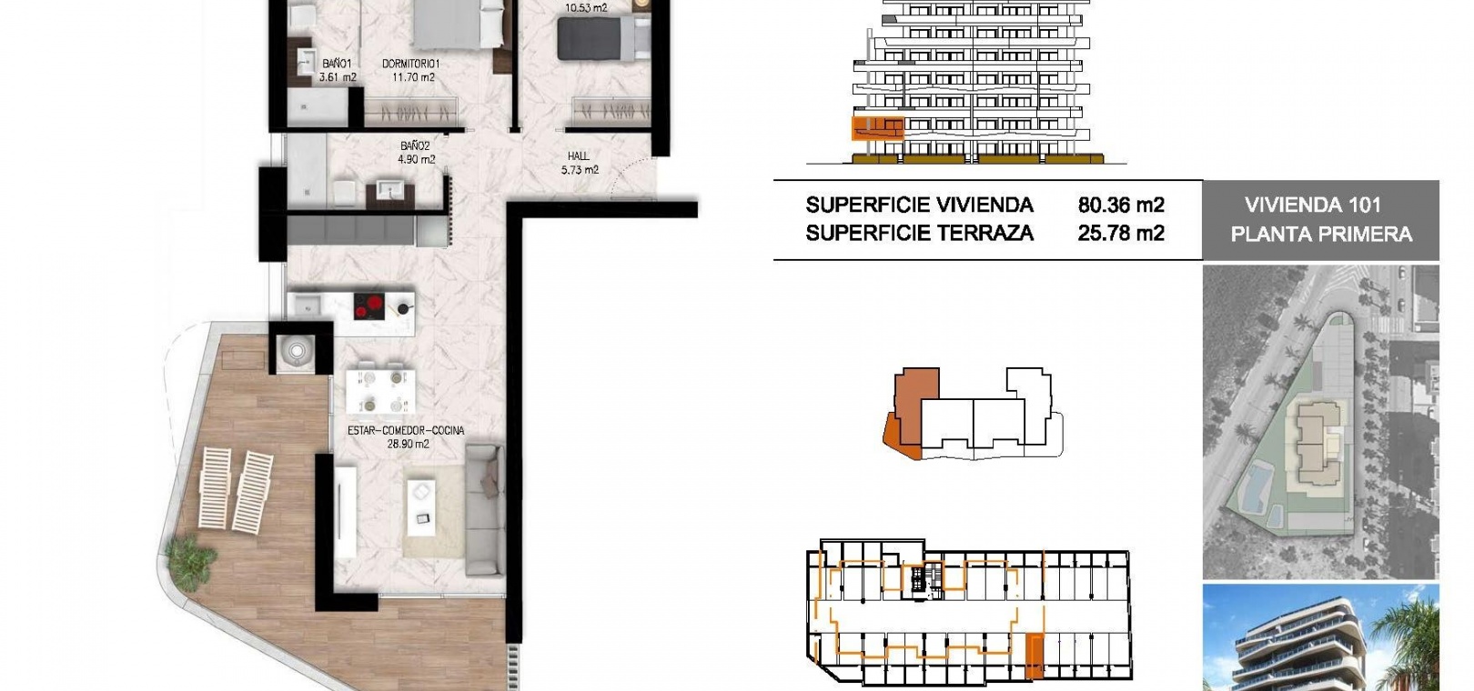 Das Gebäude wird aus 9 Etagen bestehen, von denen die höchsten Penthäuser mit Hauptterrasse und privatem Solarium sein werden.
