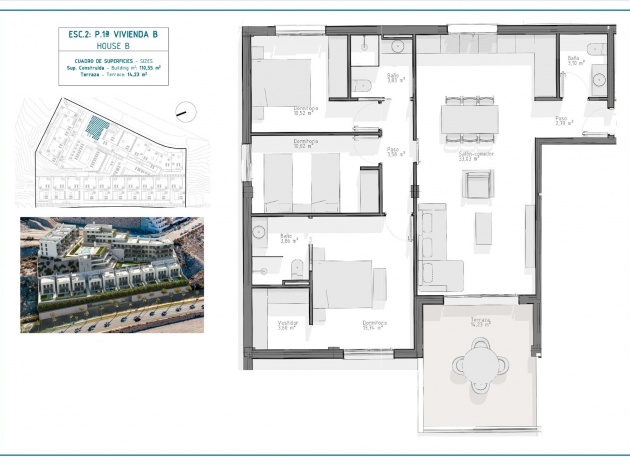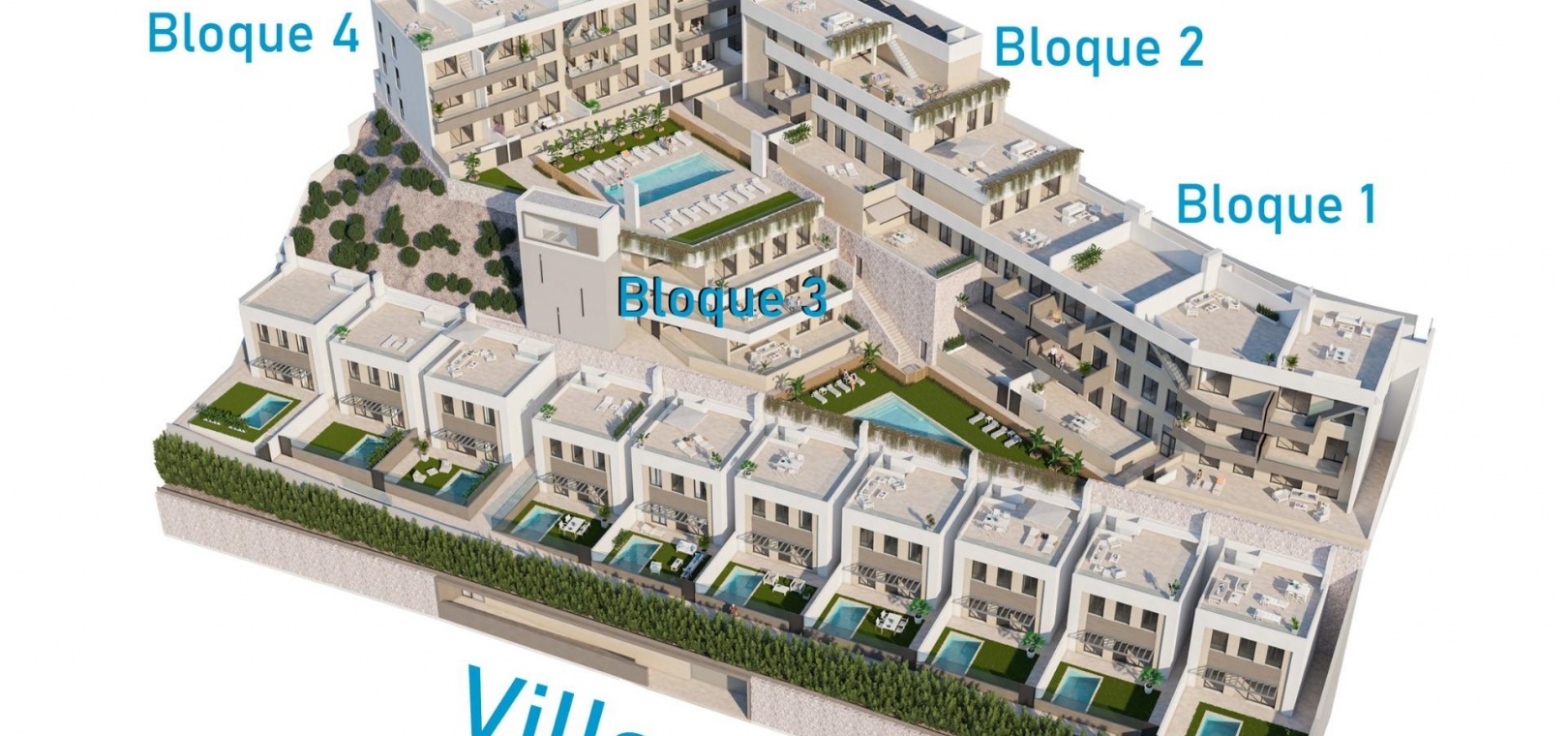 Der Neubaukomplex besteht aus 36 Wohnungen mit 3 und 2 Schlafzimmern, verteilt auf 4 moderne Blöcke, ausgestattet mit 2 Gemeinschaftspools und einer Gemeinschaftsgarage mit Parkplatz und Abstellraum für jede Immobilie; und 10 eleganten Villen mit 4 Schlafzimmern und 3 Bädern, jede mit eigenem Pool.