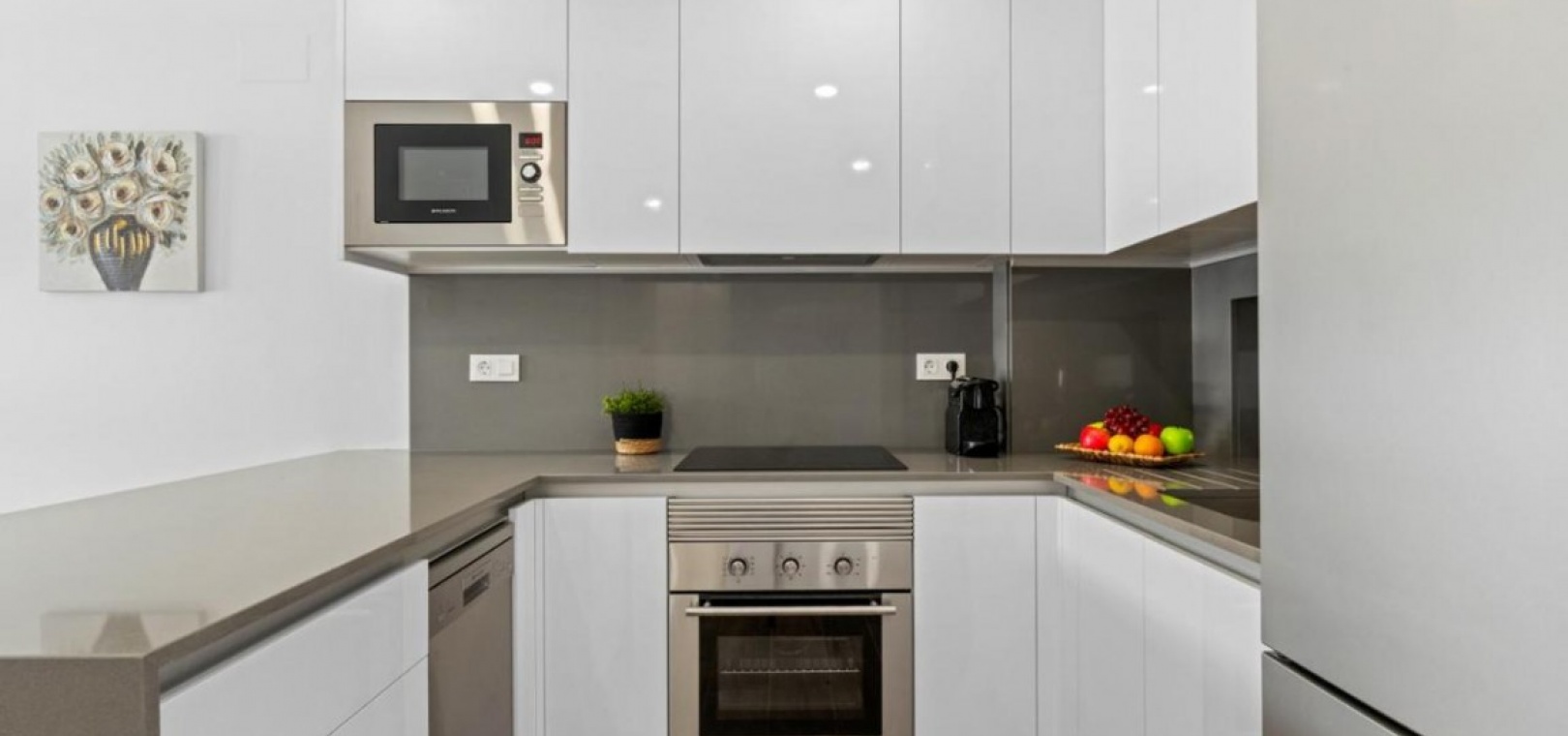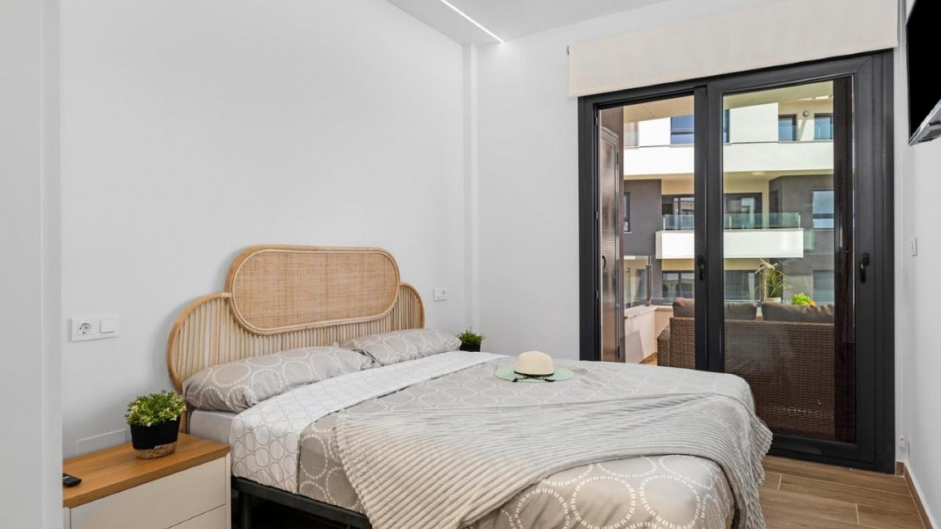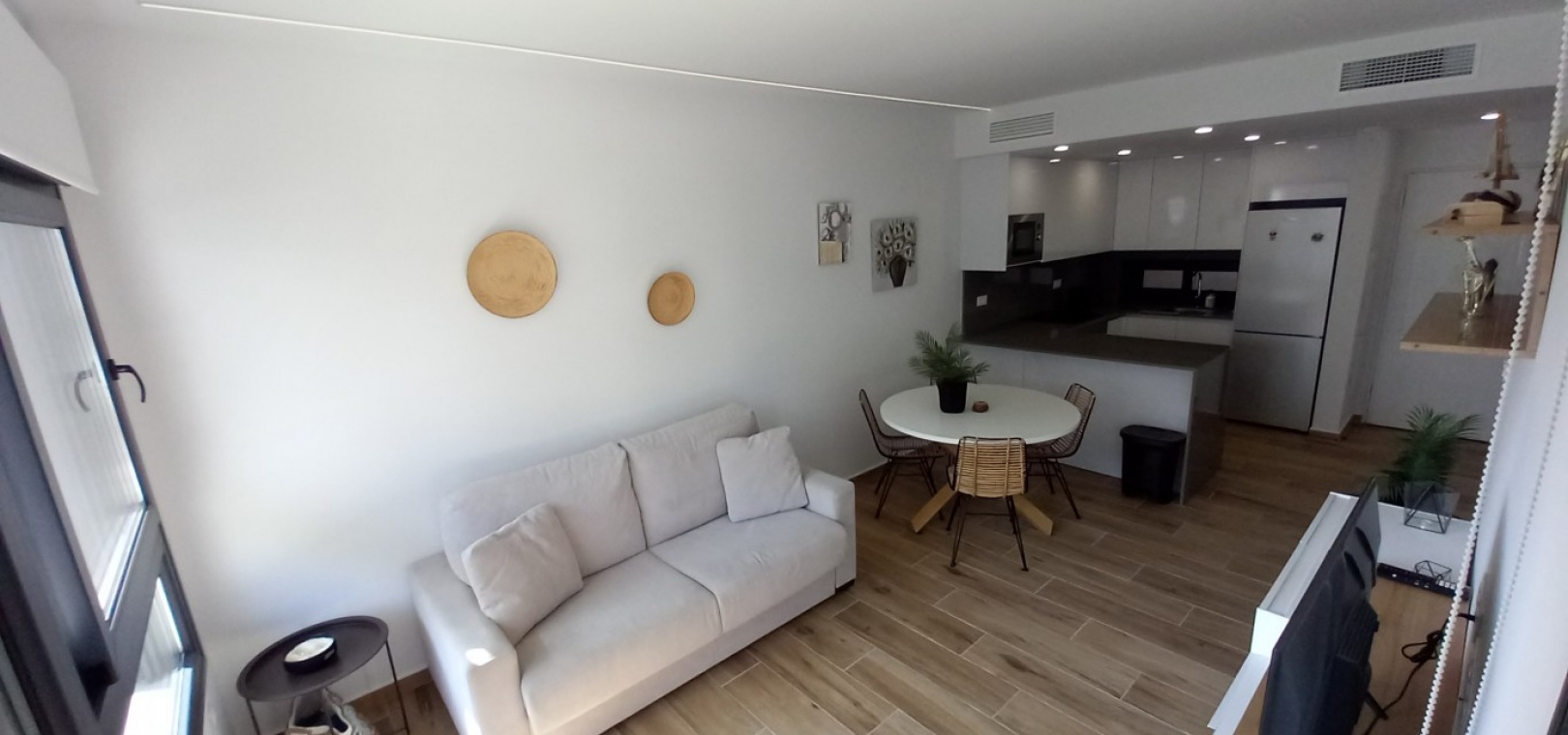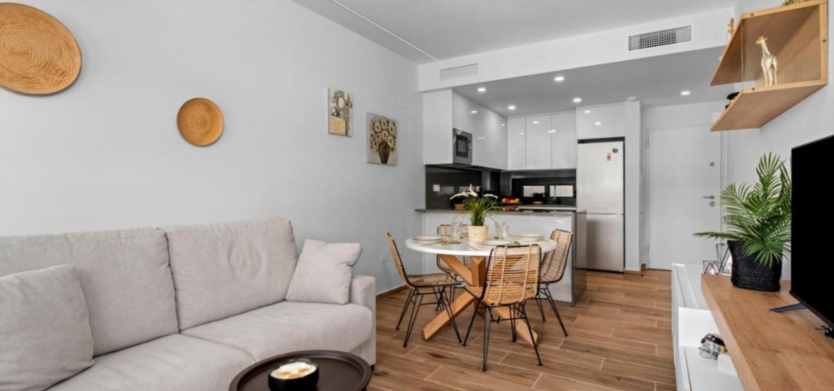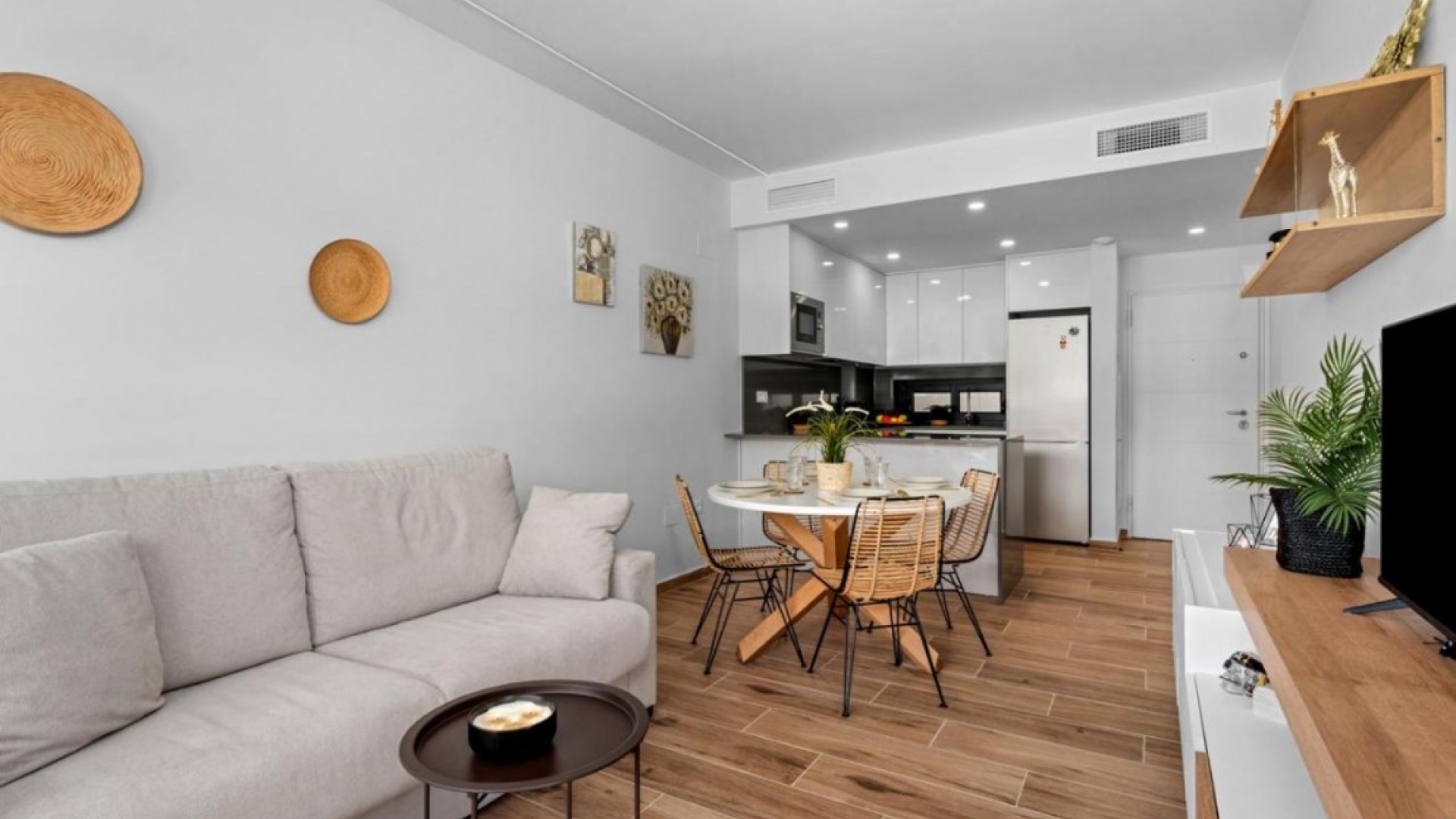 Helles und luftiges Wohn-/Esszimmer mit Türen zum Balkon, offene, voll ausgestattete Küche, 1 Hauptschlafzimmer mit Einbauschränken und eigenem Duschbad, 1 Zweibettzimmer, 1 Familienduschbad, Balkon, Gemeinschaftspool, Gemeinschaftsparkplatz, Aufzug, Tennisplatz, Kinderspielplatz und noch viel mehr.