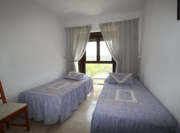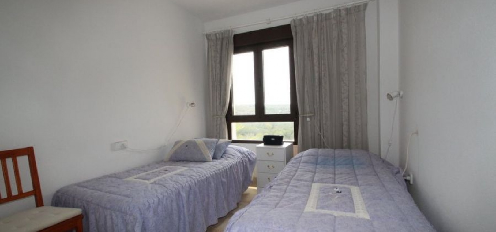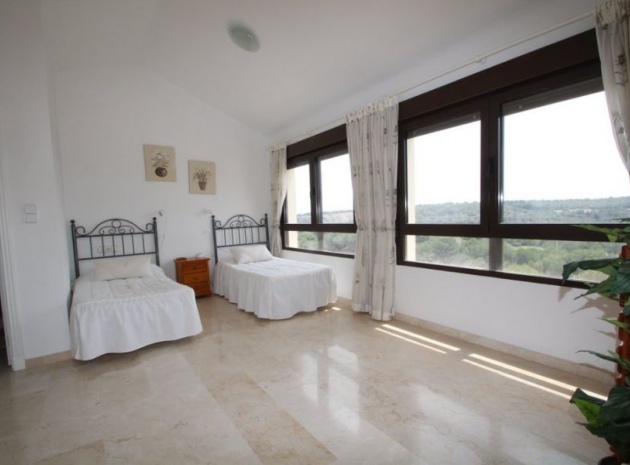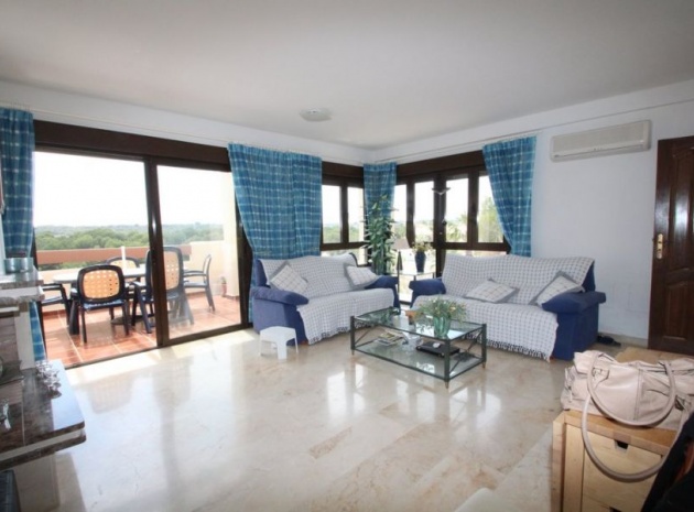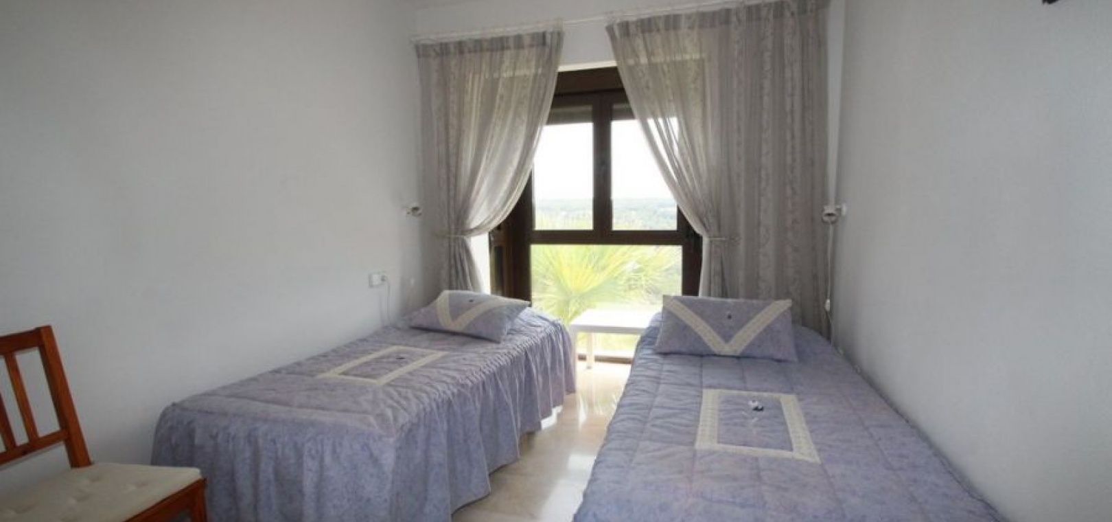 Im ersten Stock finden wir ein Wohn-/Esszimmer mit warmer und kalter Klimaanlage, eine offene Einbauküche mit Waschküche, 2 Doppelzimmer mit Einbauschränken, ein Familienbadezimmer und eine nach Süden ausgerichtete Terrasse mit Blick auf den Golfplatz Sie können die Sonne von morgens bis 15 Uhr genießen.