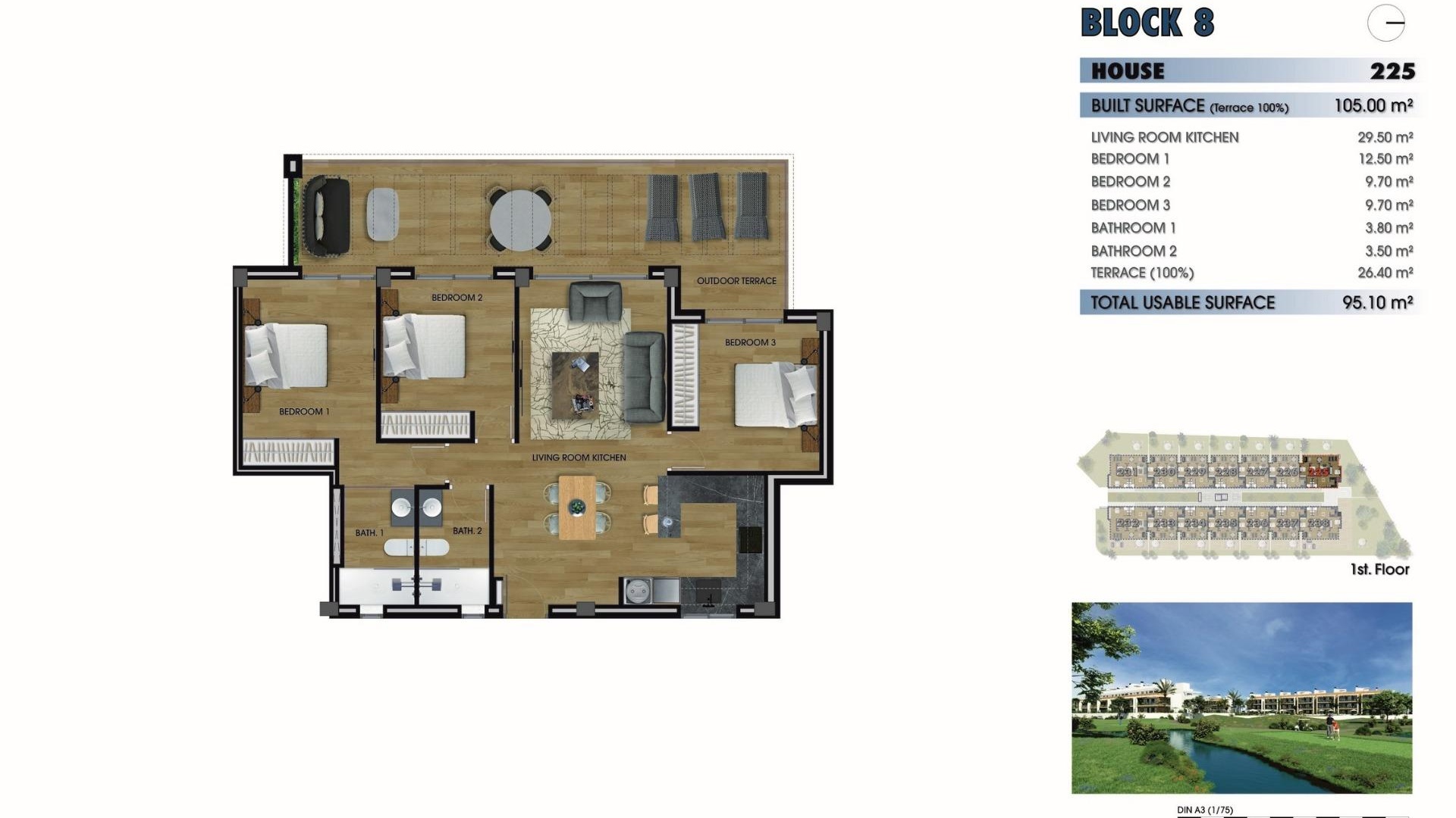 Dieser erstaunliche Komplex wird aus 244 Wohnungen mit 2 und 3 Schlafzimmern bestehen, die in 8 Blöcke und 20 private Villen aufgeteilt sind.
