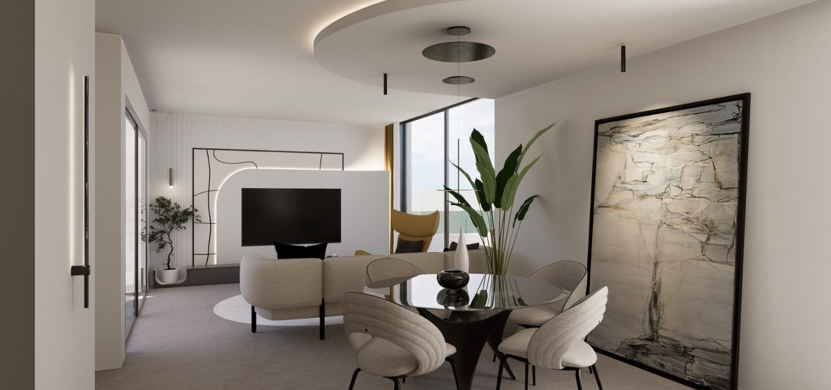 • Geräumiges Wohn- und Esszimmer mit großen Fenstern, die eine Komfortzone mit natürlichem Licht im ganzen Haus schaffen.