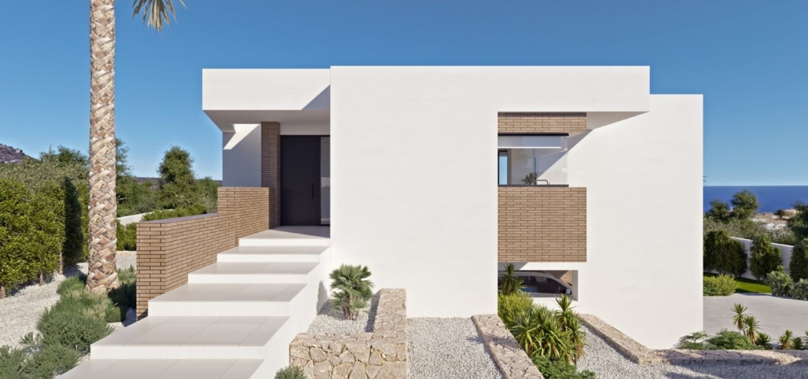 Die geometrischen Formen, die die Außenstruktur umreißen, sind mit Glas und grauen Natursteinplatten verkleidet, die einen Kontrast zum Weiß der Fassade bilden. Der Kubus, der die Terrasse des Hauptschlafzimmers beherbergt, ragt hervor und blickt direkt auf das Meer.