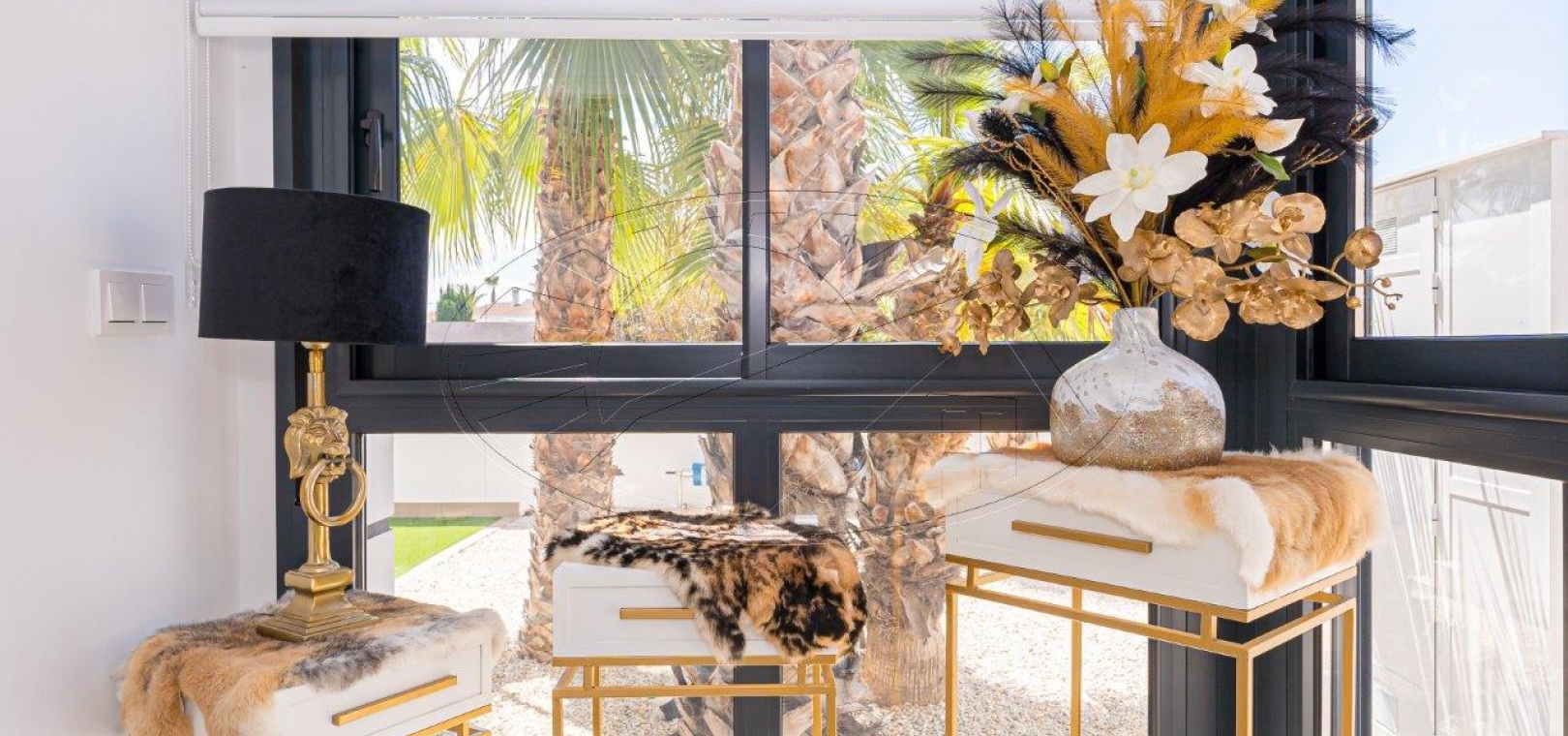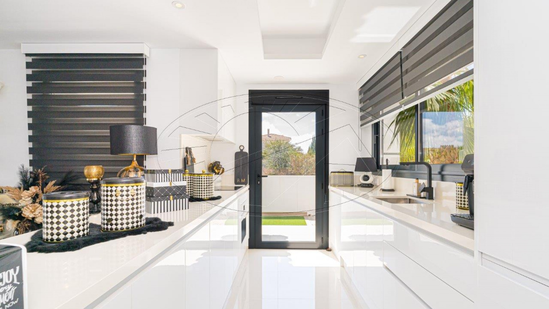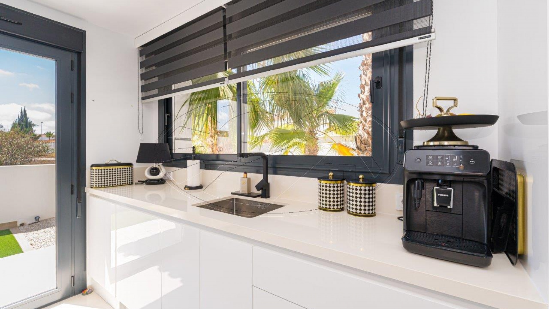 Die Villa verfügt über eine geräumige Auffahrt und einen schönen Carport. Der Eingang führt zum Essbereich und zur modernen offenen Küche mit Bosch-Einbaugeräten und einer Kochinsel. Der Sitzbereich des Wohnzimmers bietet einen Blick auf die Veranda, den Garten und den Swimmingpool. Im Erdgeschoss gibt es außerdem ein geräumiges Badezimmer mit ebenerdiger Dusche, Toilette und Badezimmermöbeln sowie ein Doppelzimmer mit Einbauschrank und viel Licht.