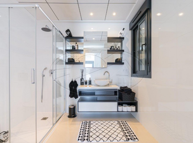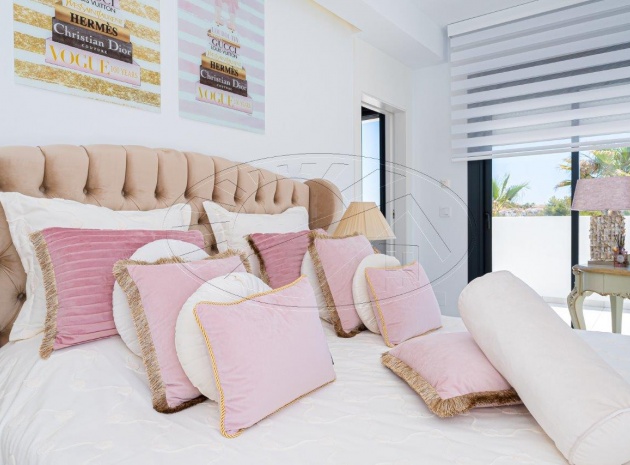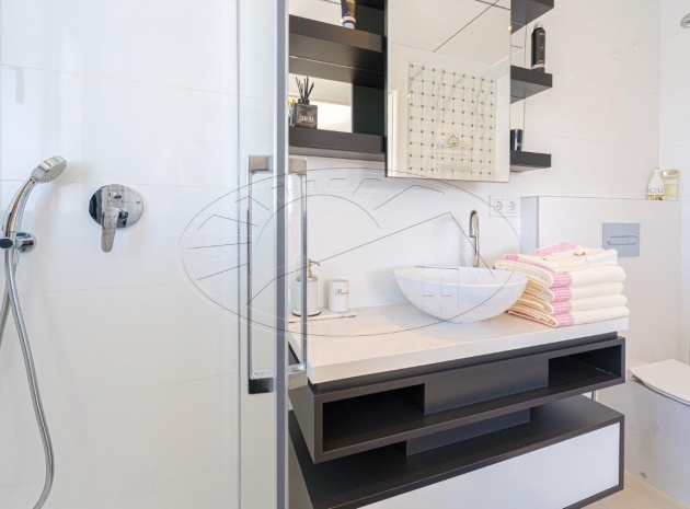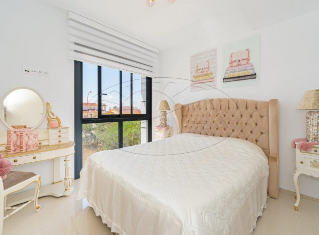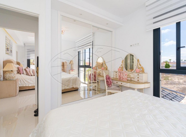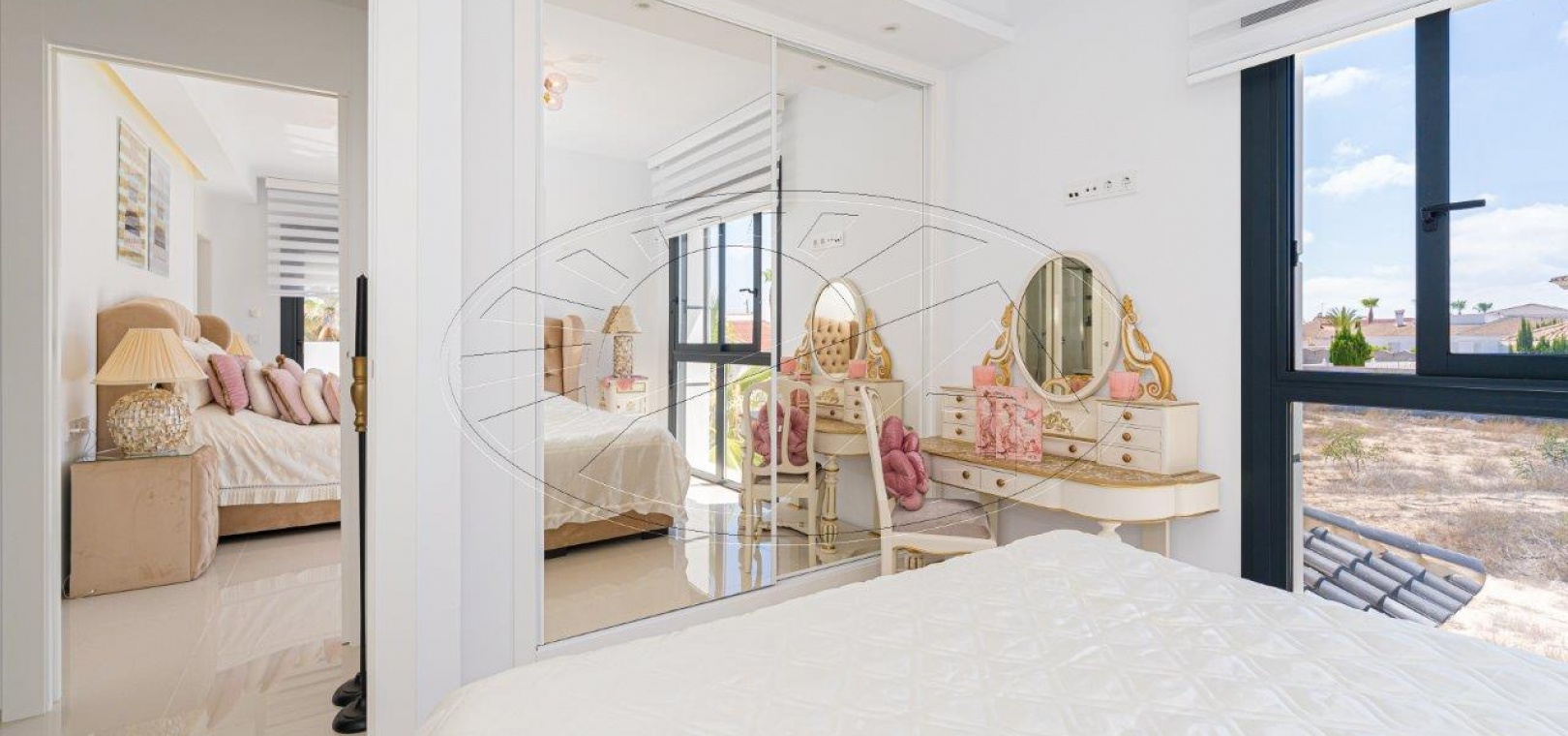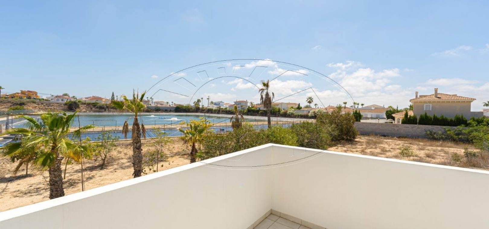 Im 1. Stock befinden sich zwei weitere geräumige Schlafzimmer, beide mit eigenem Badezimmer mit ebenerdiger Dusche, Waschbecken und Toilette. Das Hauptschlafzimmer verfügt über einen begehbaren Kleiderschrank und bietet Zugang zu einer schönen L-förmigen Terrasse von ca. 30 m² mit herrlicher Aussicht über Ciudad Quesada, Rojales und La Mata, einschließlich des natürlichen Sees.