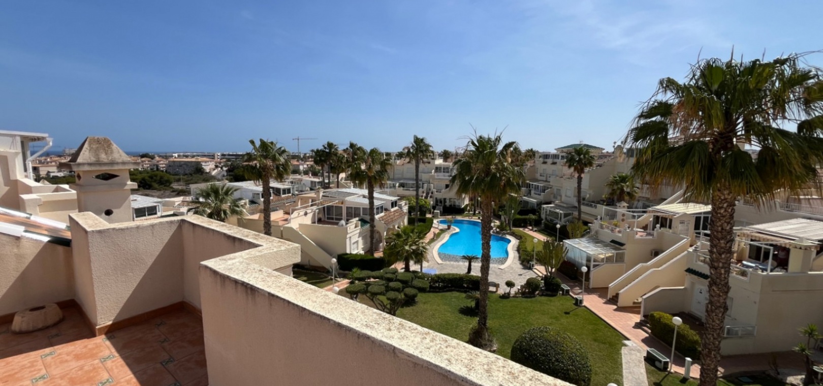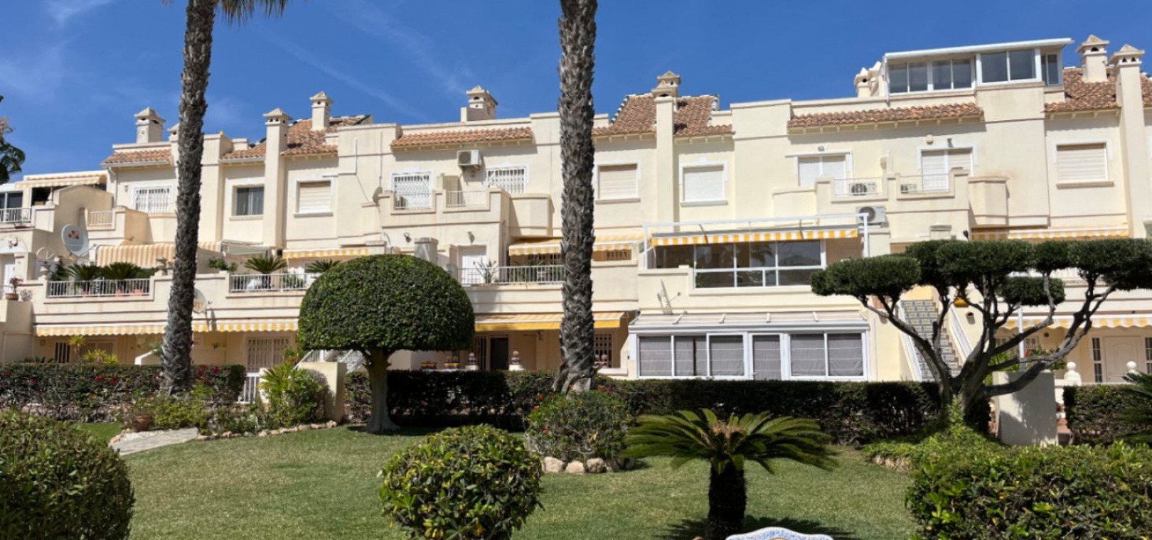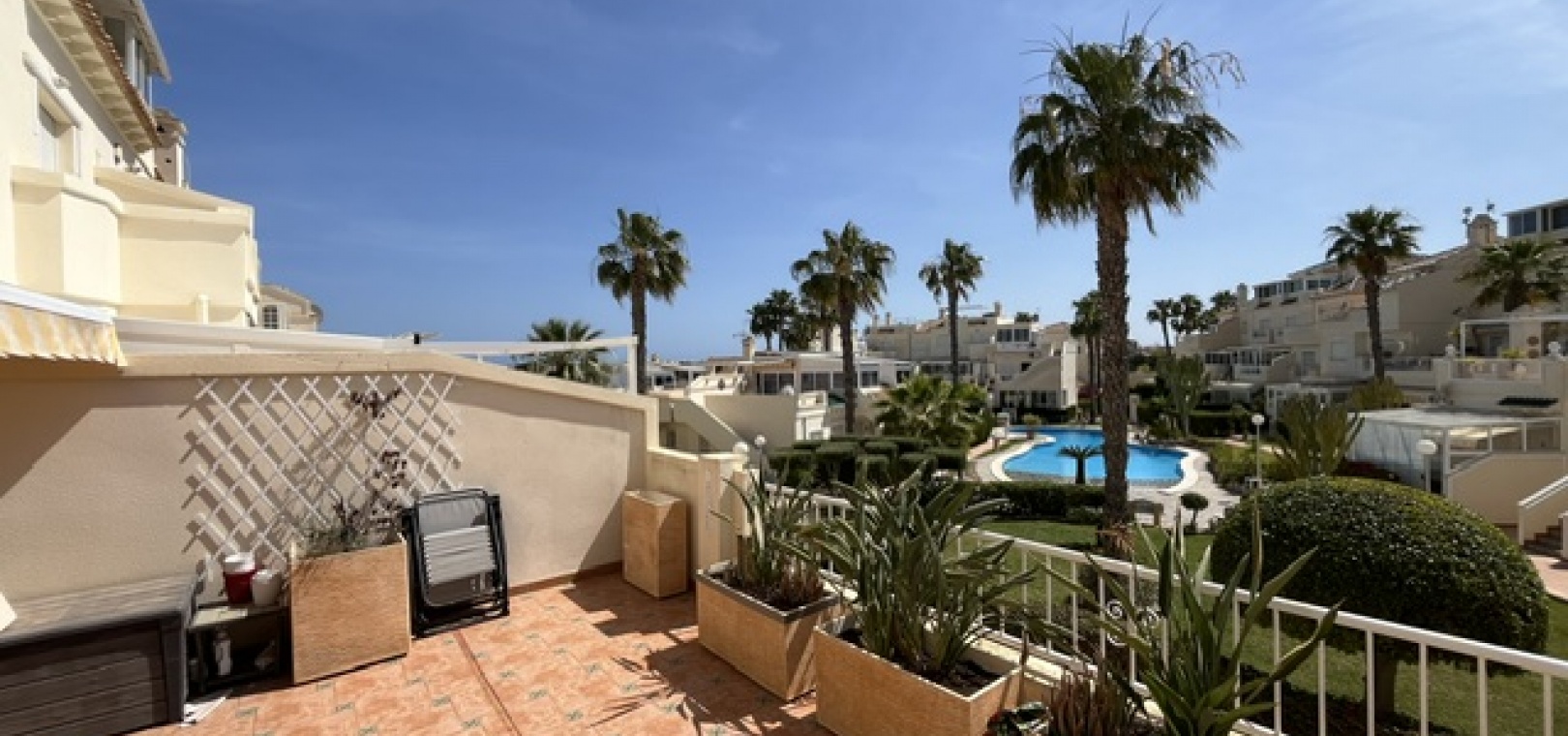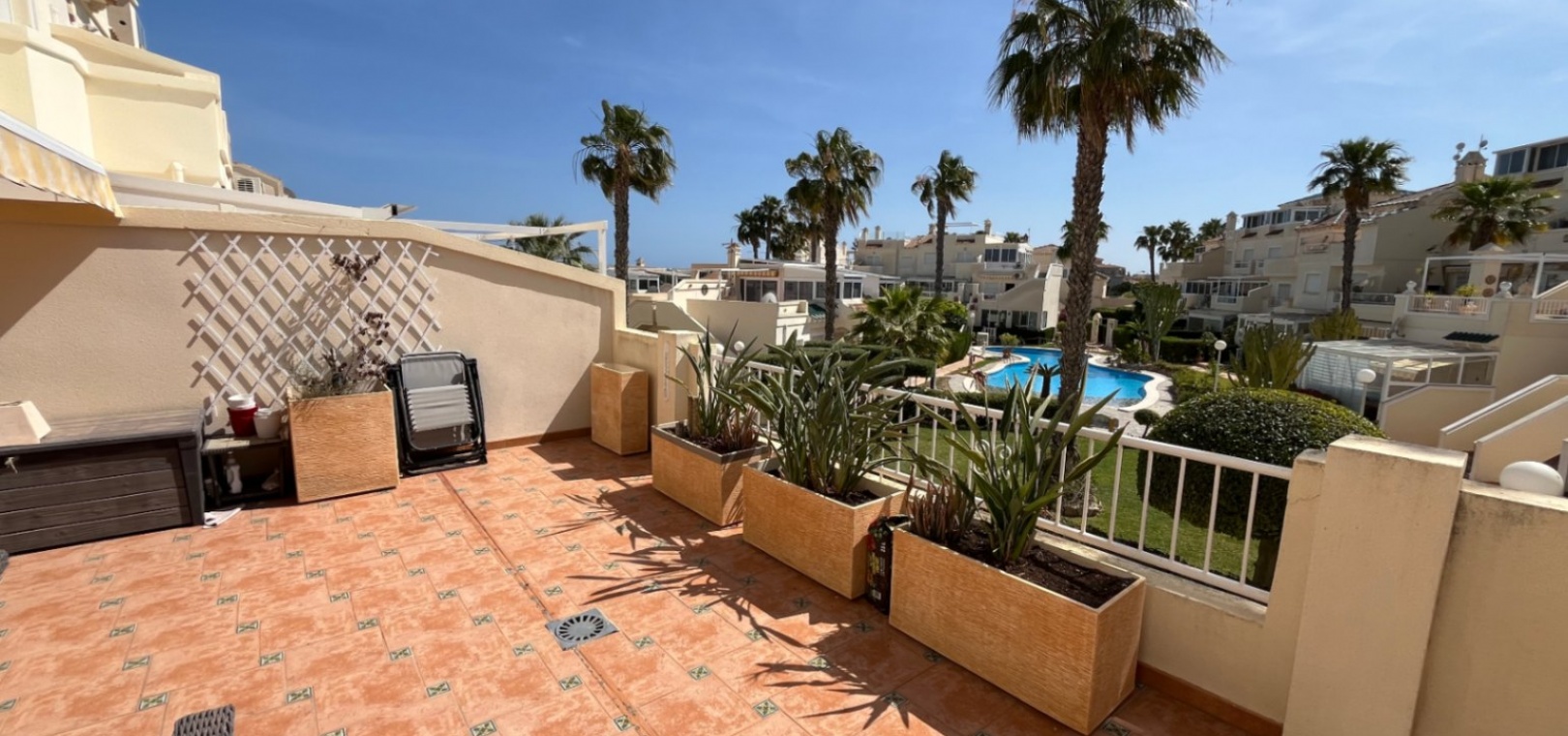 Eine nach Süden ausgerichtete Maisonette-Wohnung mit 2 Schlafzimmern und 2 Bädern und einem privaten Solarium auf dem Dach in Res. Miraflores III, Playa Flamenca, Costa Blanca Süd.