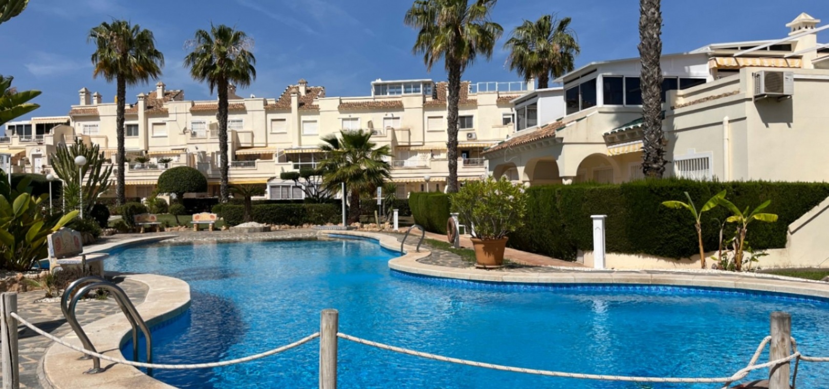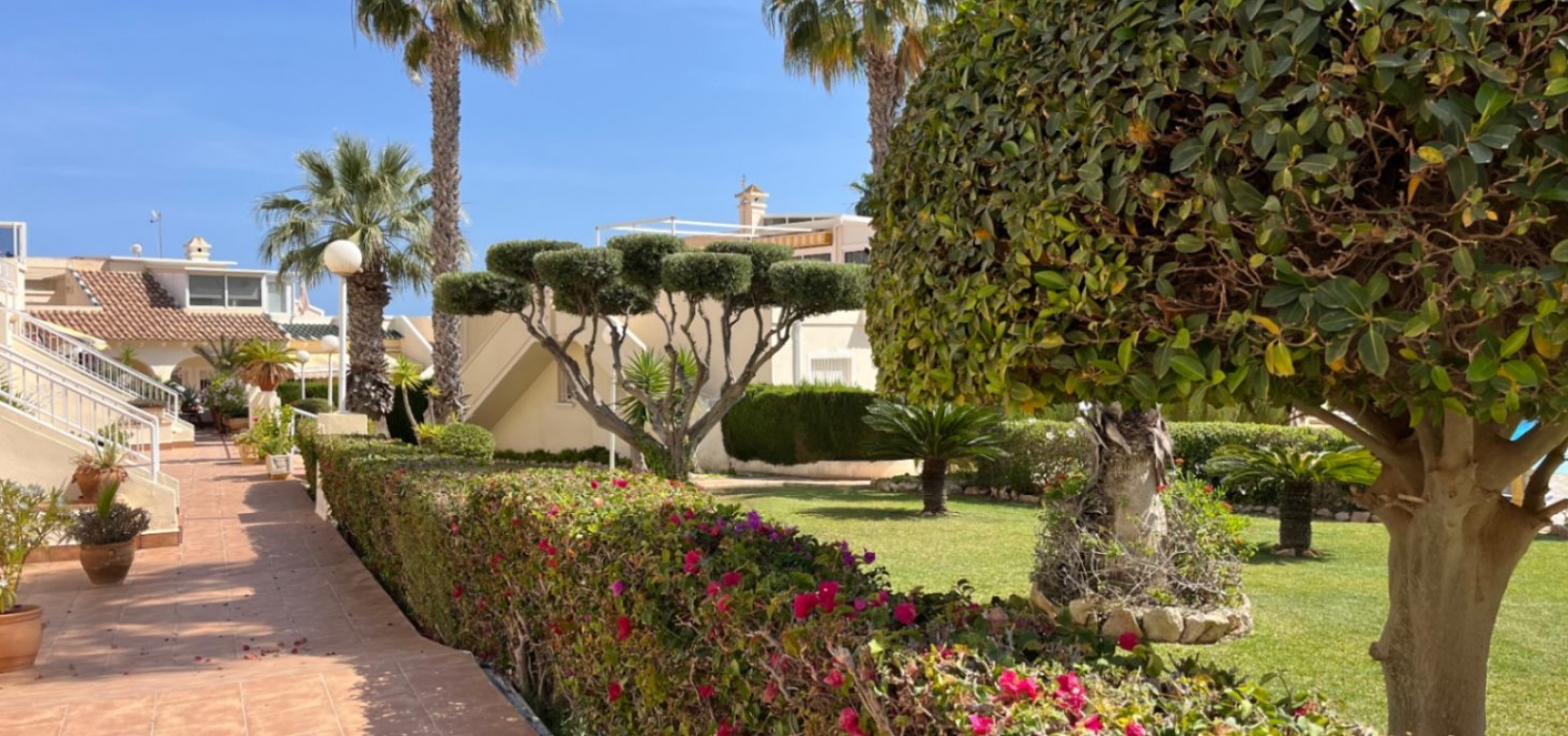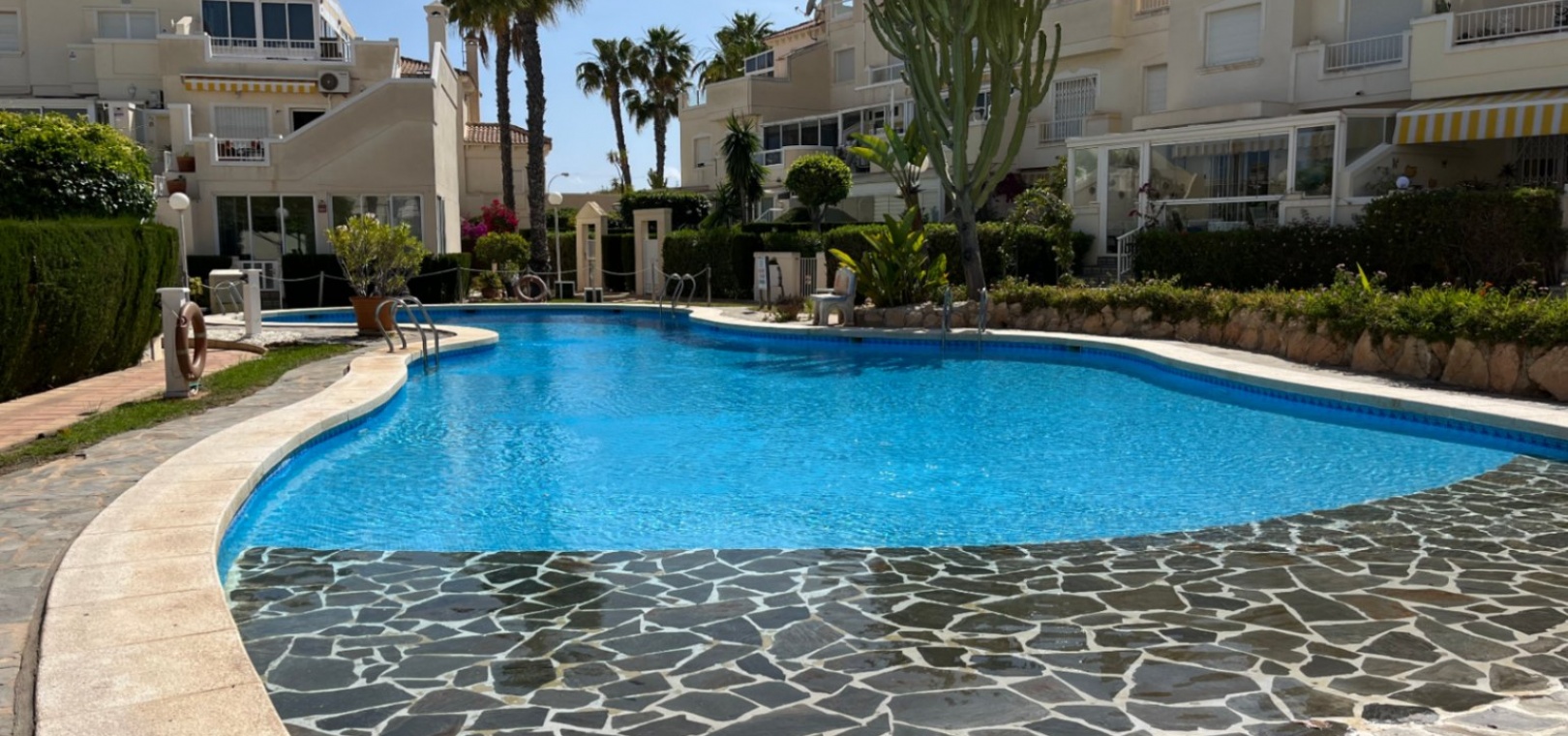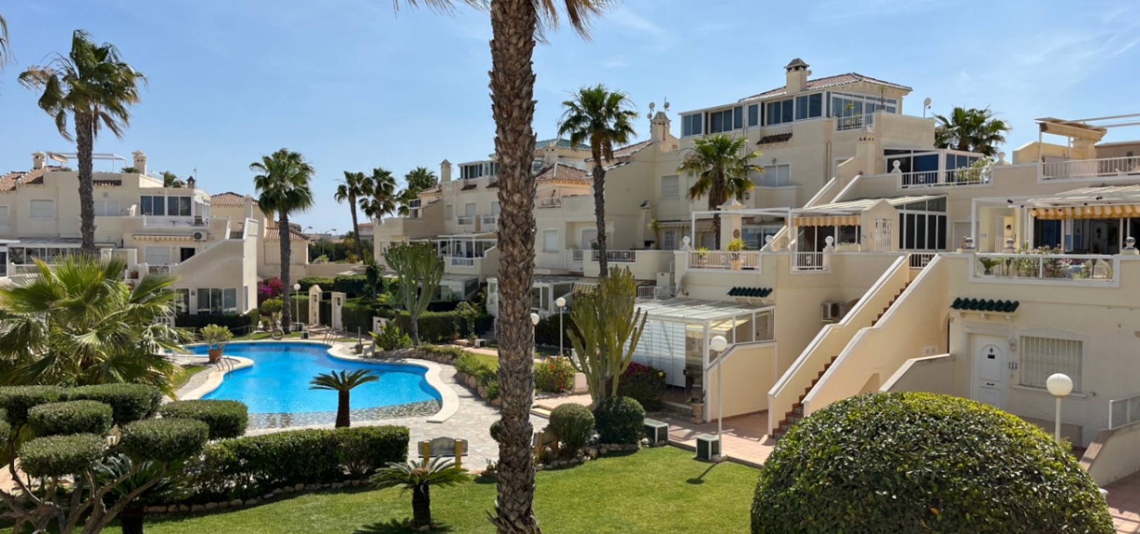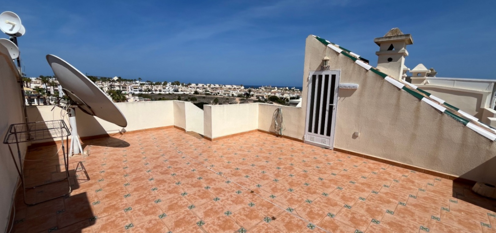 Eine nach Süden ausgerichtete Maisonette-Wohnung mit 2 Schlafzimmern und 2 Bädern und einem privaten Solarium auf dem Dach in Res. Miraflores III, Playa Flamenca, Costa Blanca Süd.
