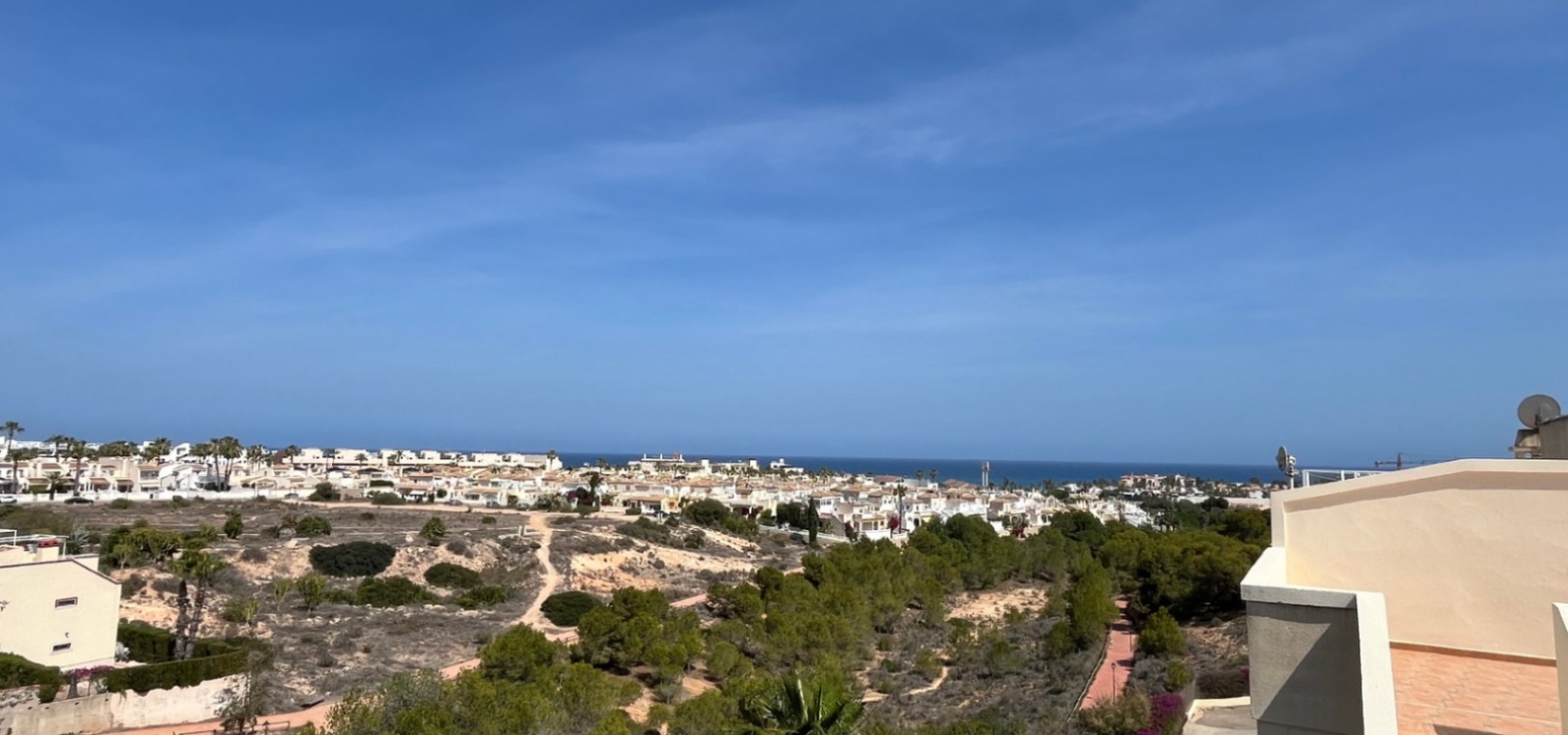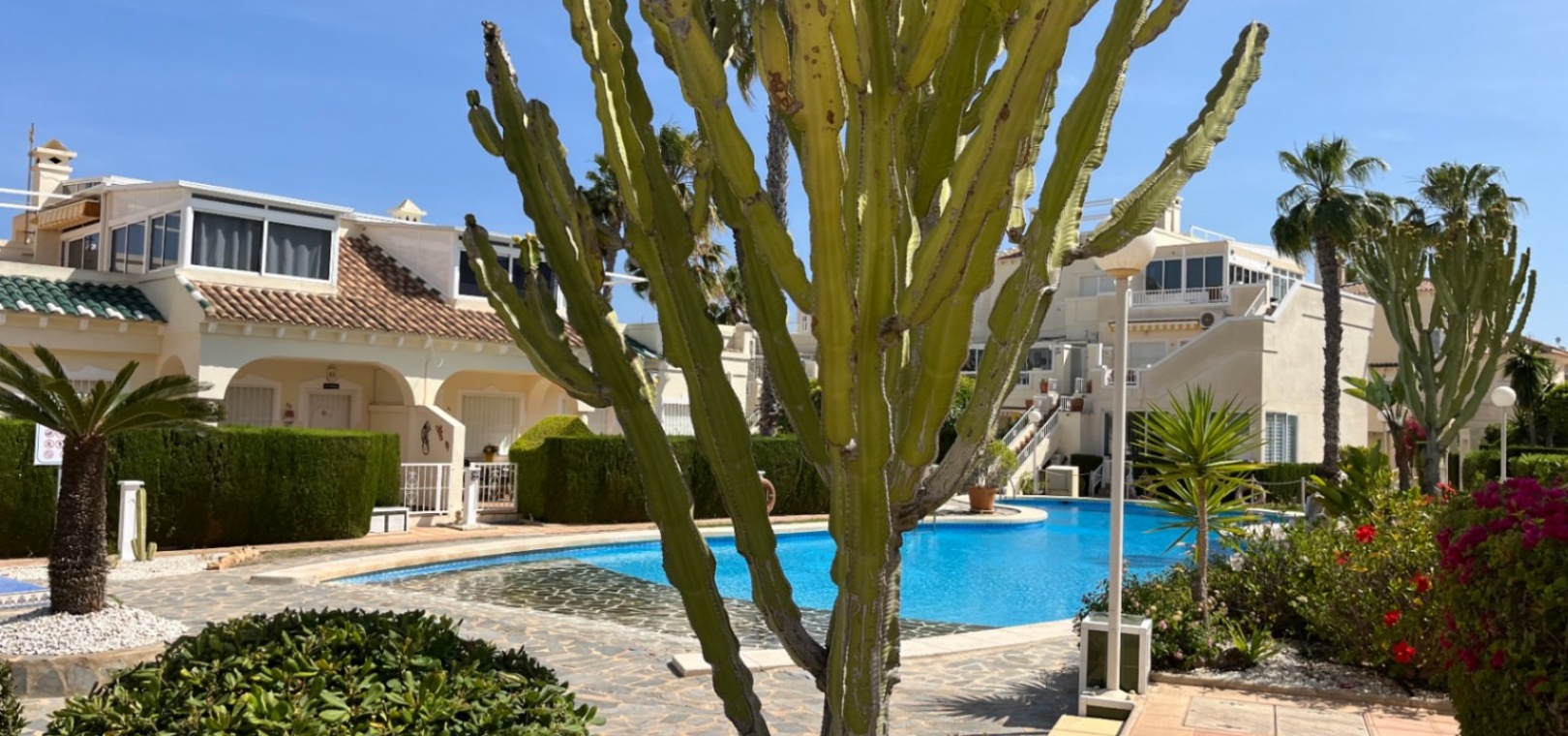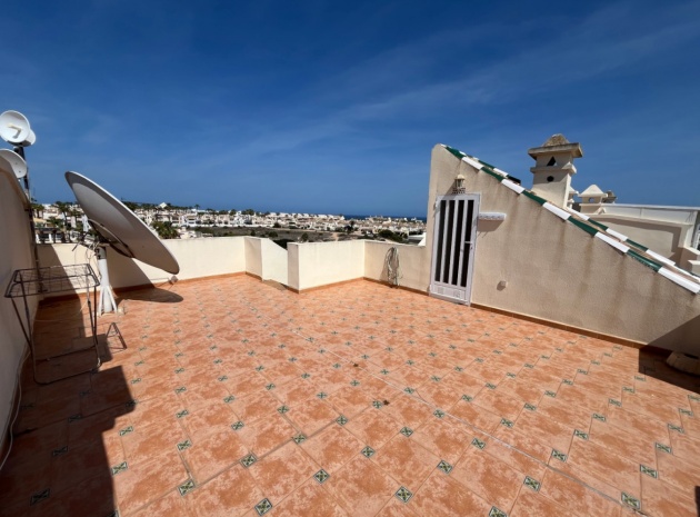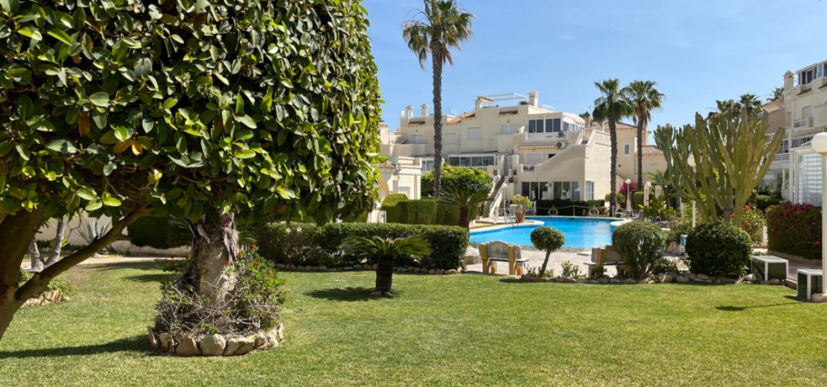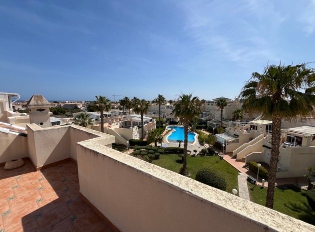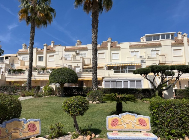 Eine nach Süden ausgerichtete Maisonette-Wohnung mit 2 Schlafzimmern und 2 Bädern und einem privaten Solarium auf dem Dach in Res. Miraflores III, Playa Flamenca, Costa Blanca Süd.