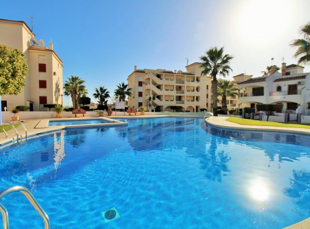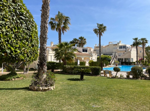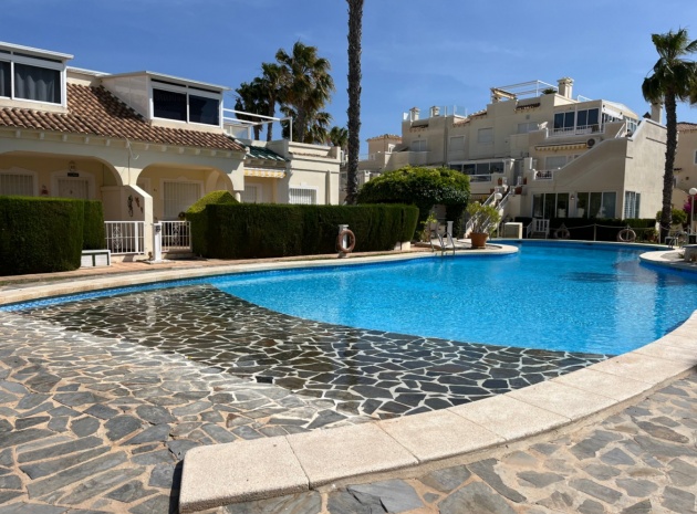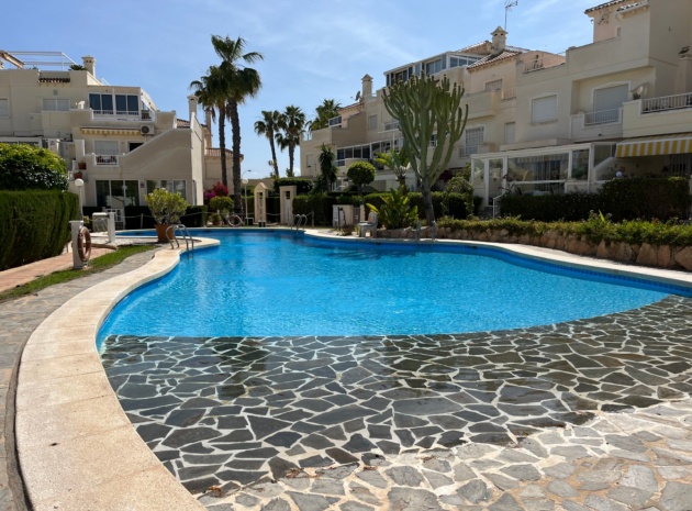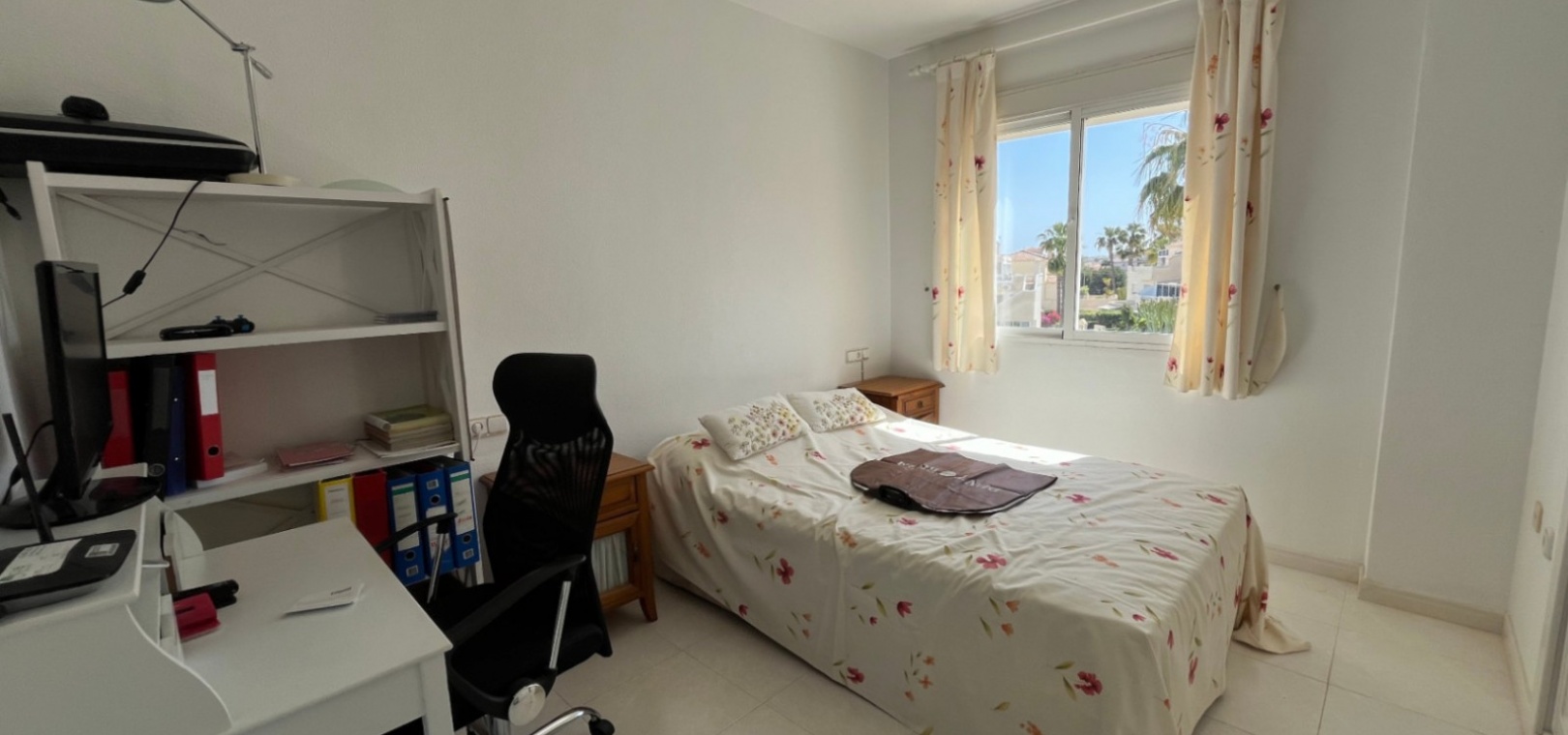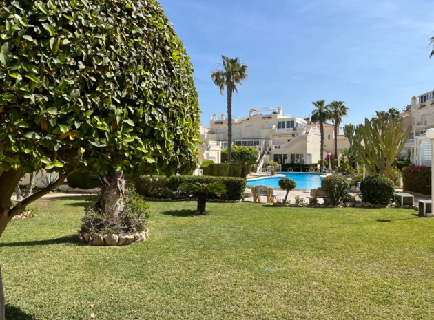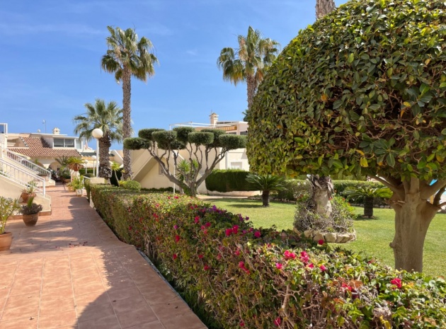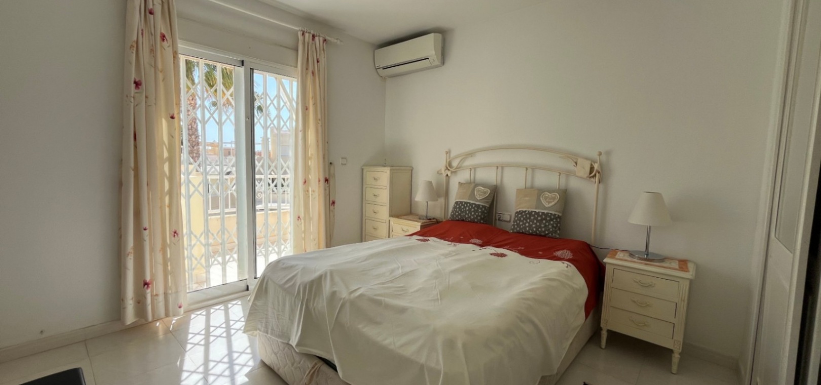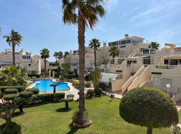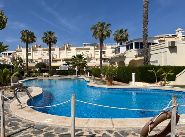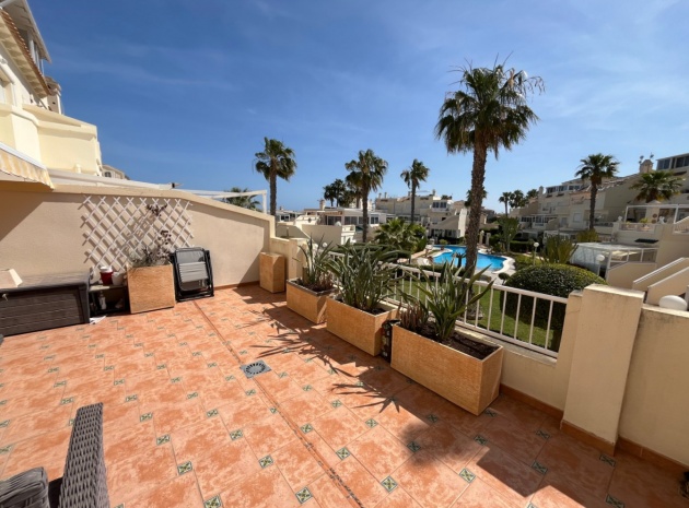 Eine nach Süden ausgerichtete Maisonette-Wohnung mit 2 Schlafzimmern und 2 Bädern und einem privaten Solarium auf dem Dach in Res. Miraflores III, Playa Flamenca, Costa Blanca Süd.