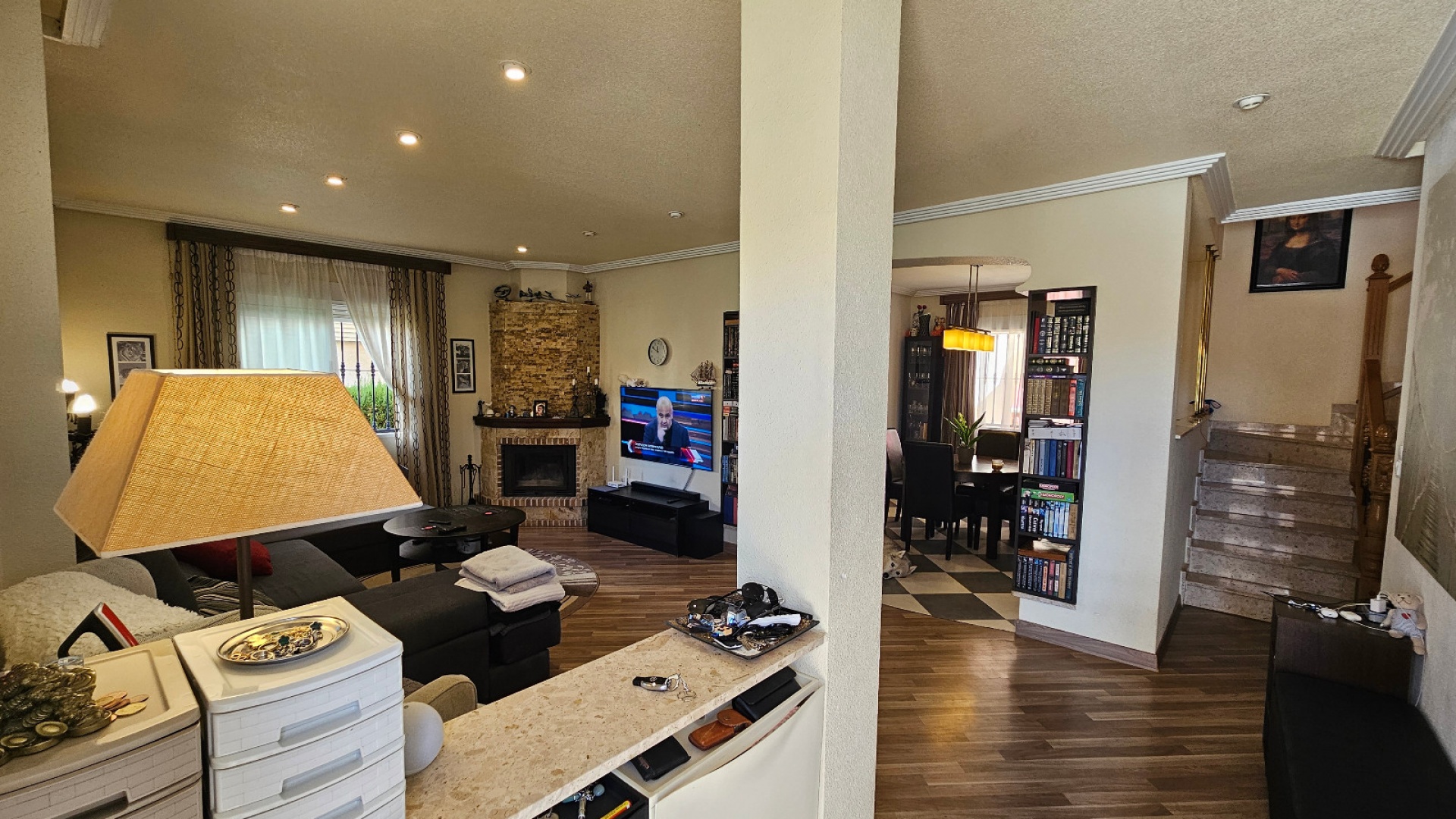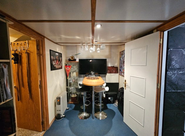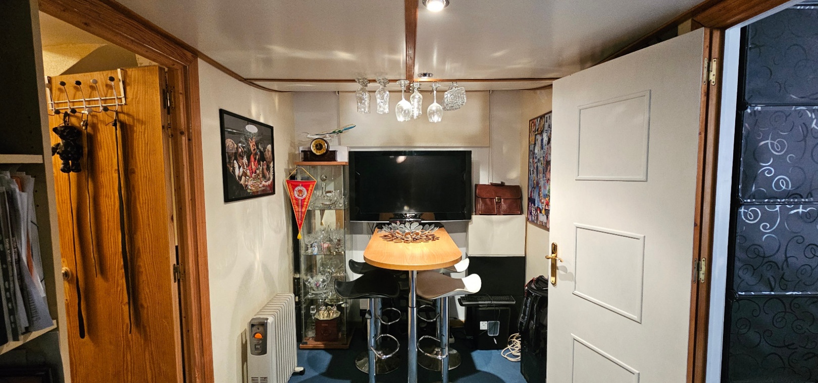 Im Erdgeschoss gibt es ein geräumiges L-förmiges Wohn-/Esszimmer mit einem Kamin und einer Klimaanlage (warm/kalt), eine erweiterte, neu eingerichtete separate Küche und ein Duschraum.