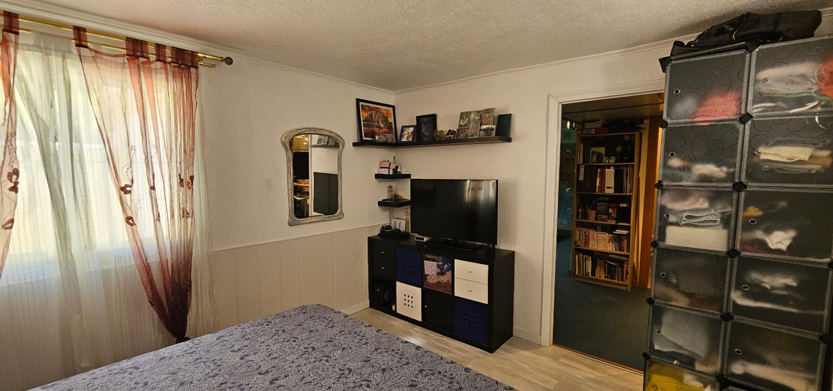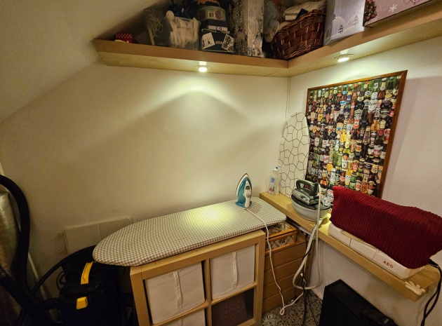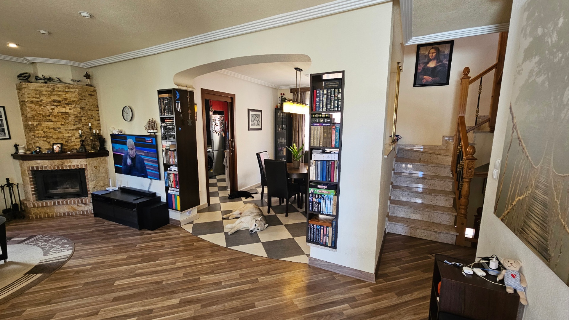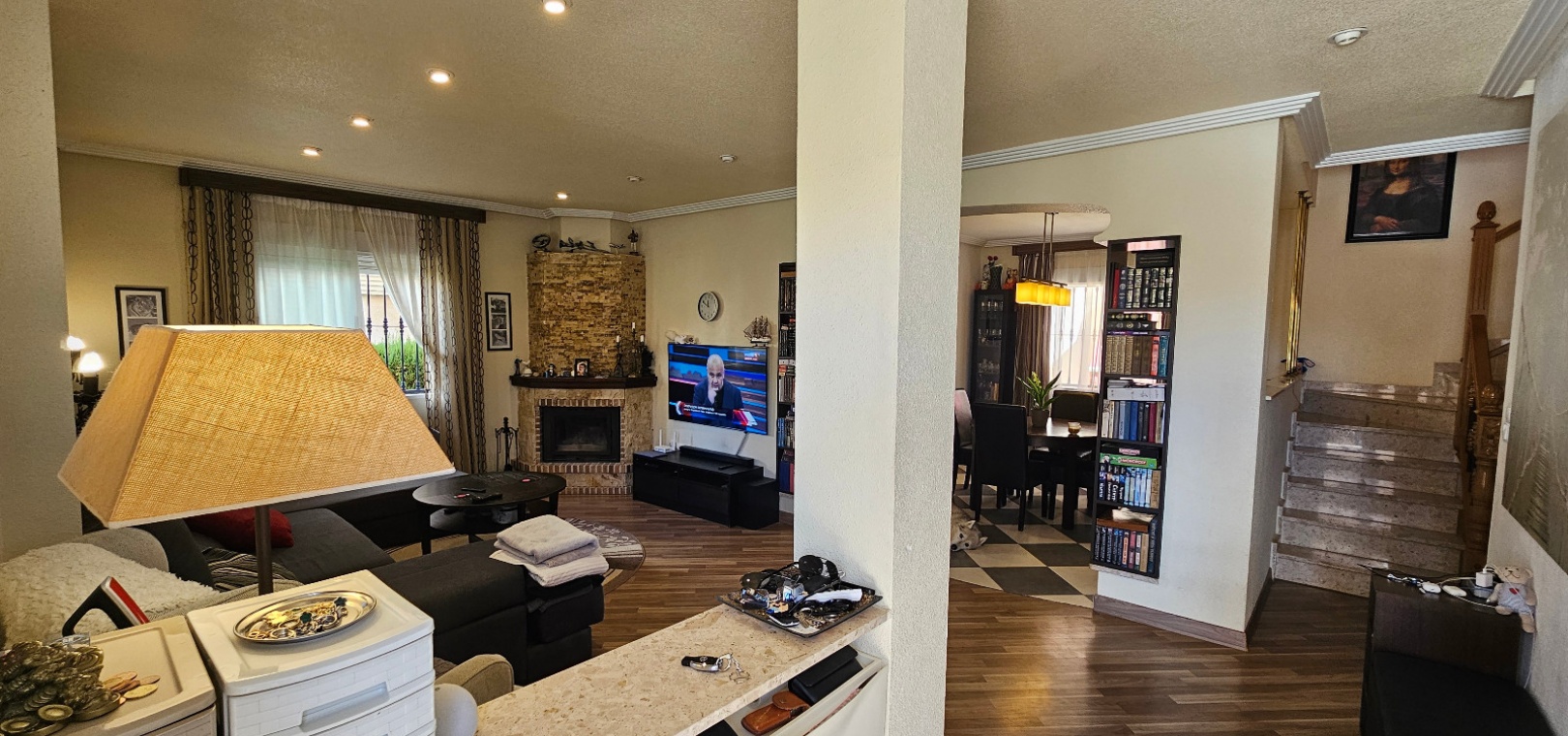 Im Erdgeschoss gibt es ein geräumiges L-förmiges Wohn-/Esszimmer mit einem Kamin und einer Klimaanlage (warm/kalt), eine erweiterte, neu eingerichtete separate Küche und ein Duschraum.