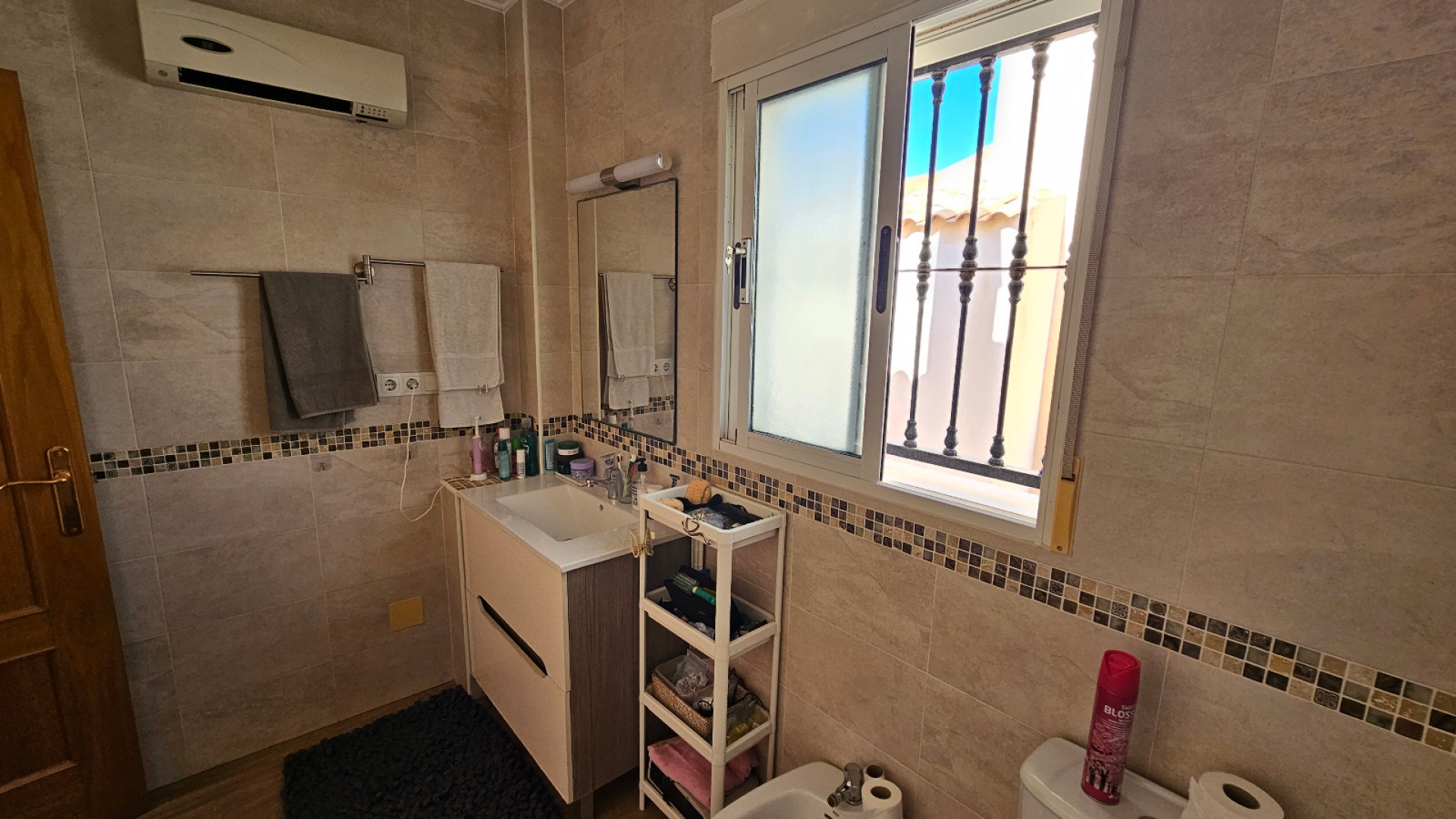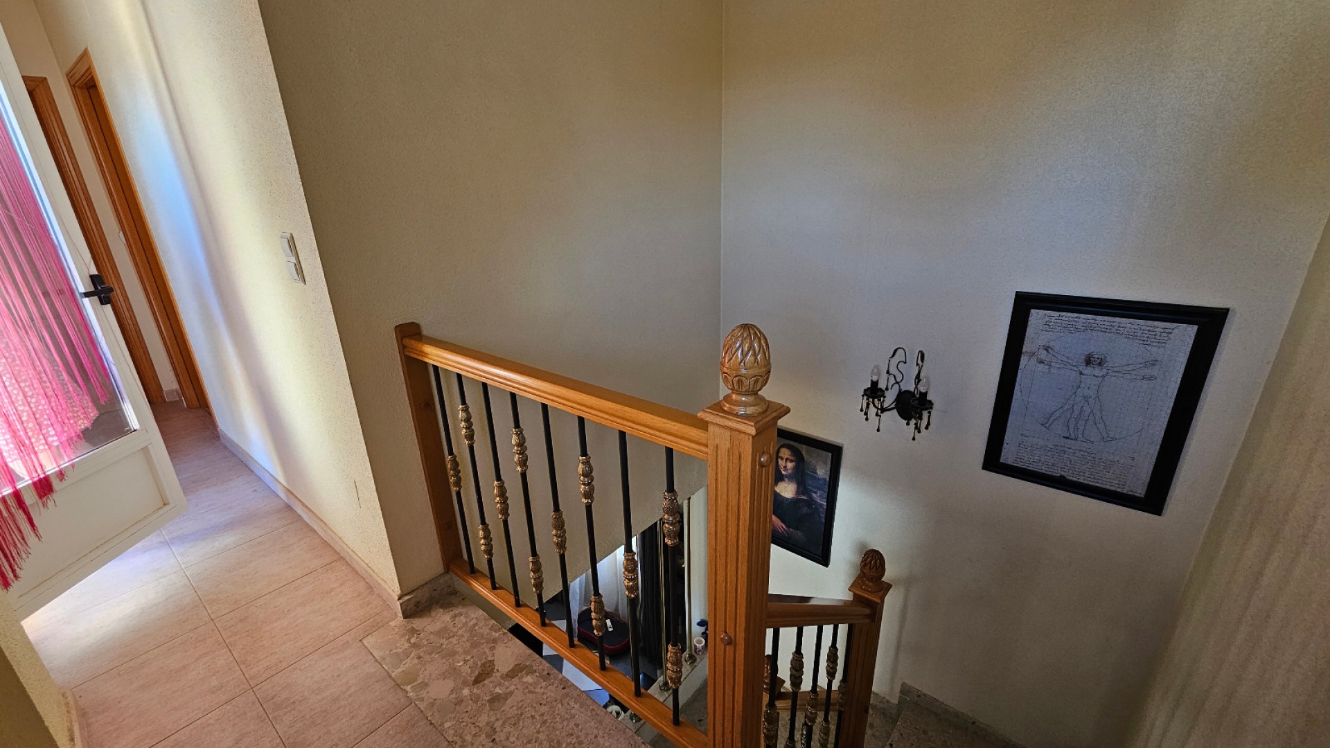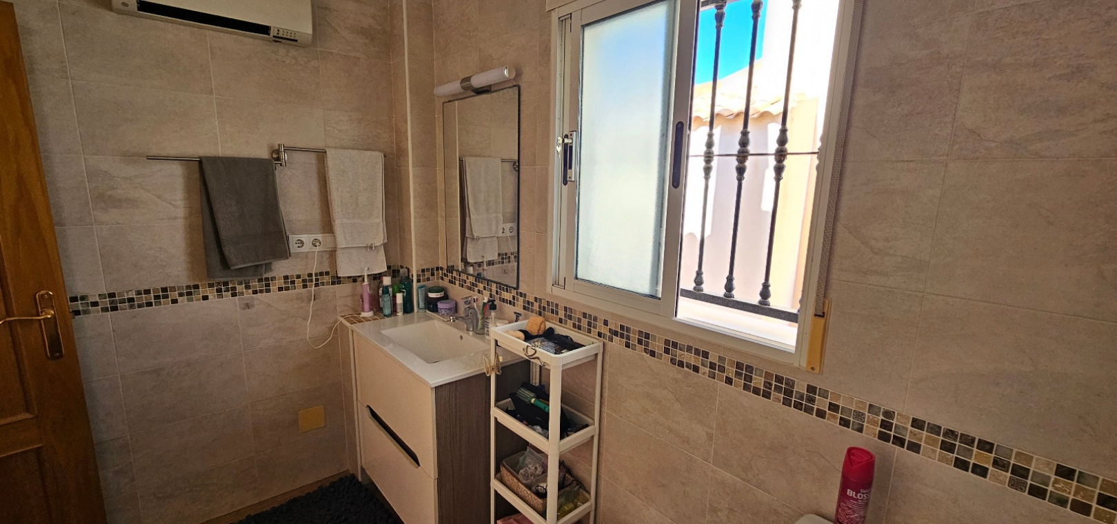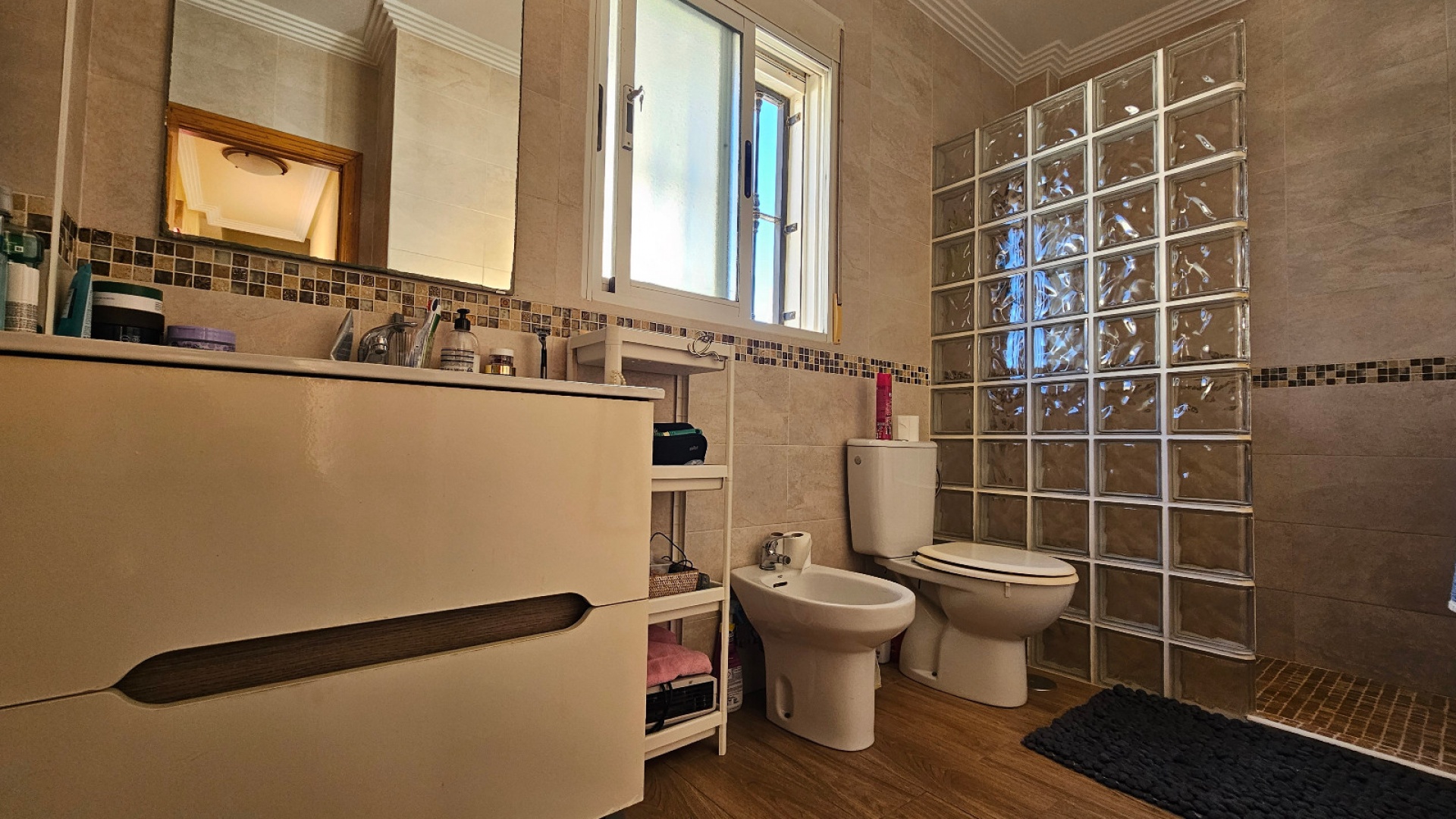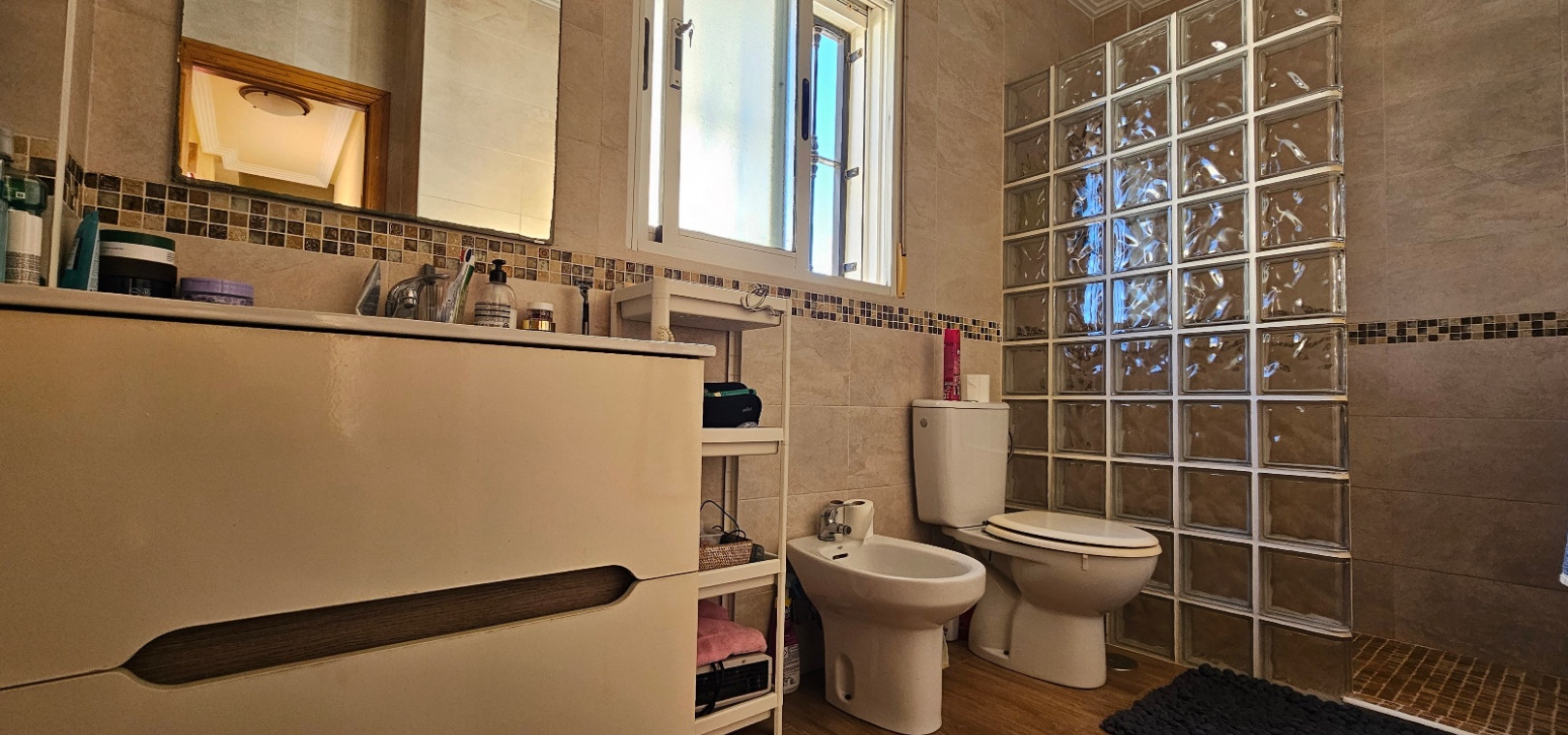 Auf der 1. Etage befinden sich 2 Doppelzimmer, beide mit Einbauschränken und Klimaanlage warm/kalt, 1 großes Familienbadezimmer und 1 großer sonniger Balkon mit Meerblick.