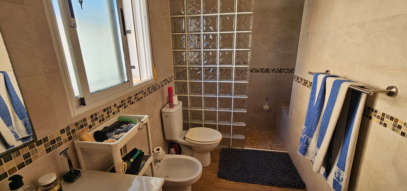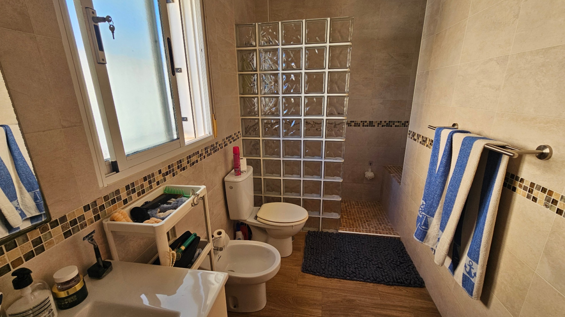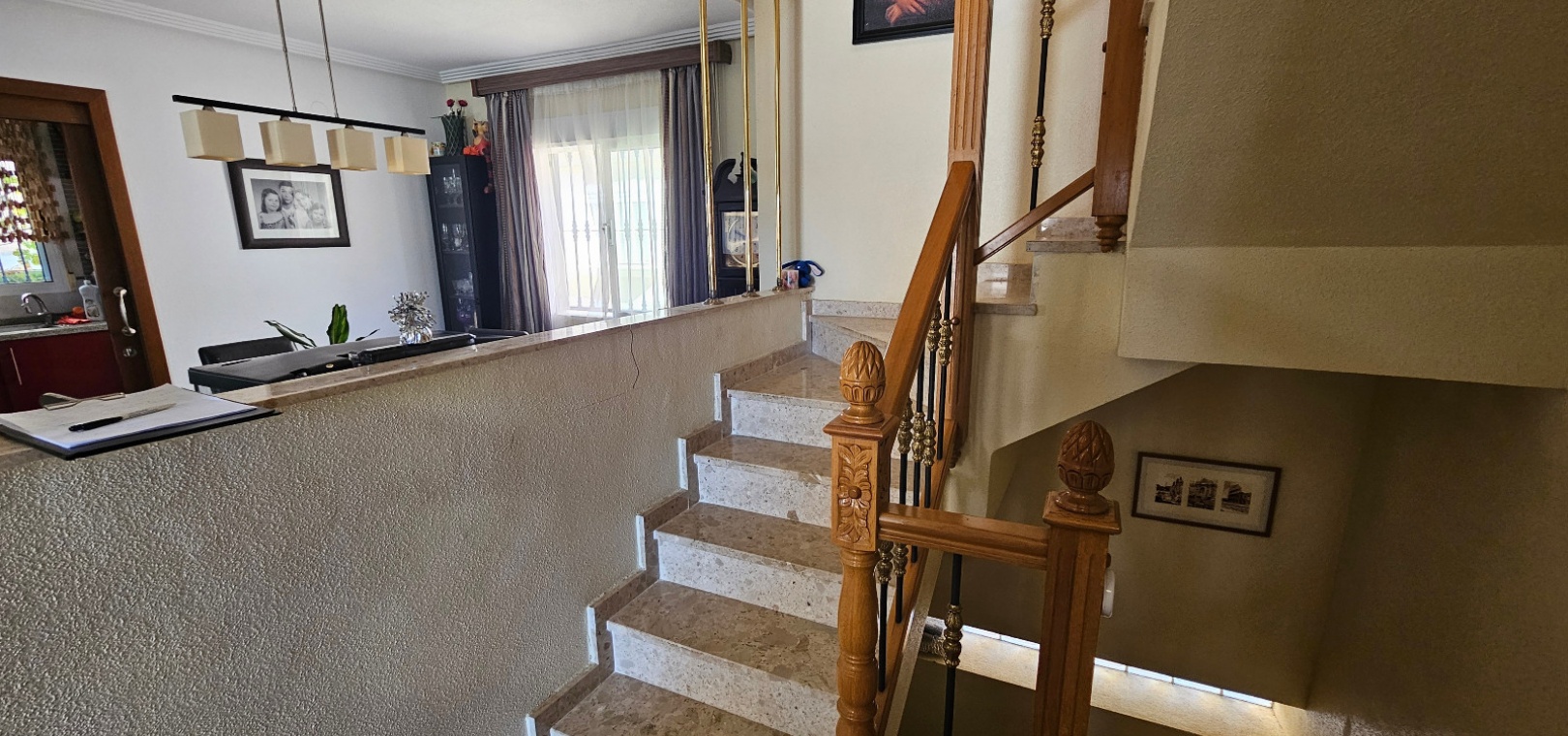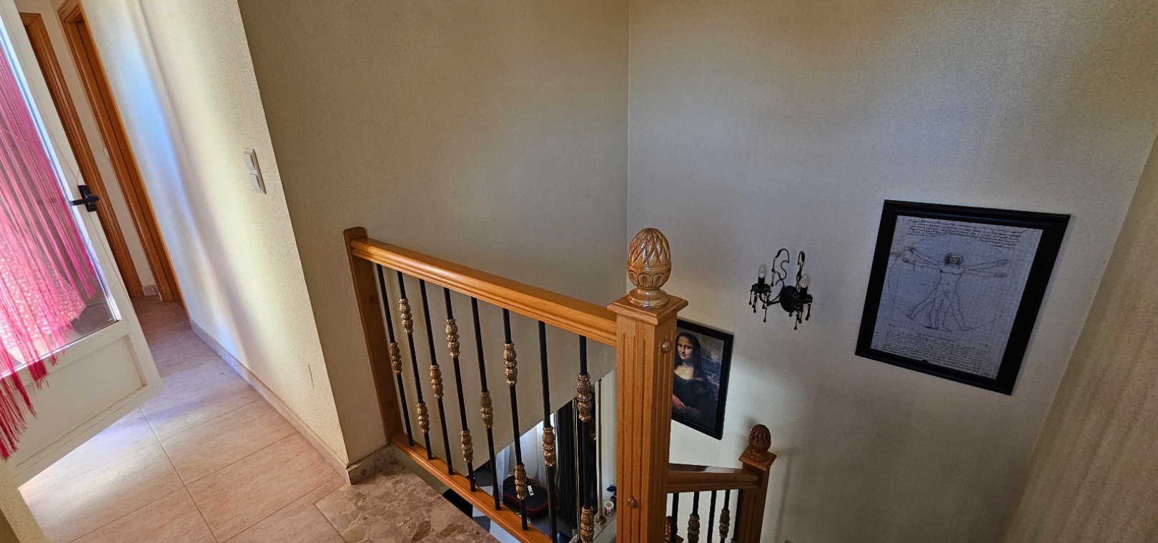 Auf der 1. Etage befinden sich 2 Doppelzimmer, beide mit Einbauschränken und Klimaanlage warm/kalt, 1 großes Familienbadezimmer und 1 großer sonniger Balkon mit Meerblick.