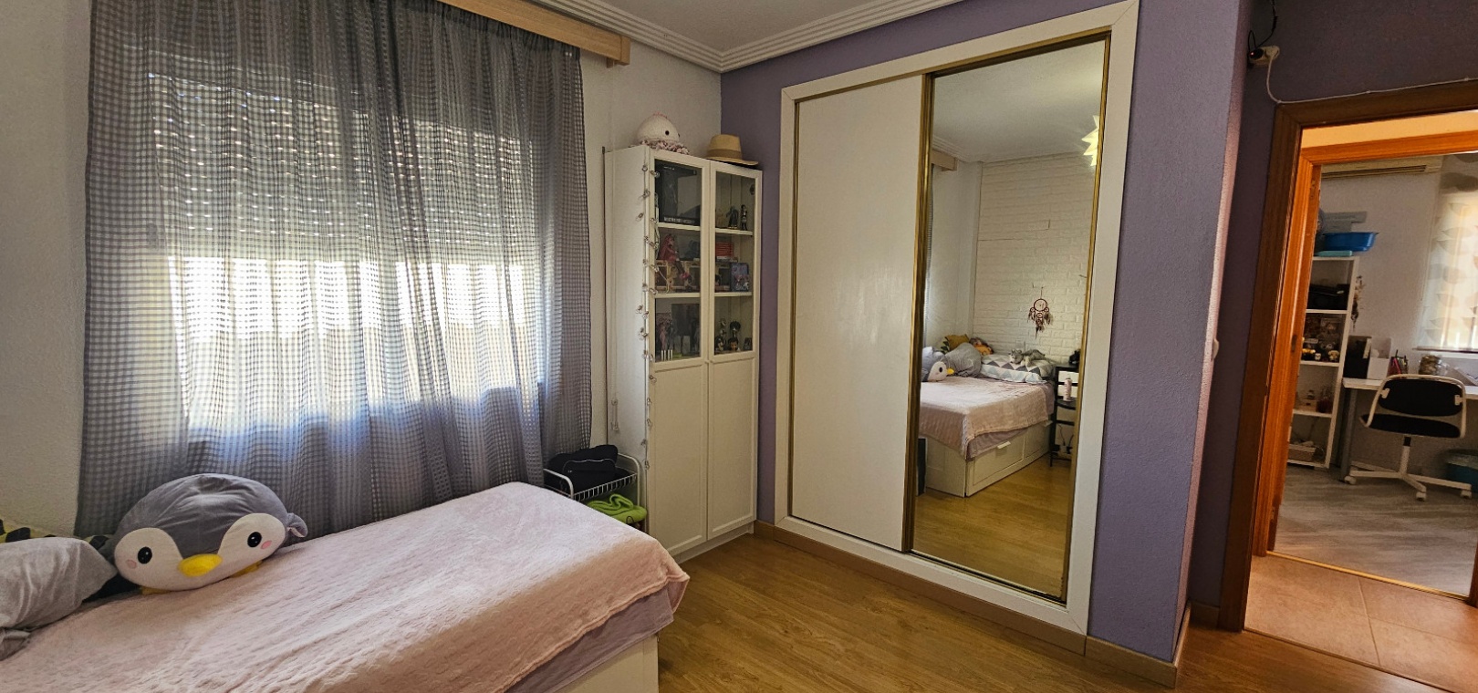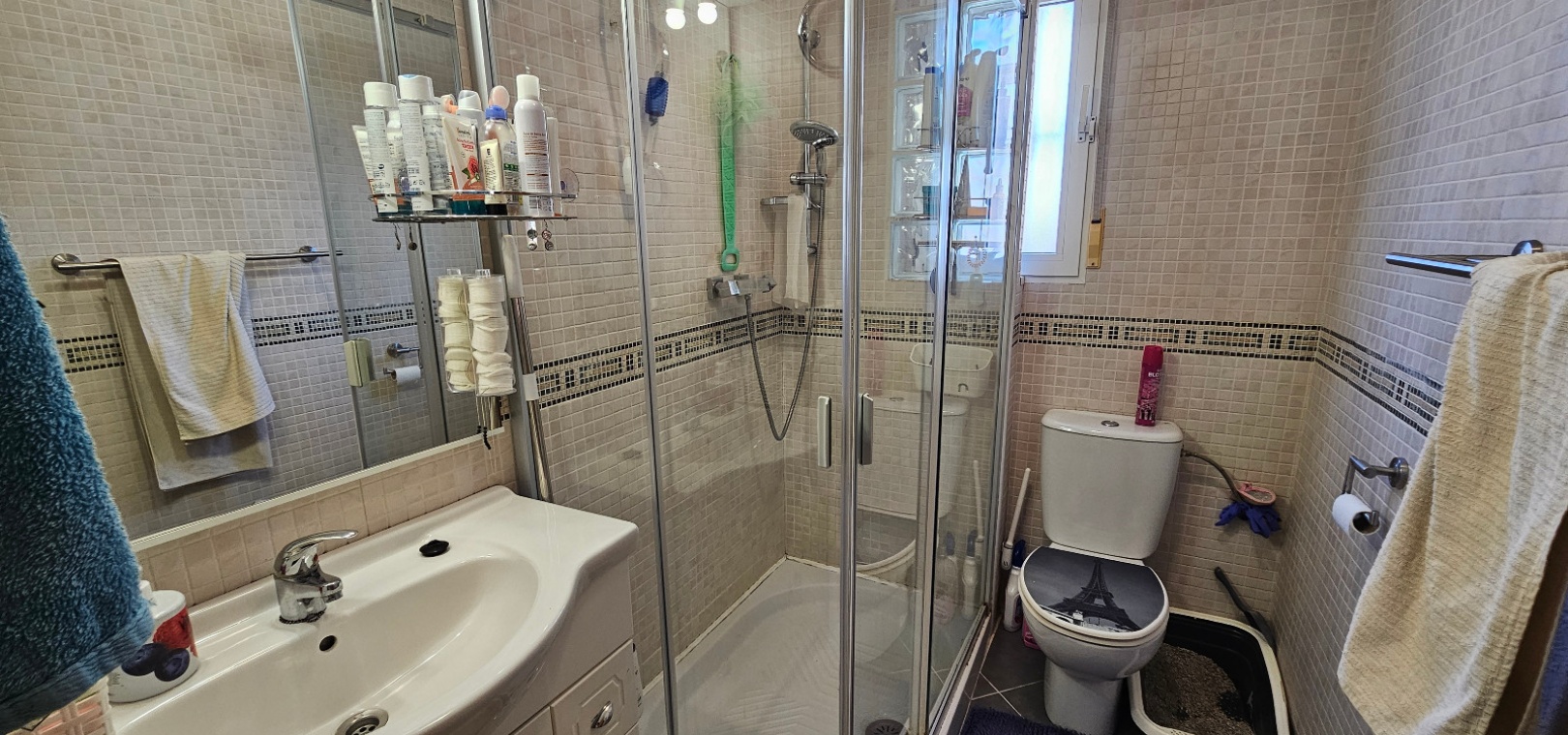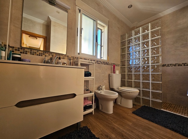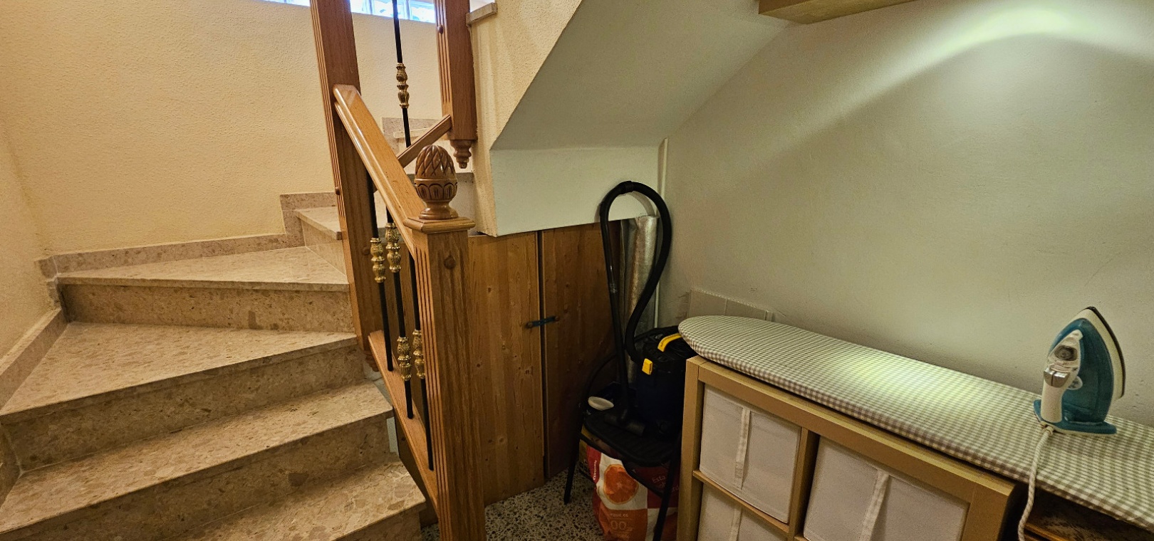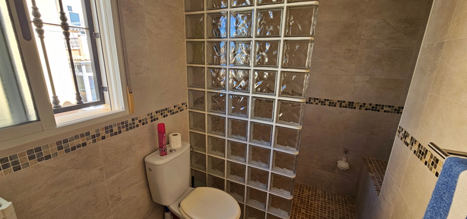 Auf der 1. Etage befinden sich 2 Doppelzimmer, beide mit Einbauschränken und Klimaanlage warm/kalt, 1 großes Familienbadezimmer und 1 großer sonniger Balkon mit Meerblick.