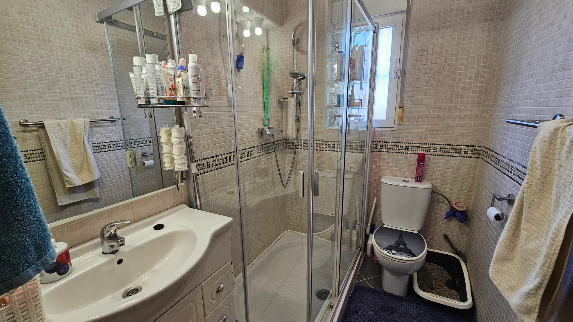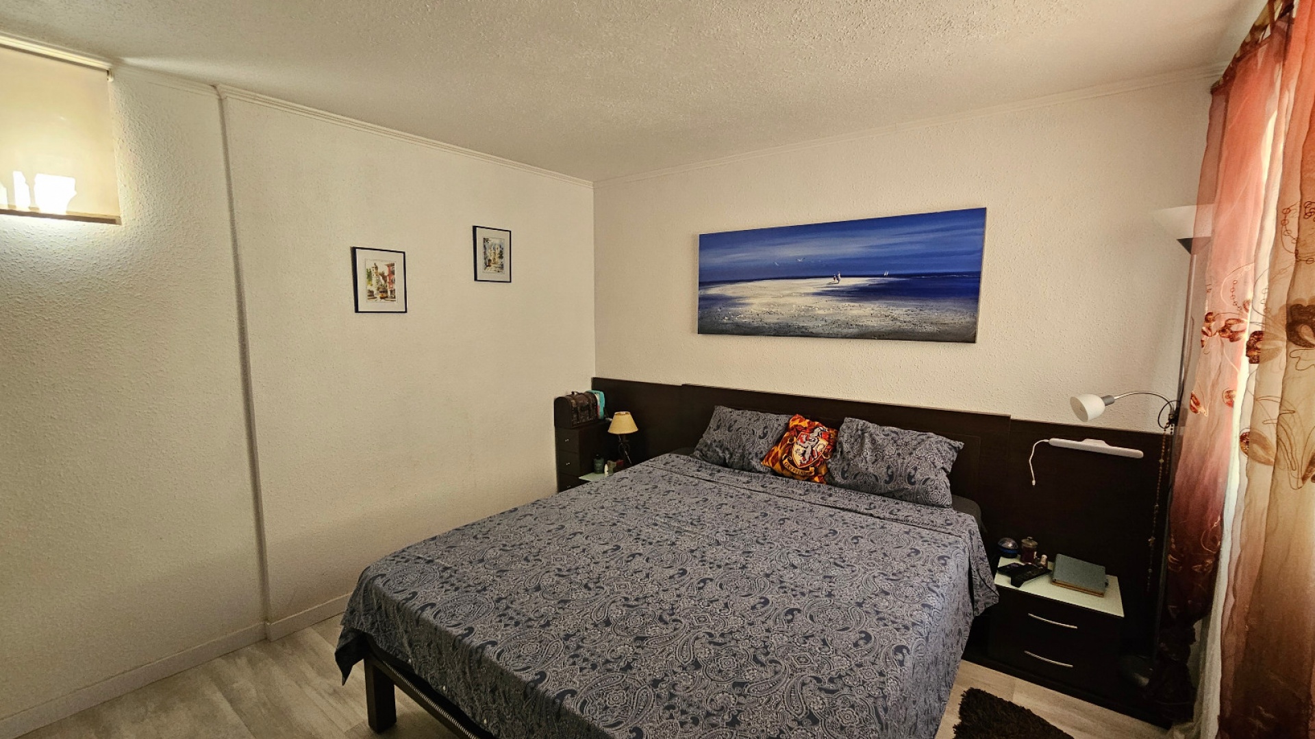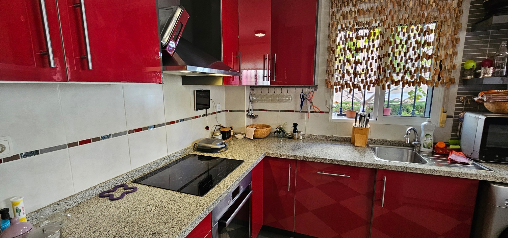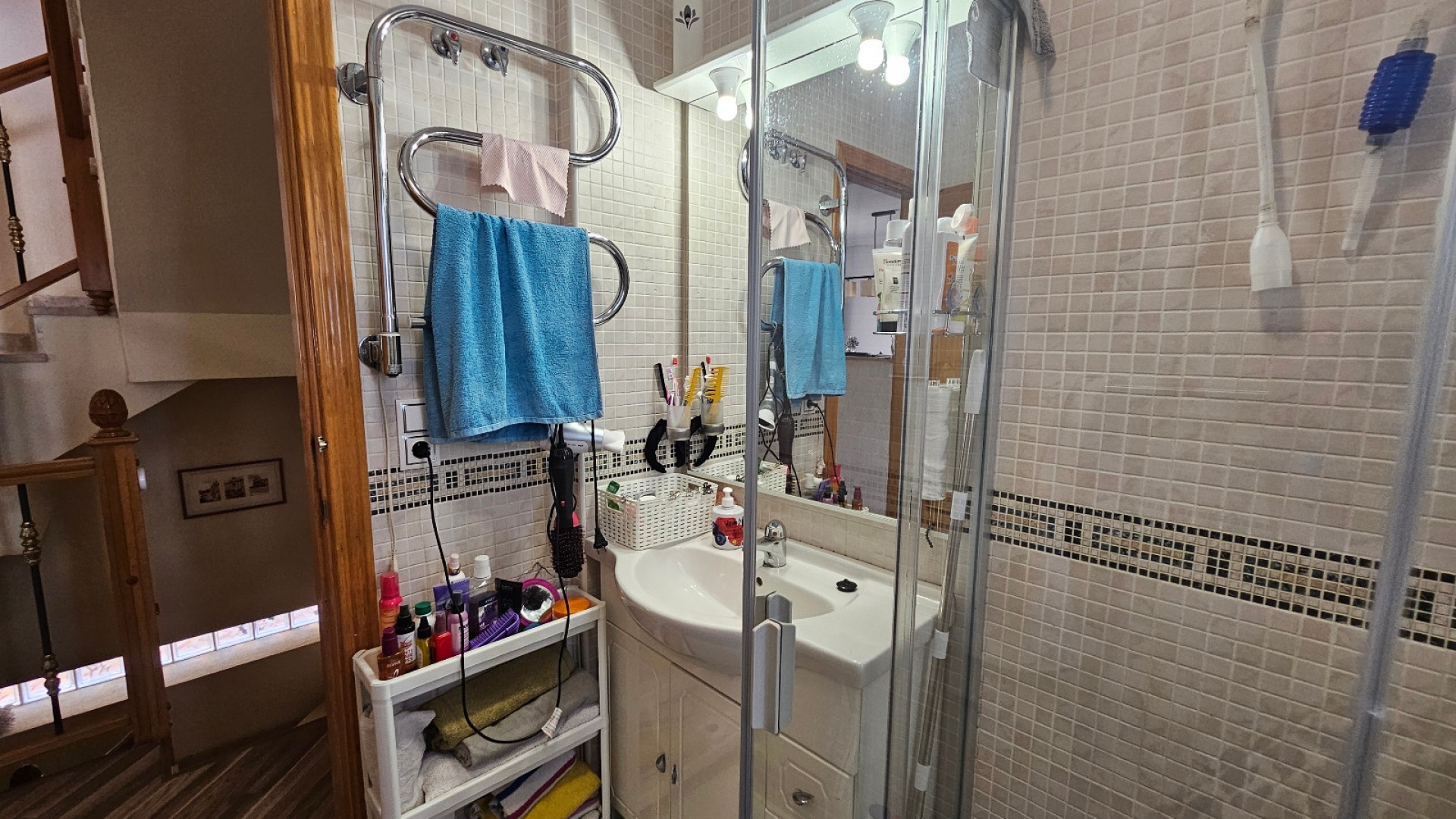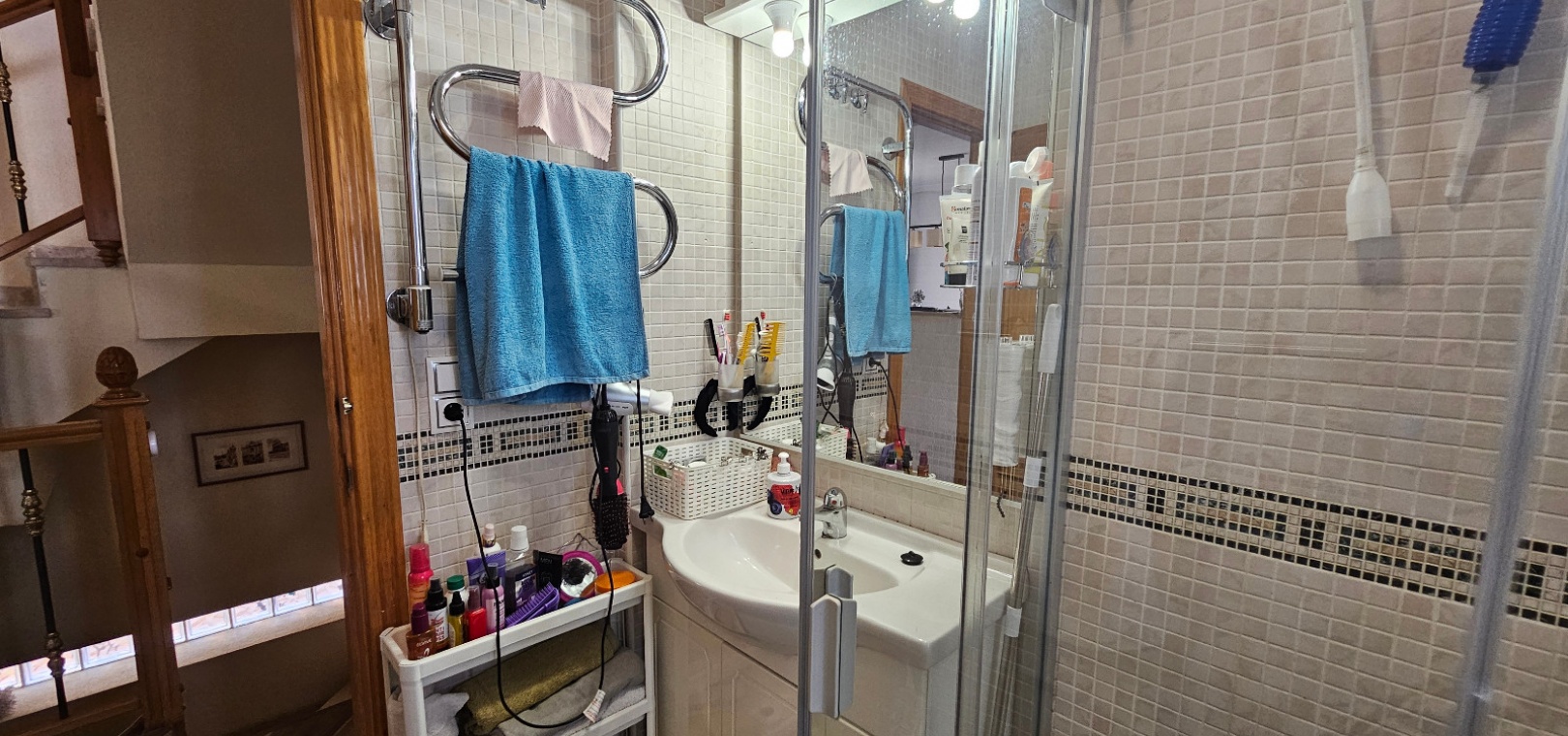 Auf der 1. Etage befinden sich 2 Doppelzimmer, beide mit Einbauschränken und Klimaanlage warm/kalt, 1 großes Familienbadezimmer und 1 großer sonniger Balkon mit Meerblick.